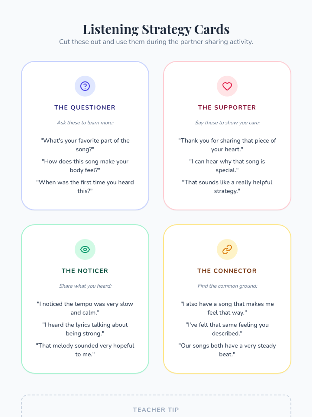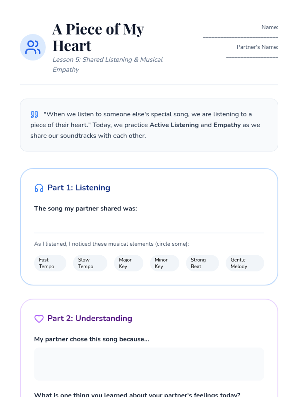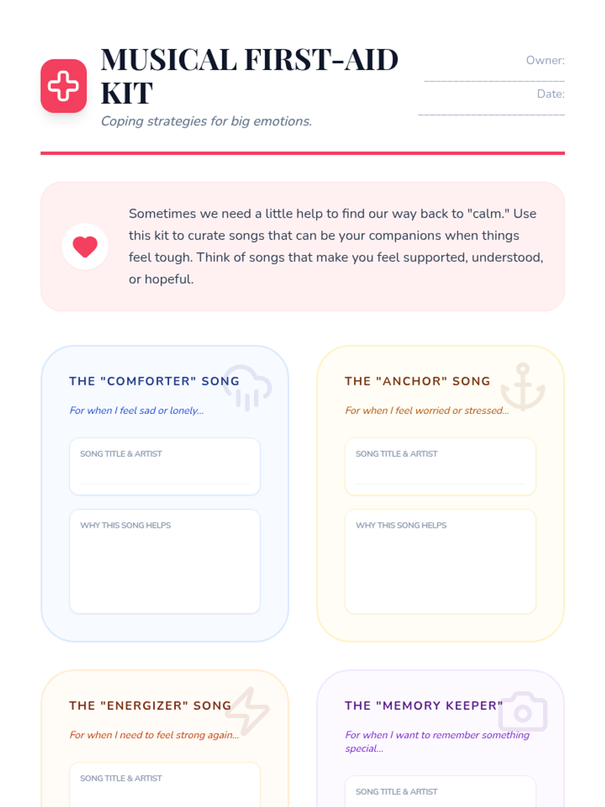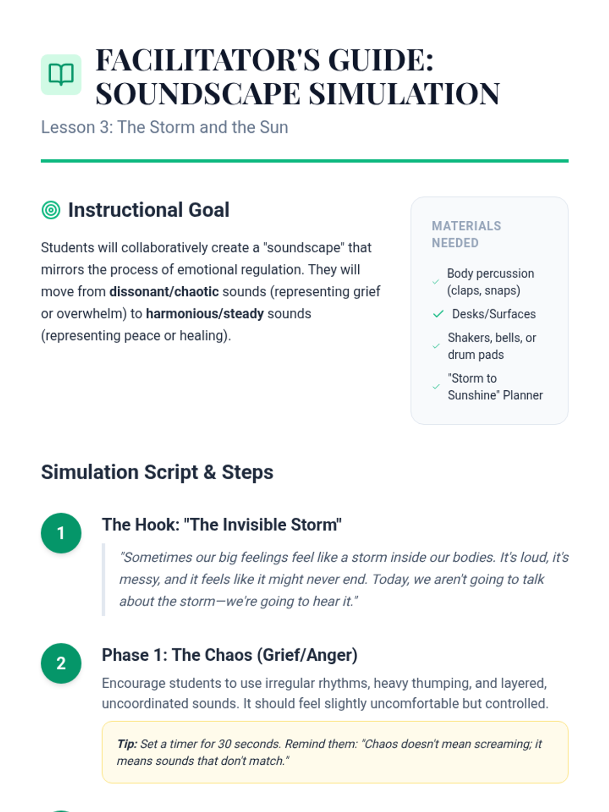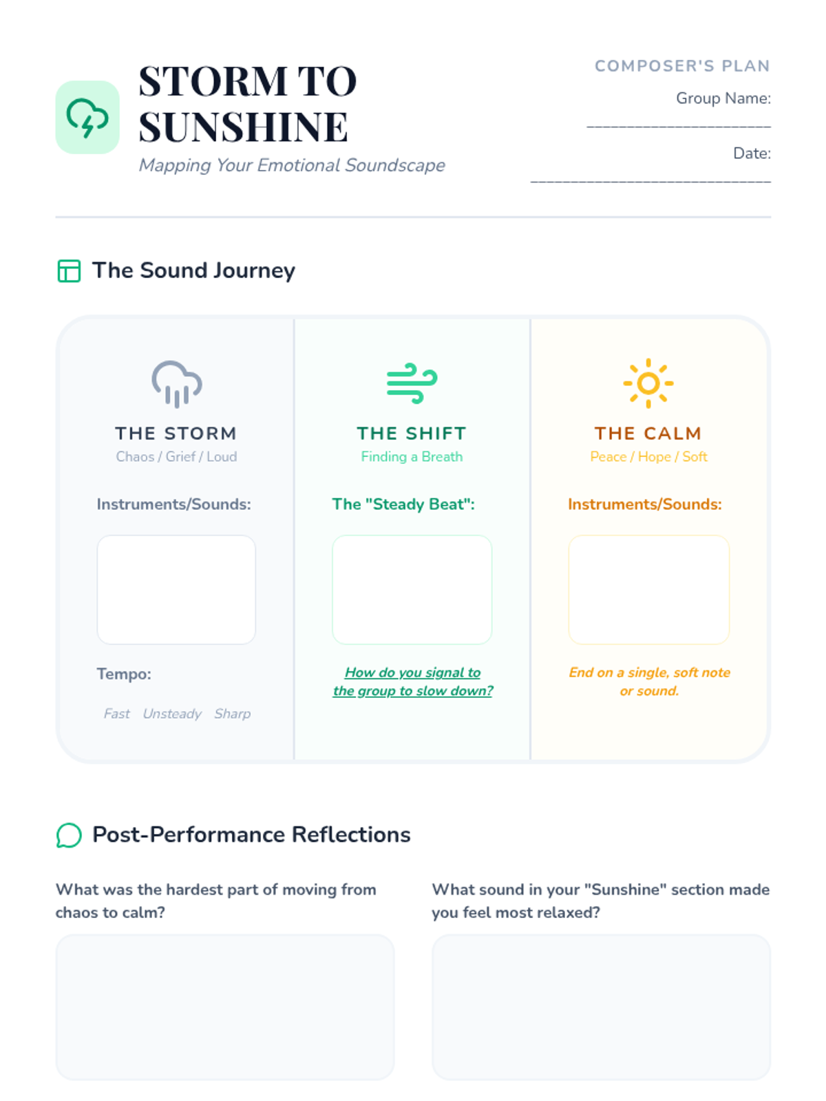 A 5th-grade counseling sequence exploring the intersection of music and emotion. Students analyze how sound affects mood, examine lyrics about loss and hope, compose their own emotional soundscapes, and curate a personal 'musical first-aid kit' for emotional regulation.