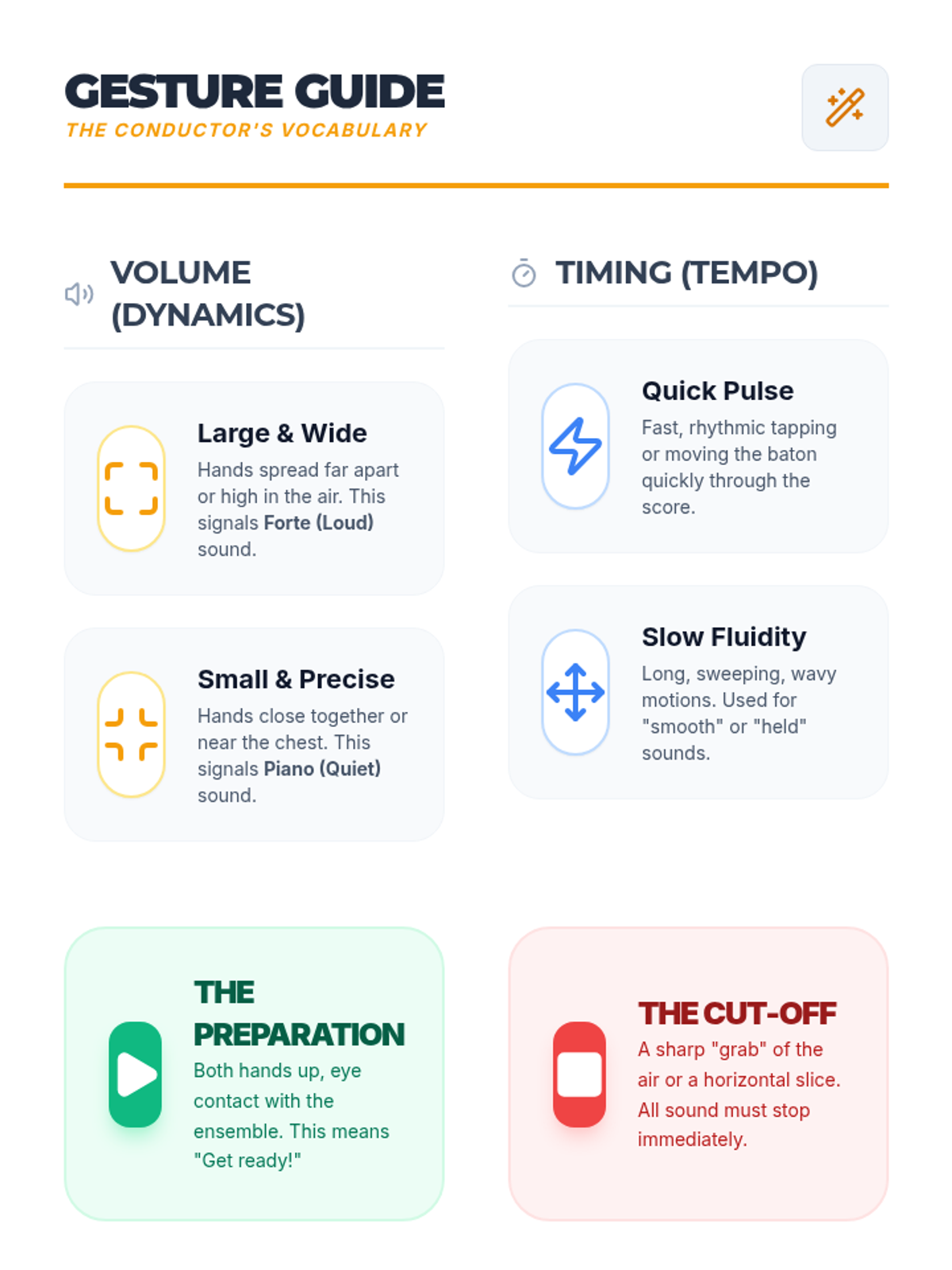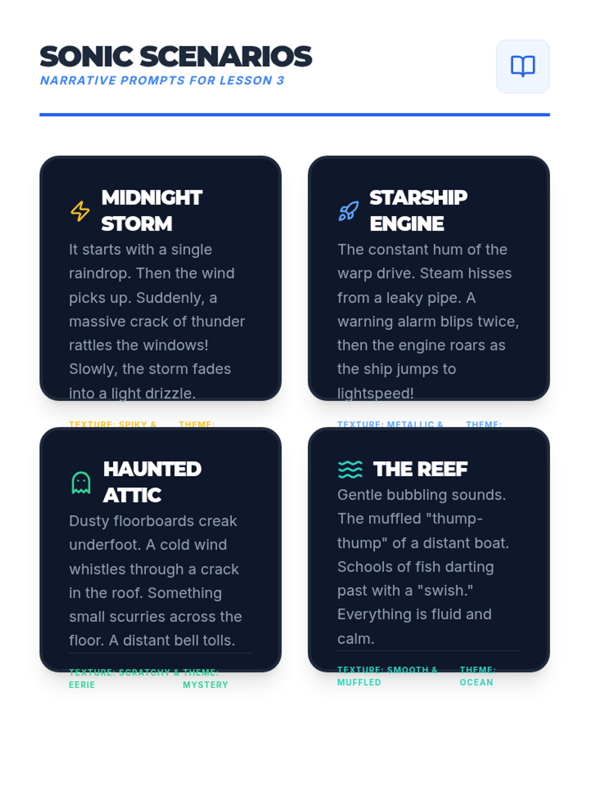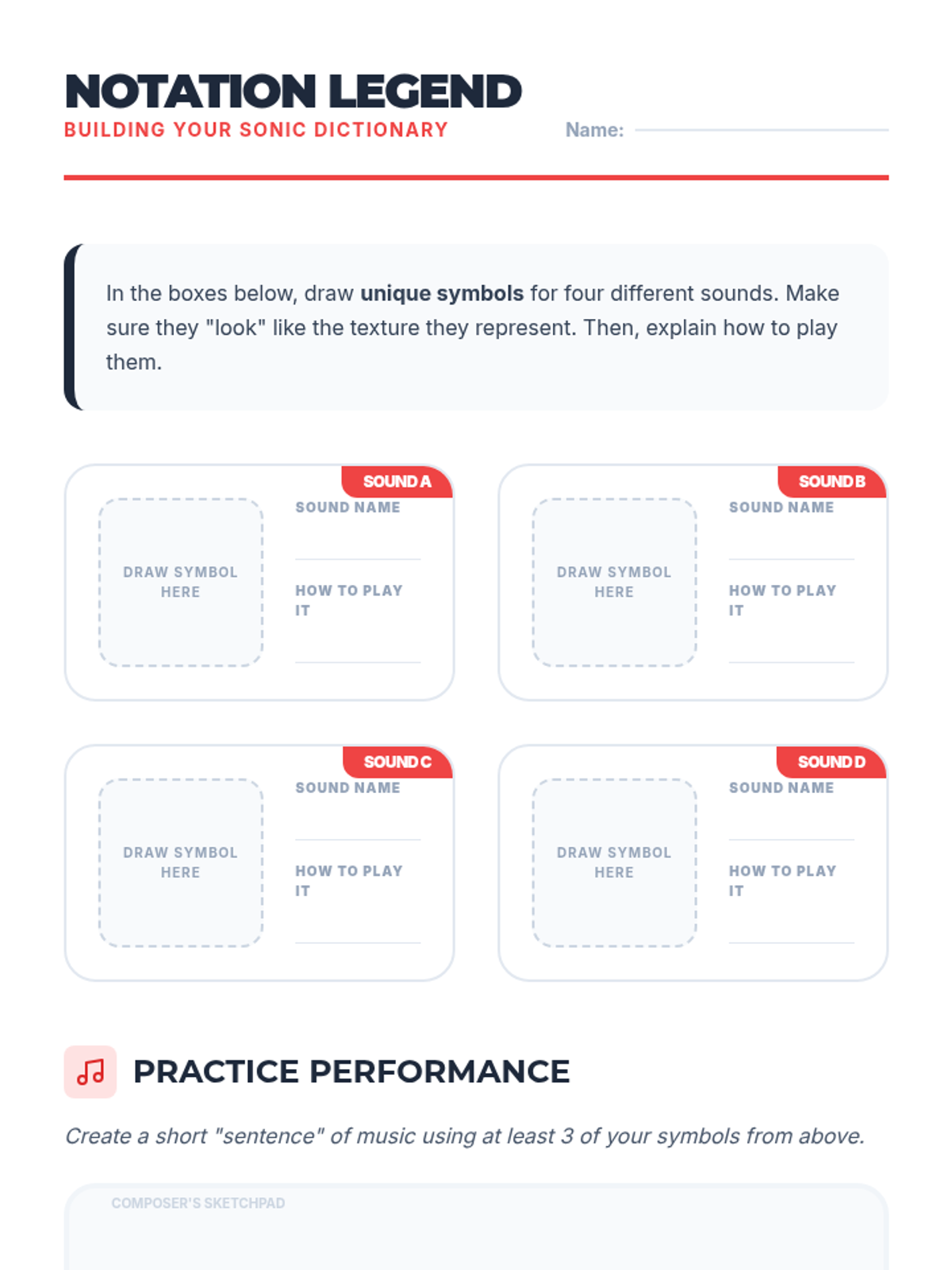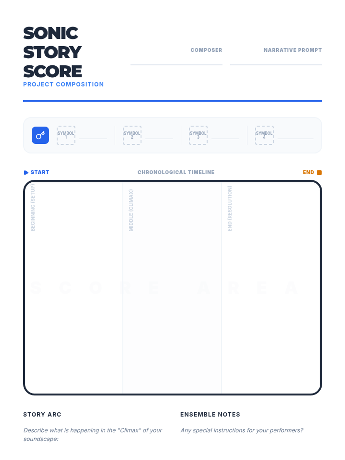 A 5-lesson journey into music composition using graphic notation. Students explore sound textures, invent visual symbols for audio, compose narrative soundscapes, and lead ensembles as conductors.