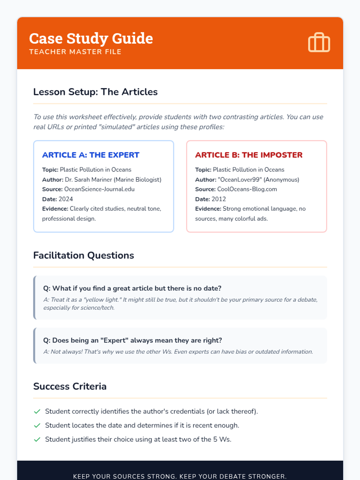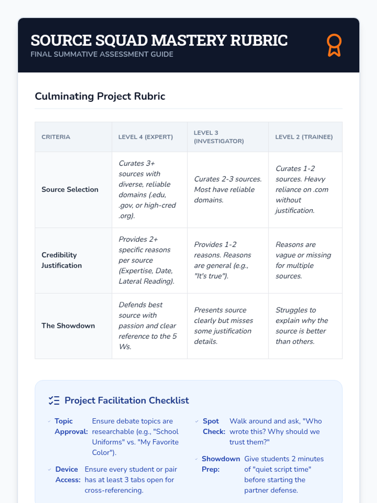 A 5-lesson sequence for 5th graders on evaluating digital source credibility, using a 'Web Detective' theme to teach URL analysis, the 5 Ws framework, lateral reading, and identifying sponsored content.