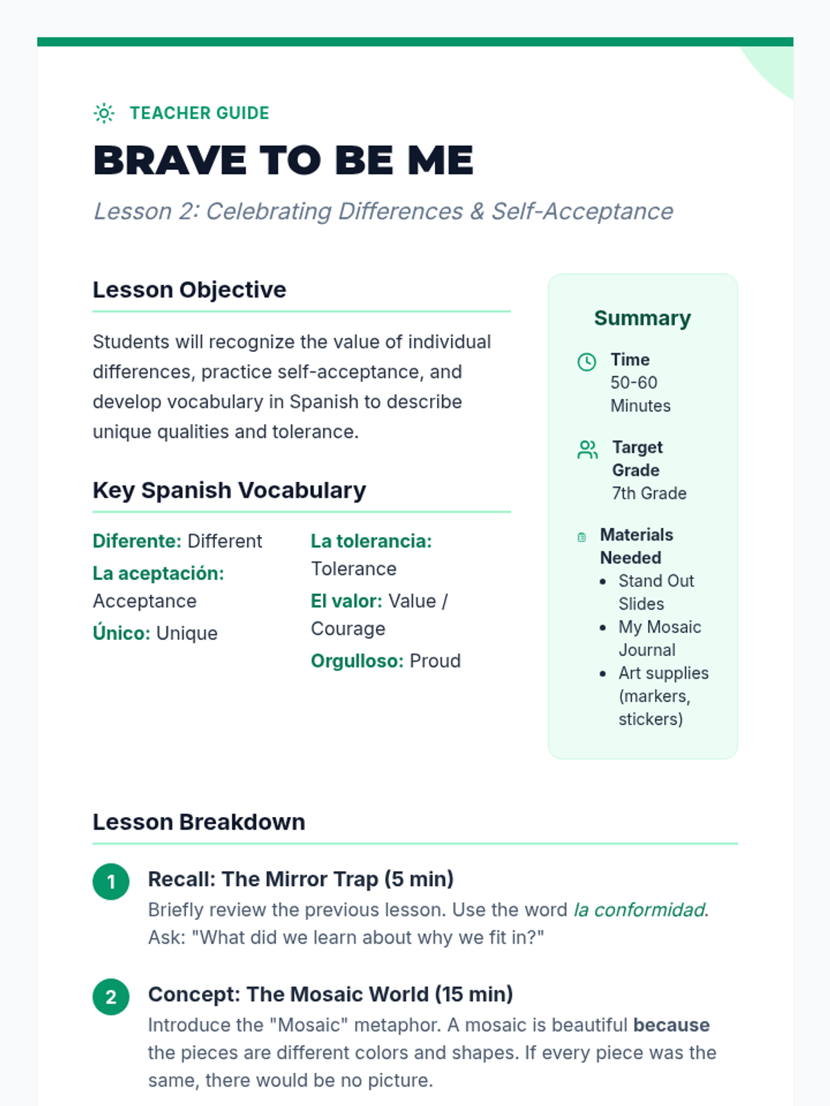 A two-lesson curriculum for middle schoolers exploring the concepts of conformity and the beauty of individual differences, integrating Spanish vocabulary to build self-acceptance and tolerance.