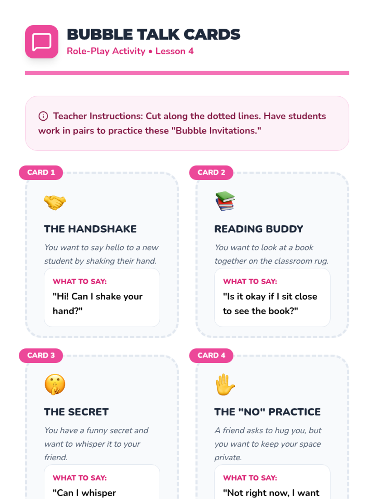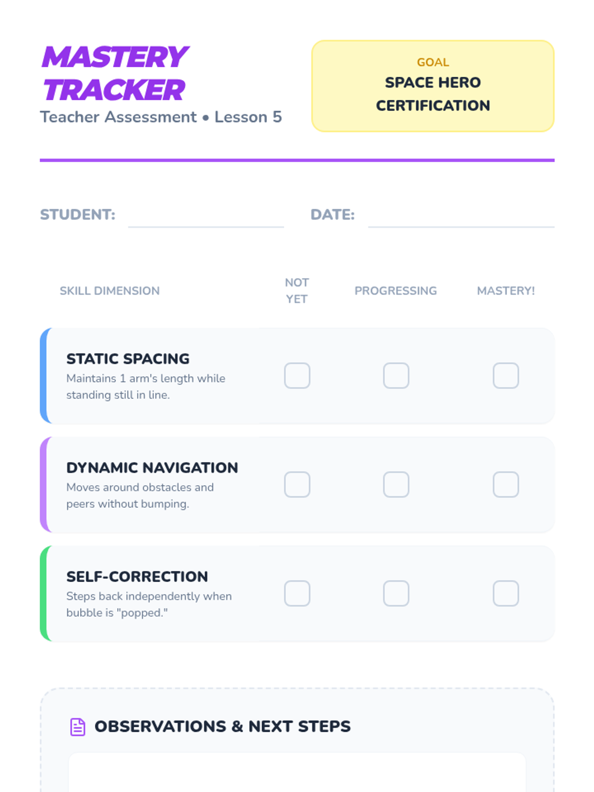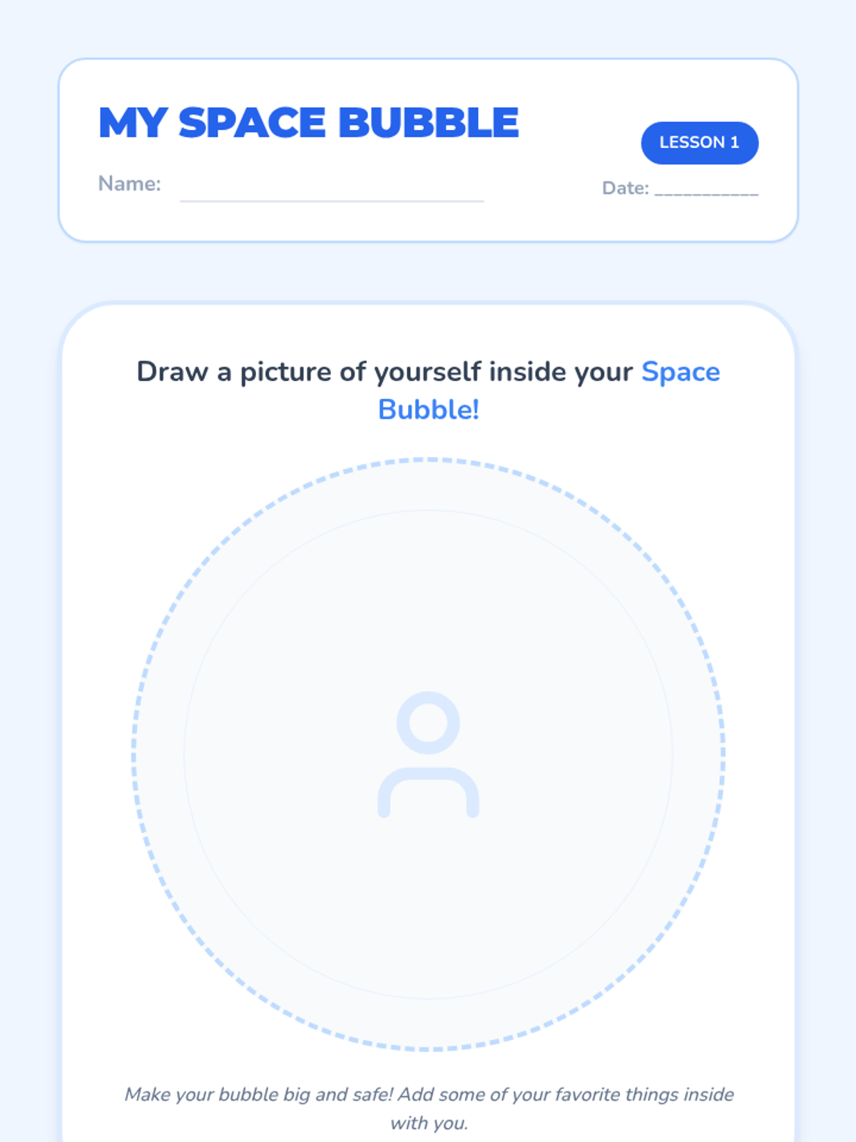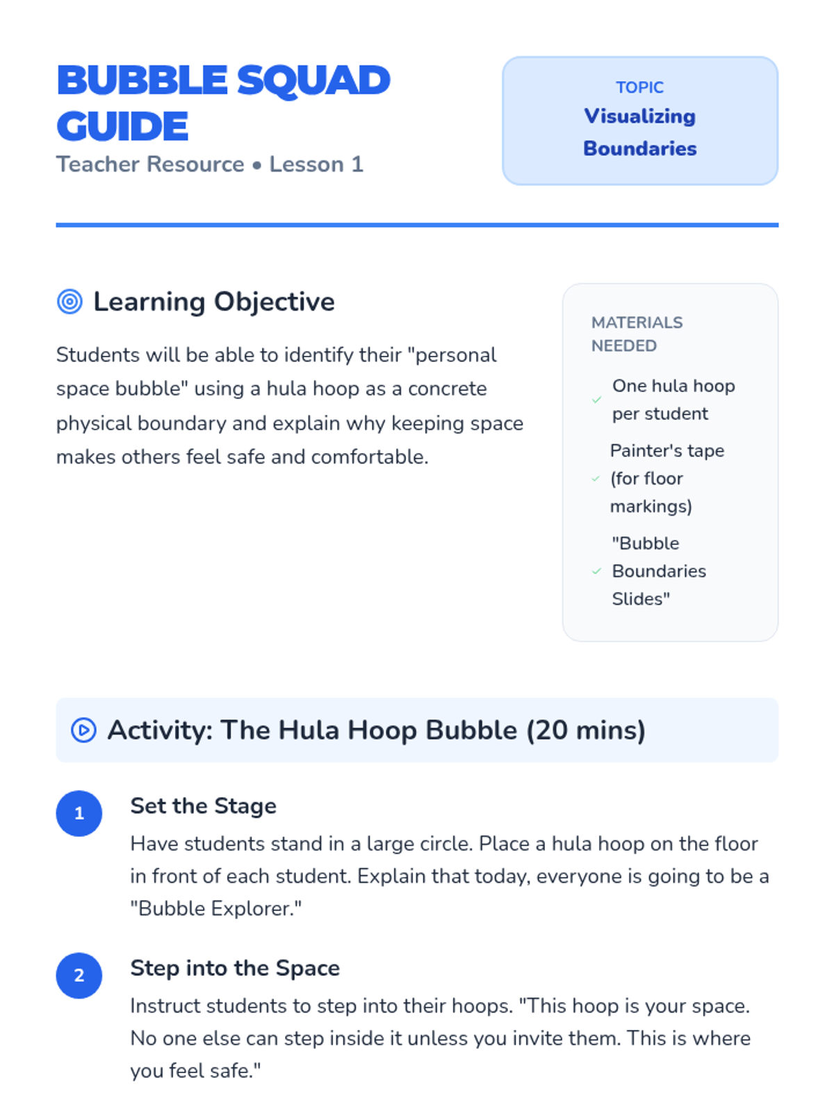 A 5-lesson sequence for 1st-grade students focusing on social communication and physical boundaries. Students learn to visualize, measure, and maintain personal space using the 'space bubble' metaphor through games, role-play, and kinesthetic activities.