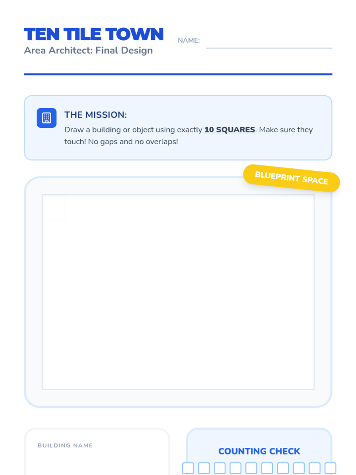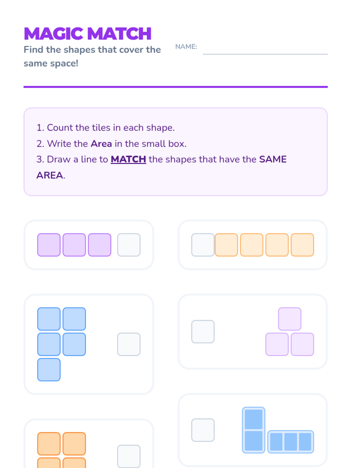A Kindergarten geometry sequence exploring area through direct comparison, tiling with non-standard units, and counting units to quantify space. Students learn to cover regions without gaps or overlaps and discover that area is conserved across different shapes.