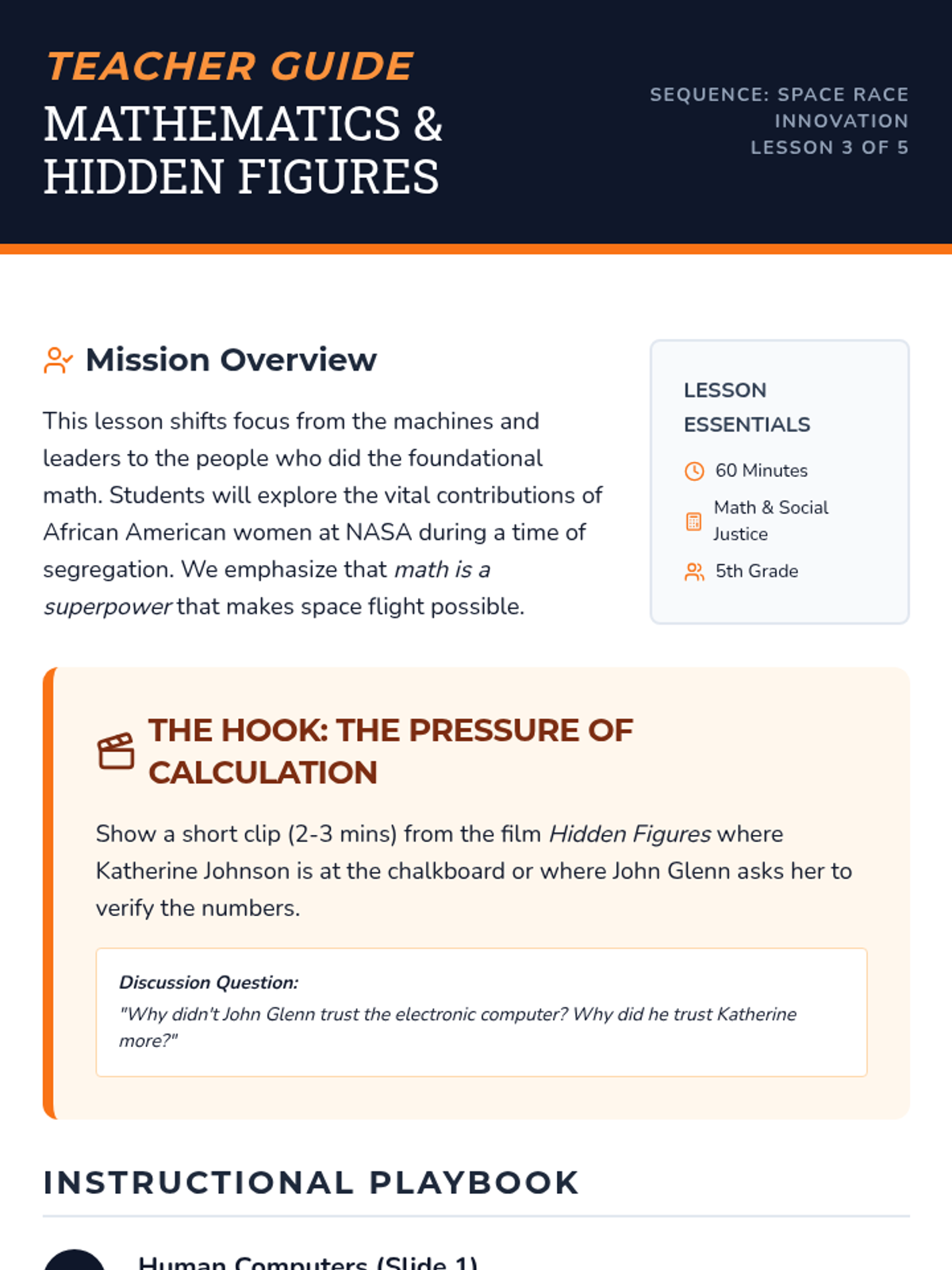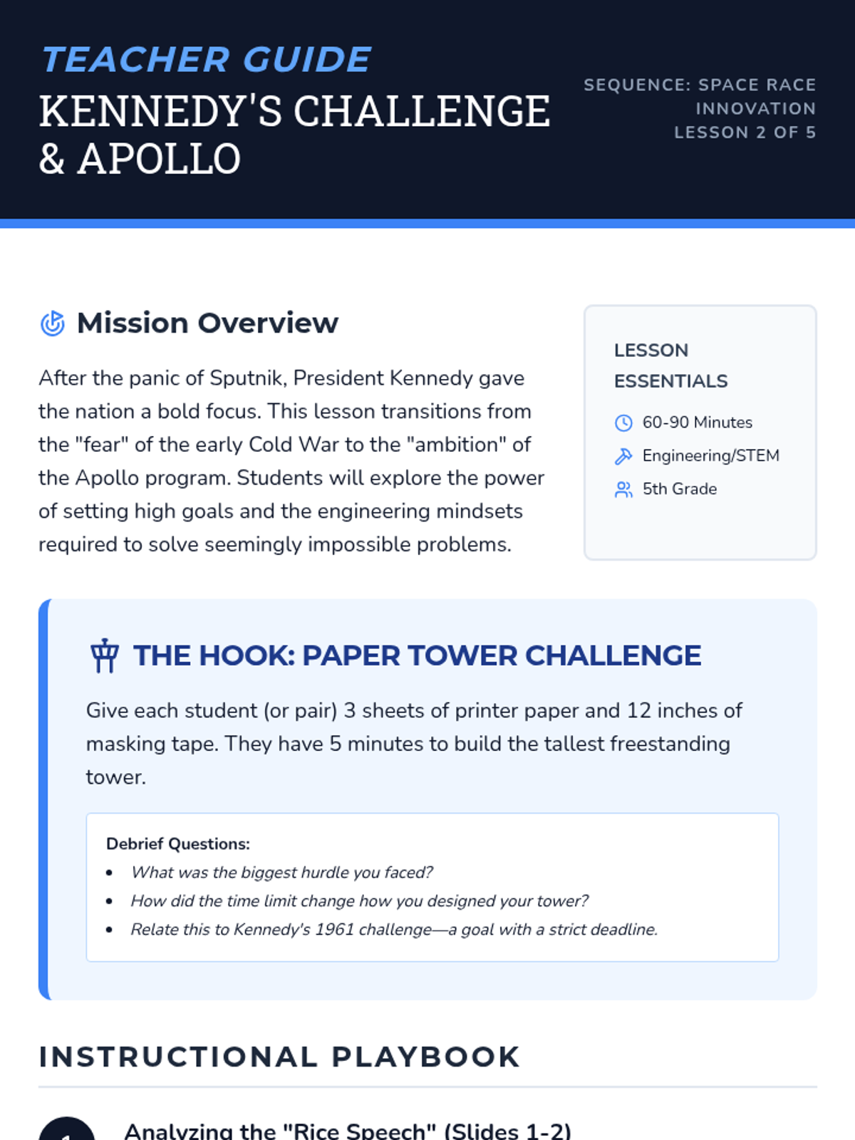 Students explore the technological competition between the US and USSR during the Space Race, focusing on how political tension drove scientific innovation and national identity. The sequence covers the Cold War context, JFK's ambitious goals, the vital contributions of 'Hidden Figures,' the Apollo 11 mission, and the modern legacy of space technology.