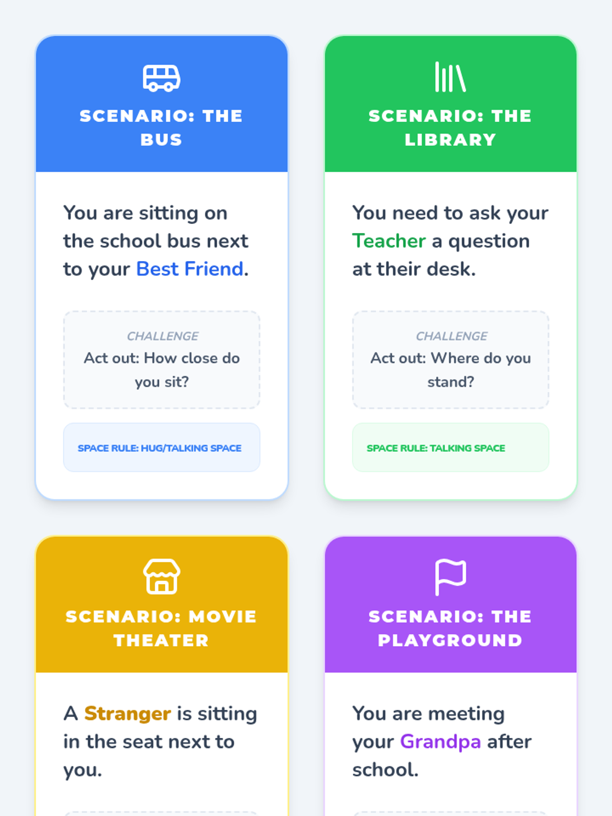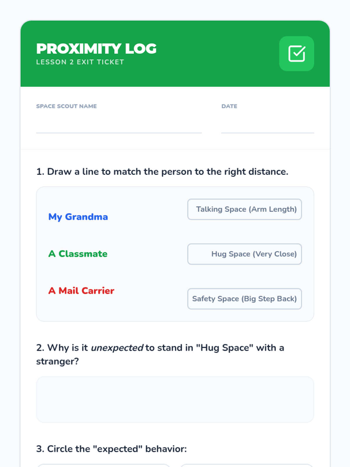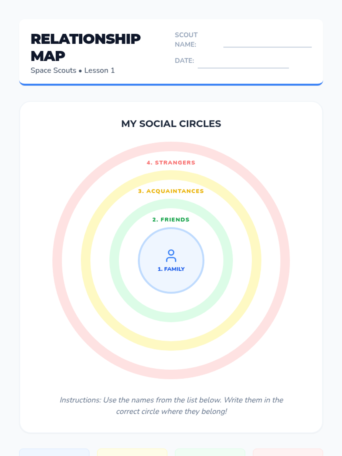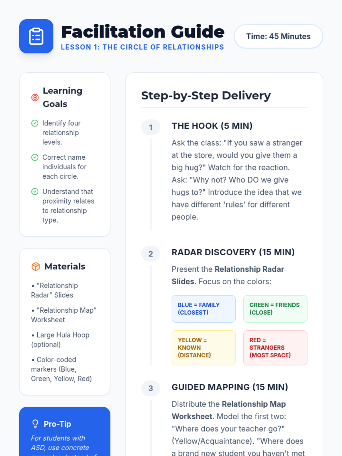A 5-lesson sequence designed for 4th-grade students in social communication programs. It focuses on understanding personal space and touch boundaries based on relationship circles (Family, Friends, Acquaintances, Strangers), helping students navigate social proximity with confidence and safety.