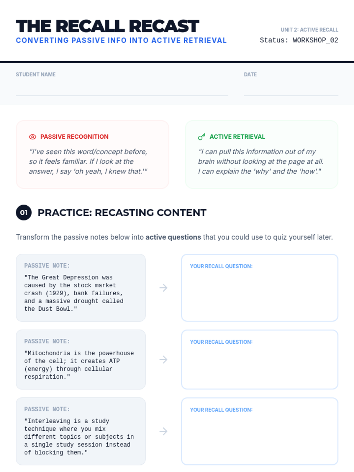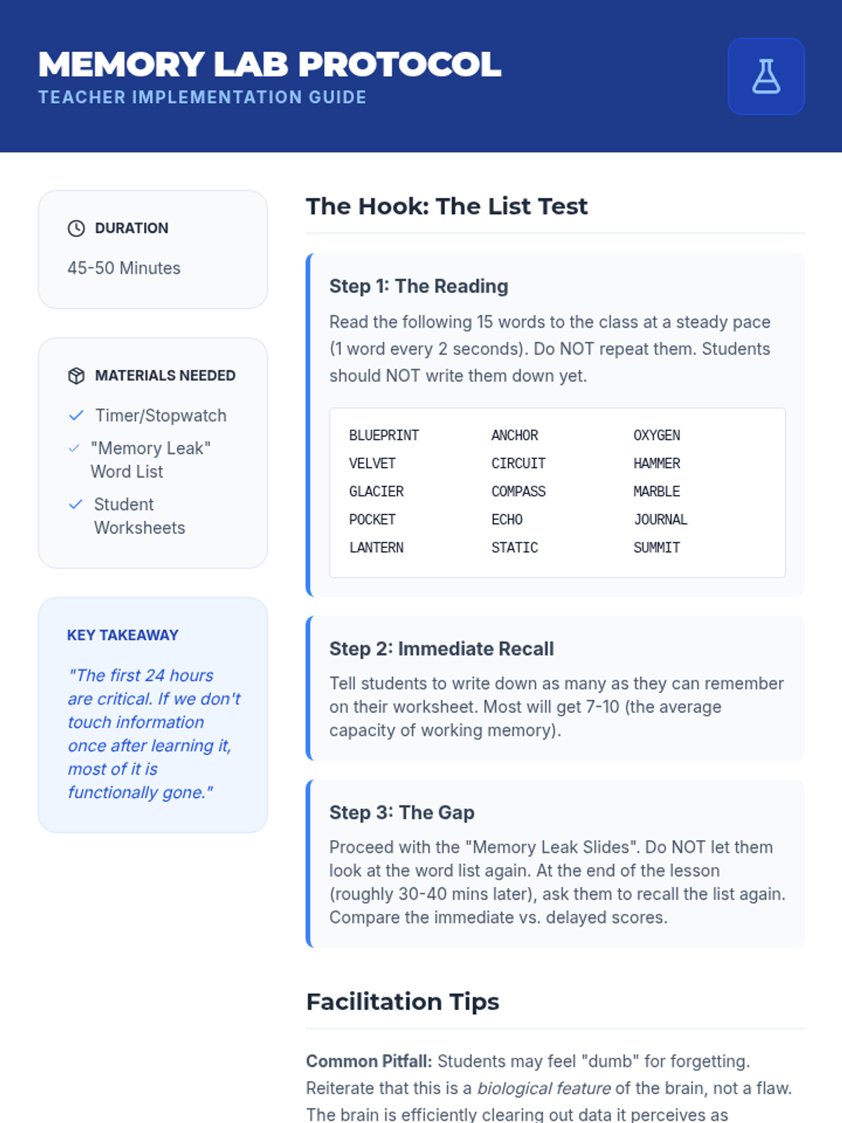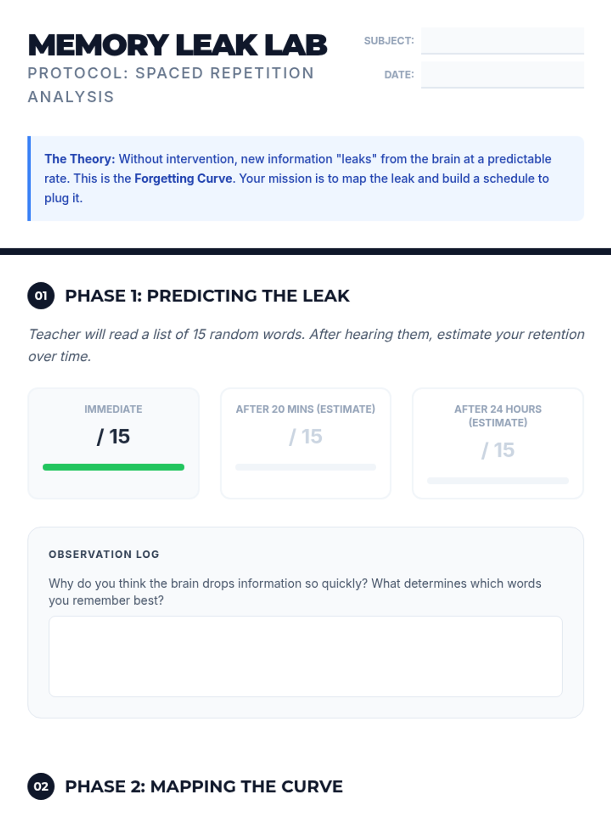 A comprehensive sequence for 11th-grade students focused on evidence-based memory techniques. Students move from understanding the biology of forgetting to implementing sophisticated systems like spaced repetition, the Leitner Box, and interleaving to ensure long-term retention of academic material.