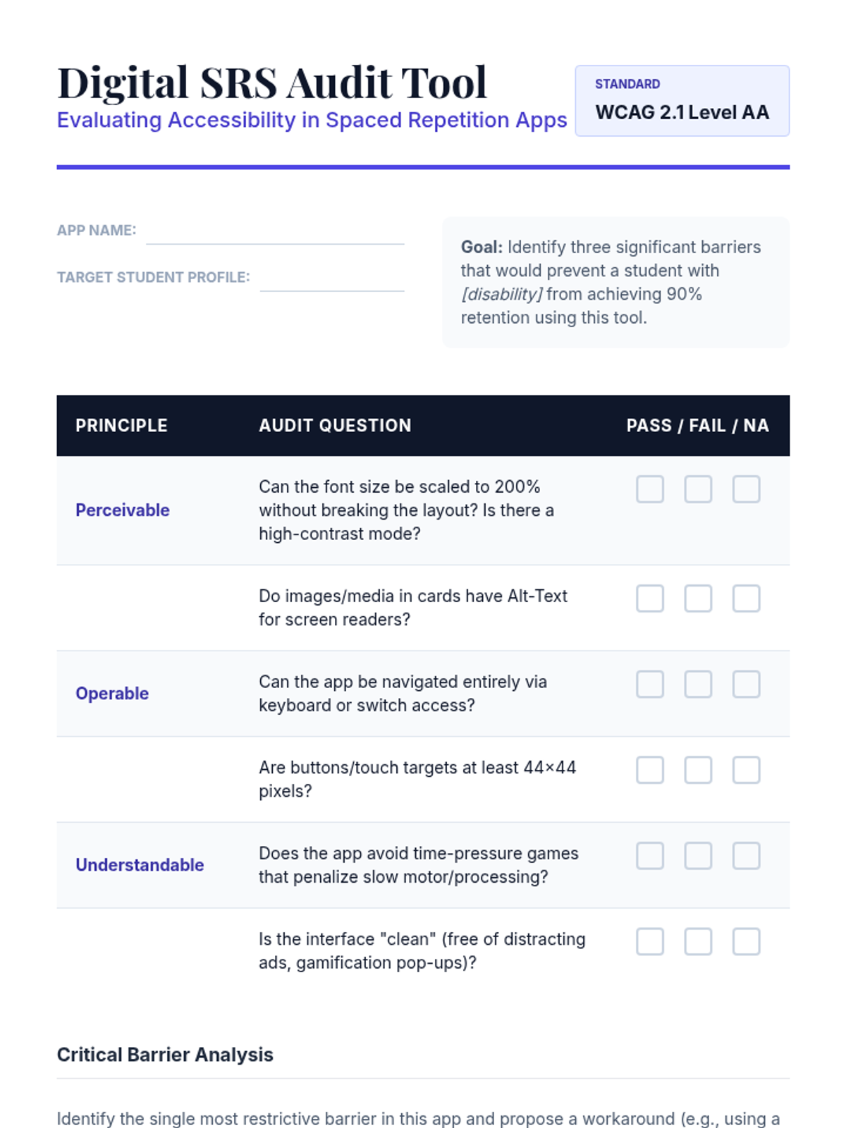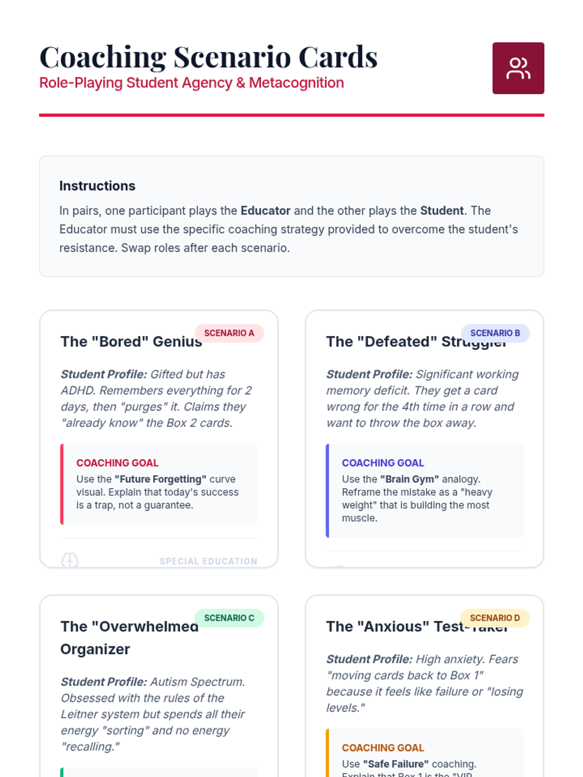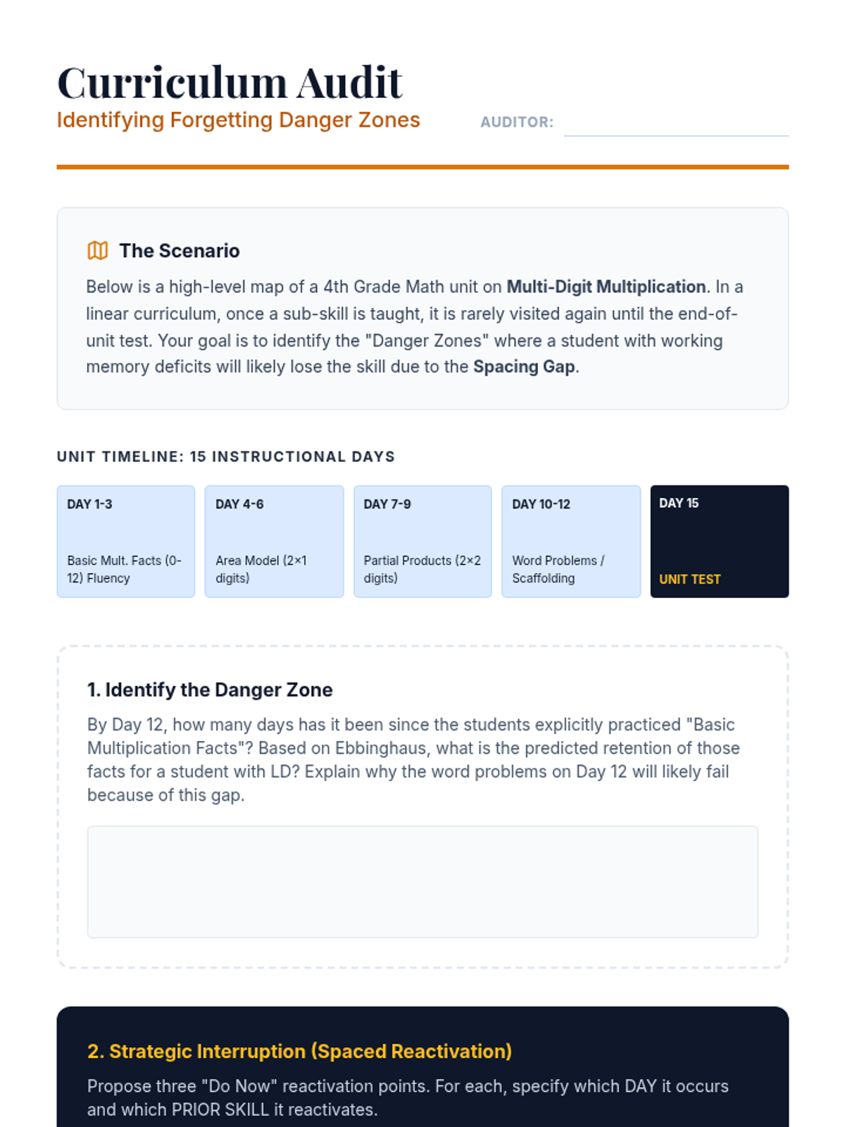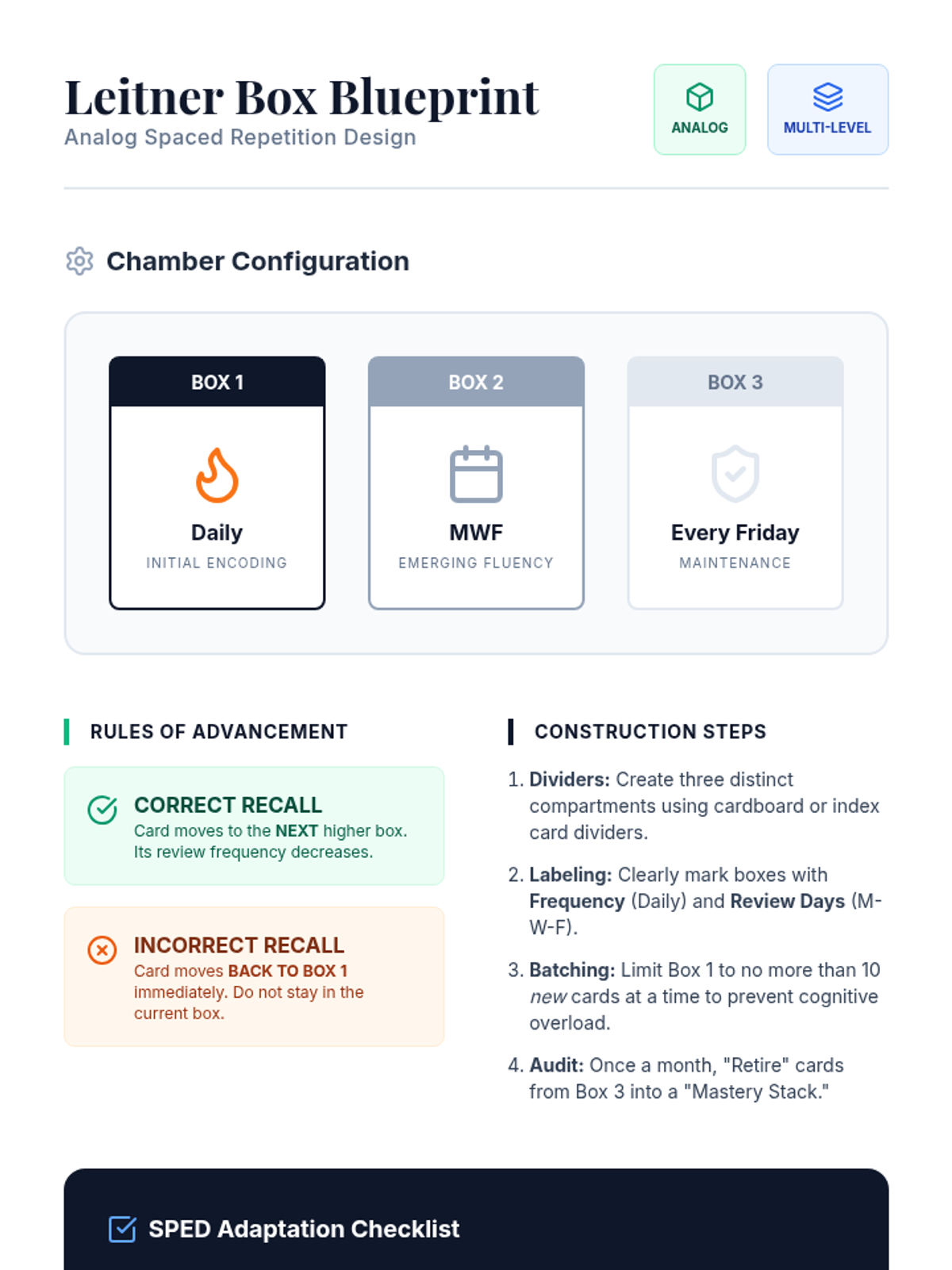 This undergraduate-level sequence explores the cognitive science and practical implementation of spaced repetition systems (SRS) in special education contexts. Pre-service teachers will learn to design analog and digital memory supports tailored to students with working memory deficits and learning disabilities, ultimately creating integrated retention strategies for the core curriculum.