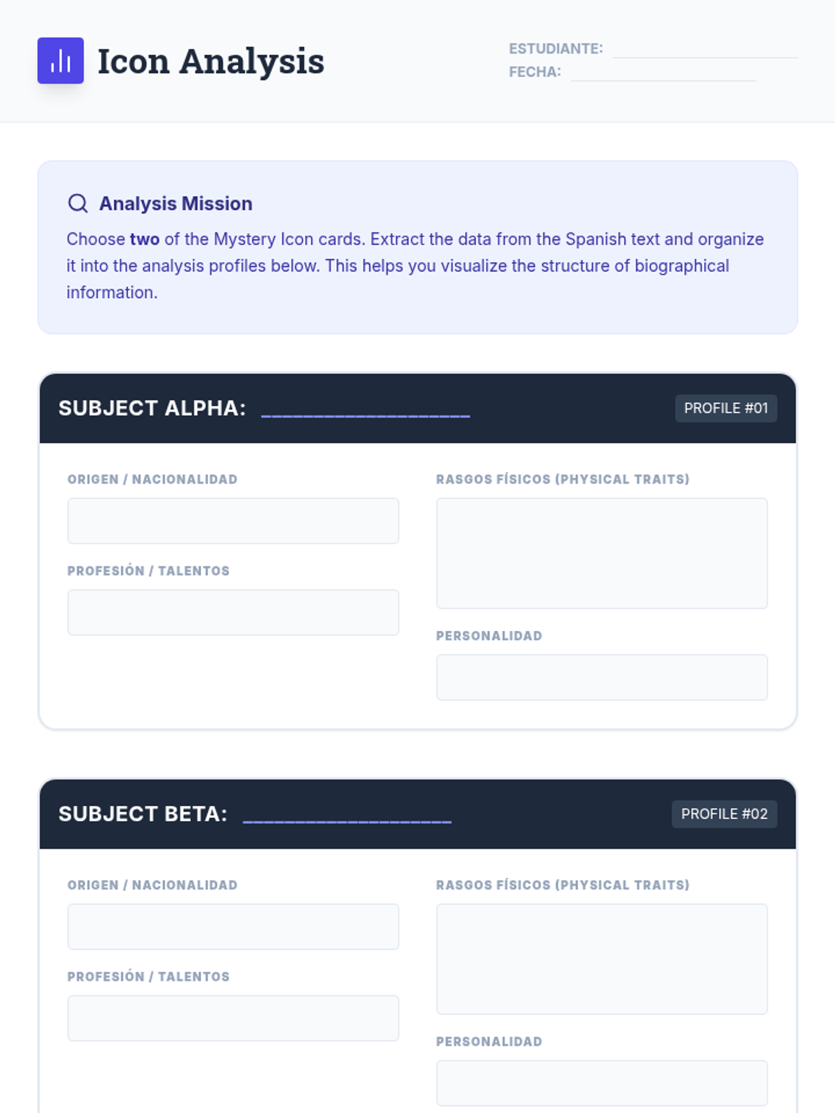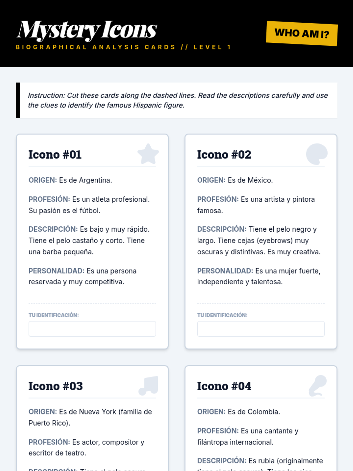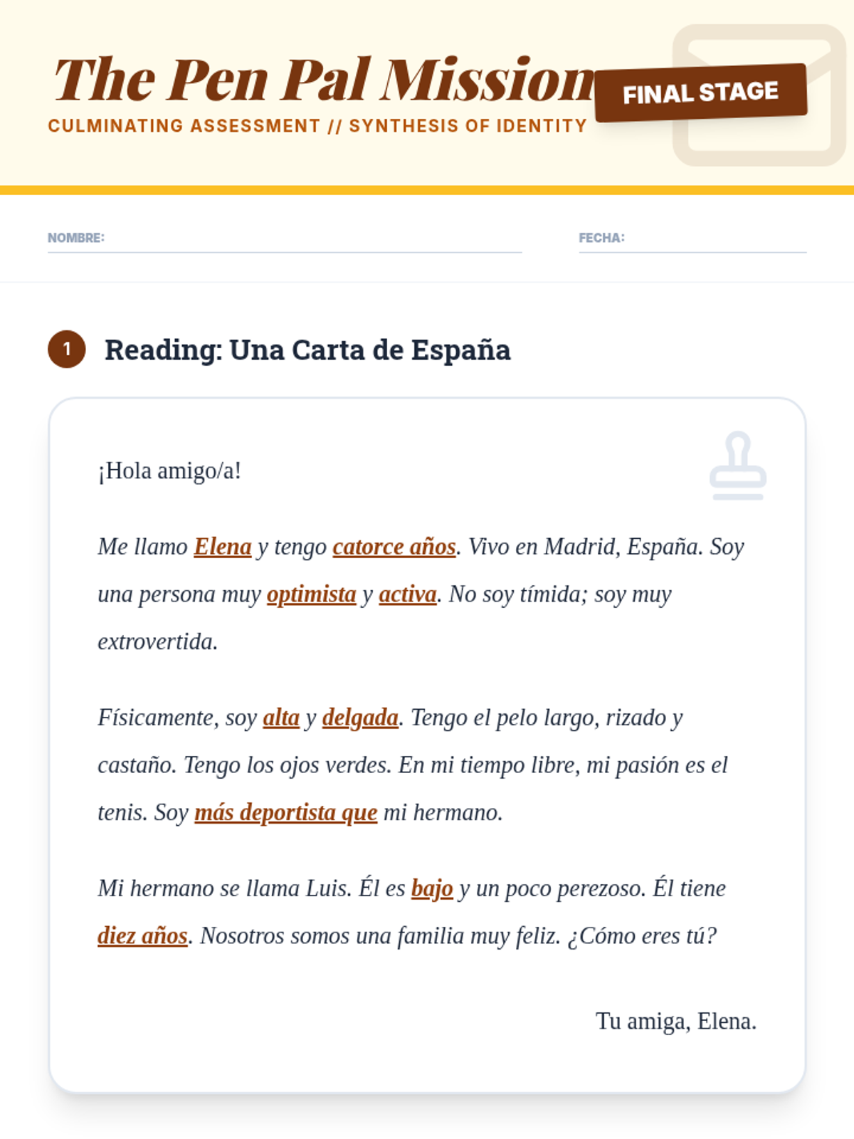 A comprehensive unit for 8th-grade Spanish beginners focusing on reading comprehension through the lens of personal identity and physical descriptions. Students progress from identifying cognates to analyzing complex biographies and synthesizing personal narratives.