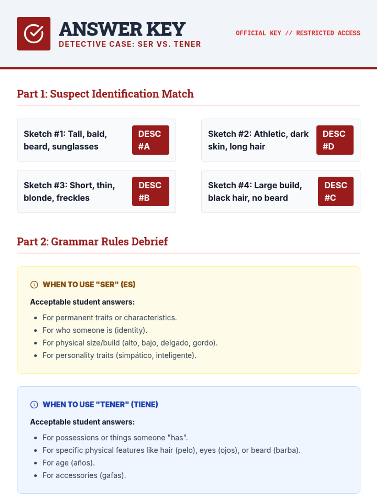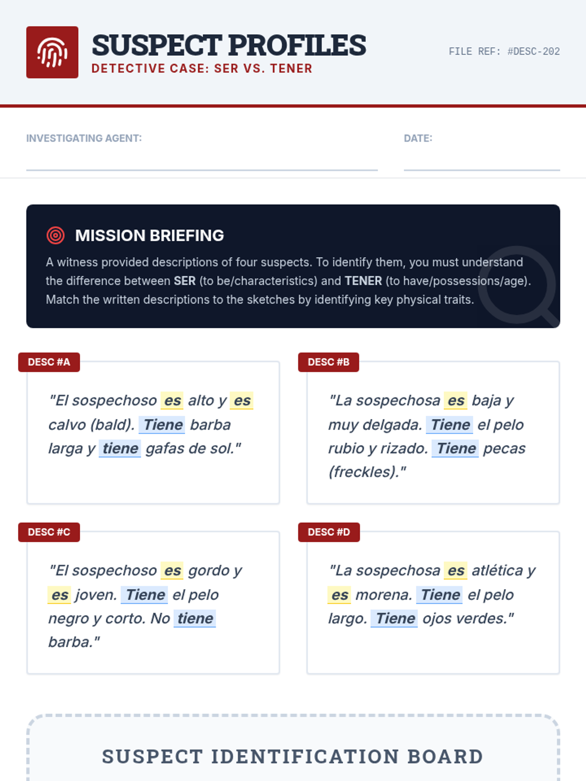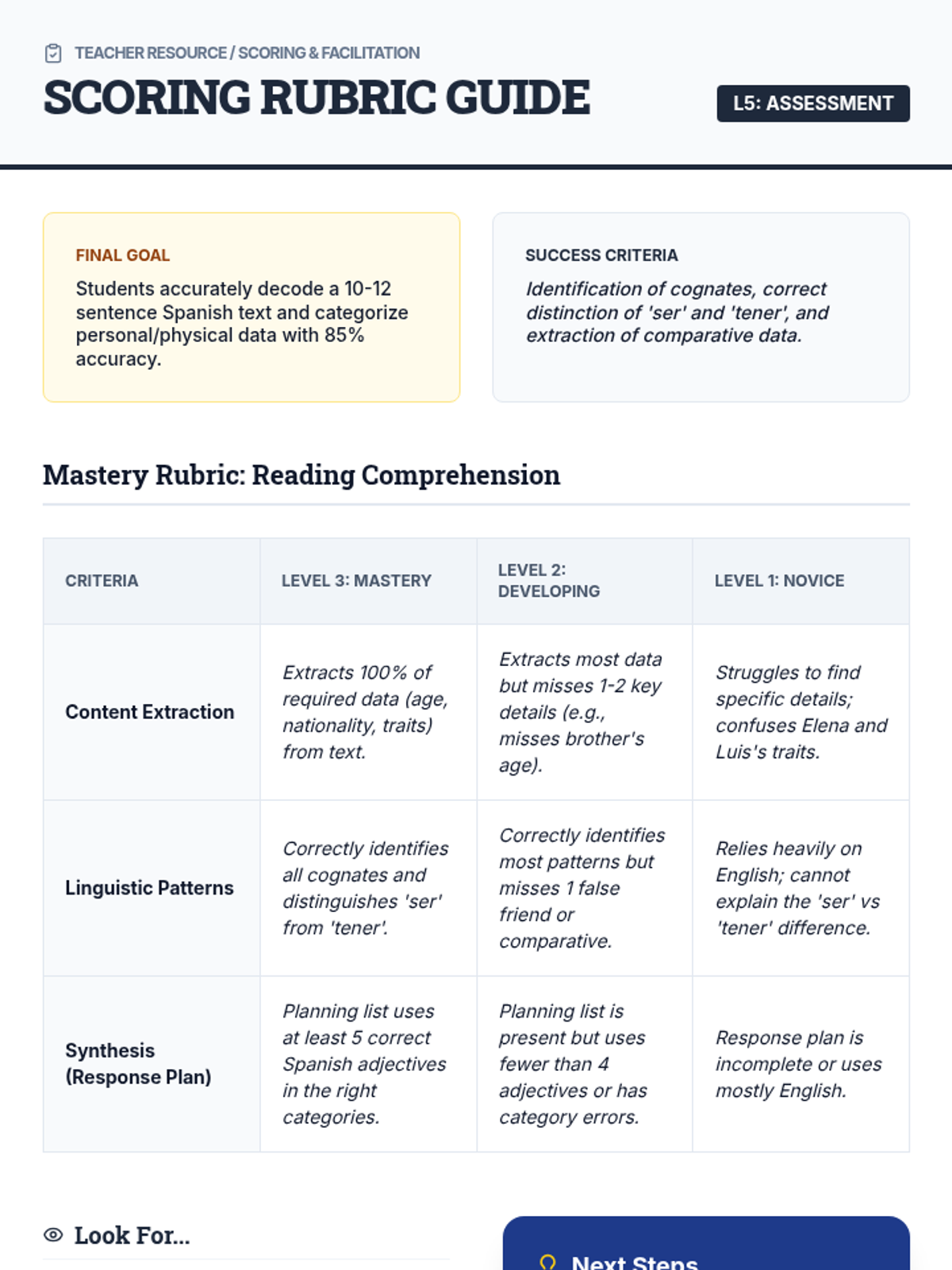 A comprehensive unit for 8th-grade Spanish beginners focusing on reading comprehension through the lens of personal identity and physical descriptions. Students progress from identifying cognates to analyzing complex biographies and synthesizing personal narratives.