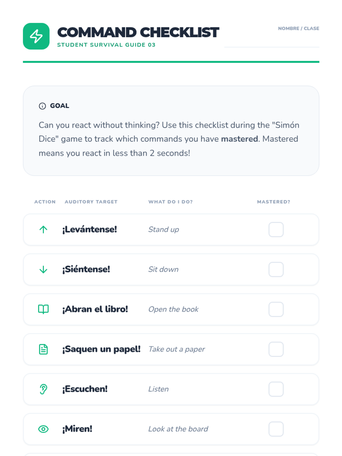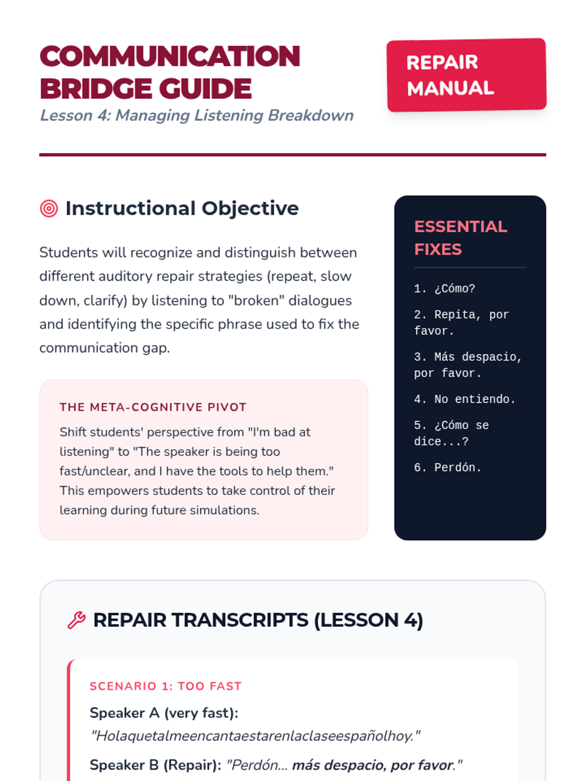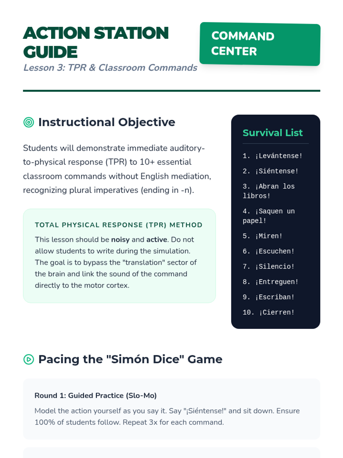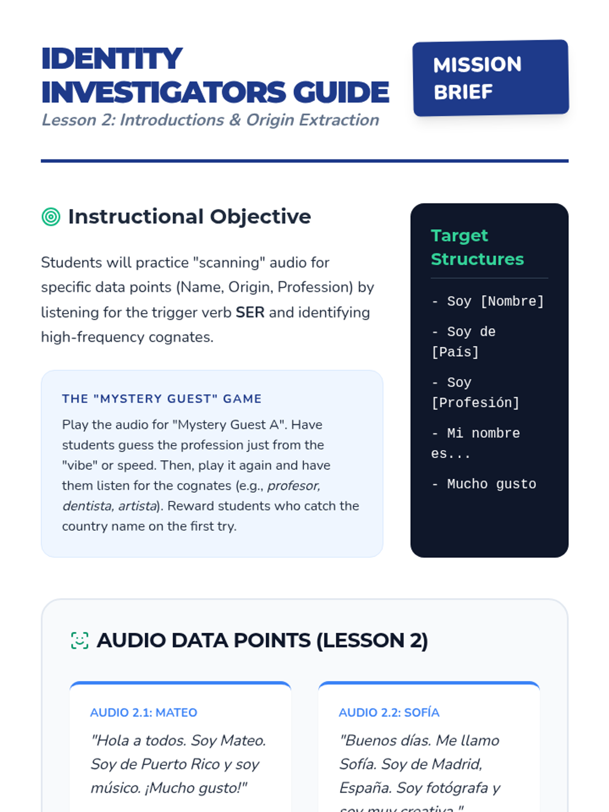 An immersive simulation guiding 10th-grade Spanish beginners through functional listening skills for social interactions and classroom survival, moving from registers of address to real-world navigation.