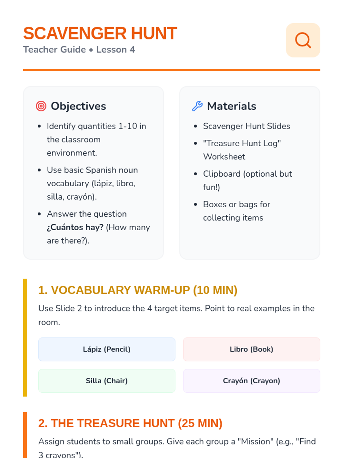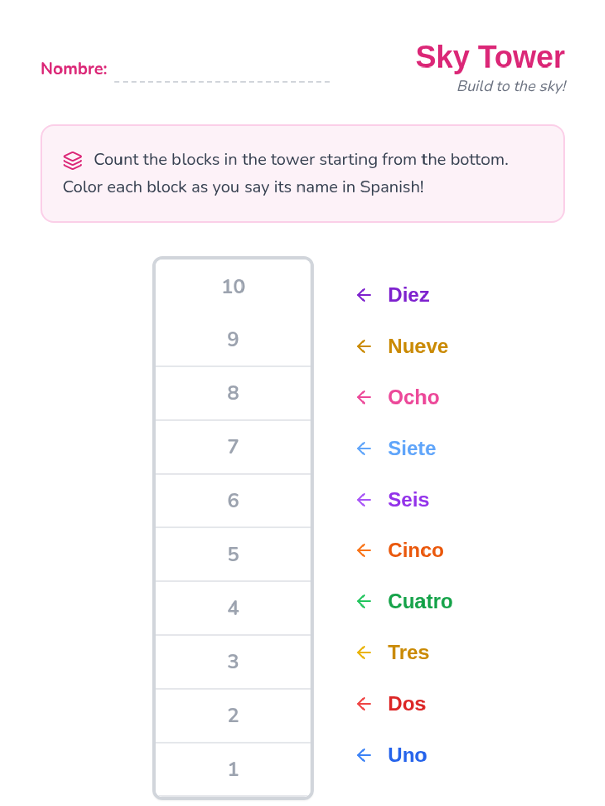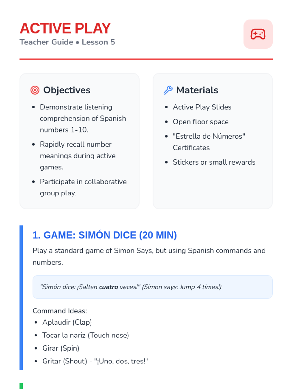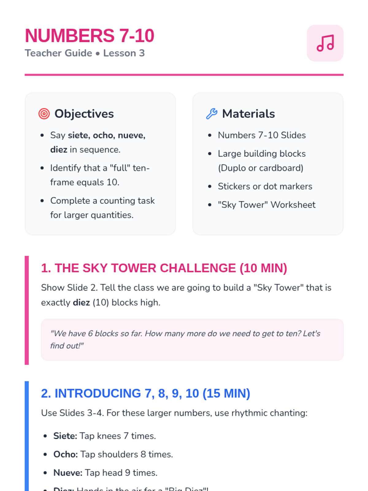 This Pre-K sequence introduces Spanish numbers 1-10 through multisensory activities, movement, and play. Students will learn to recognize, say, and count quantities using 'uno' through 'diez'.