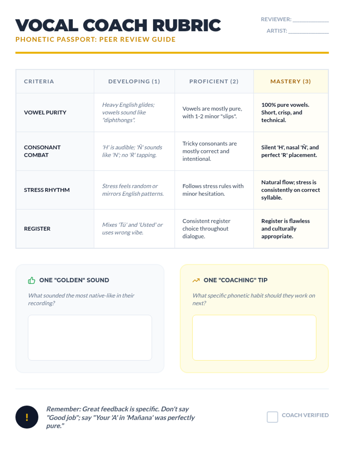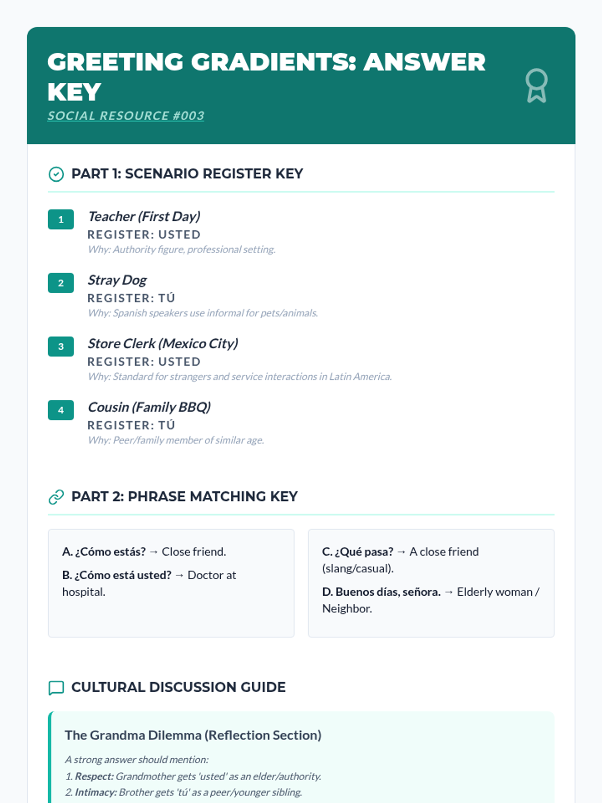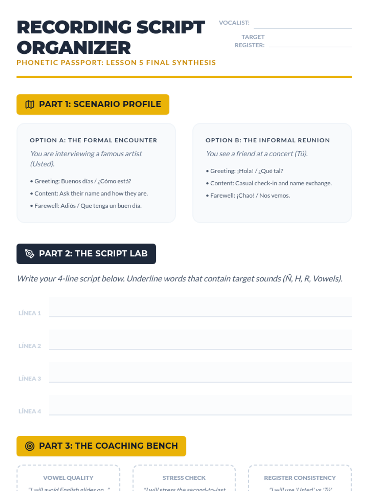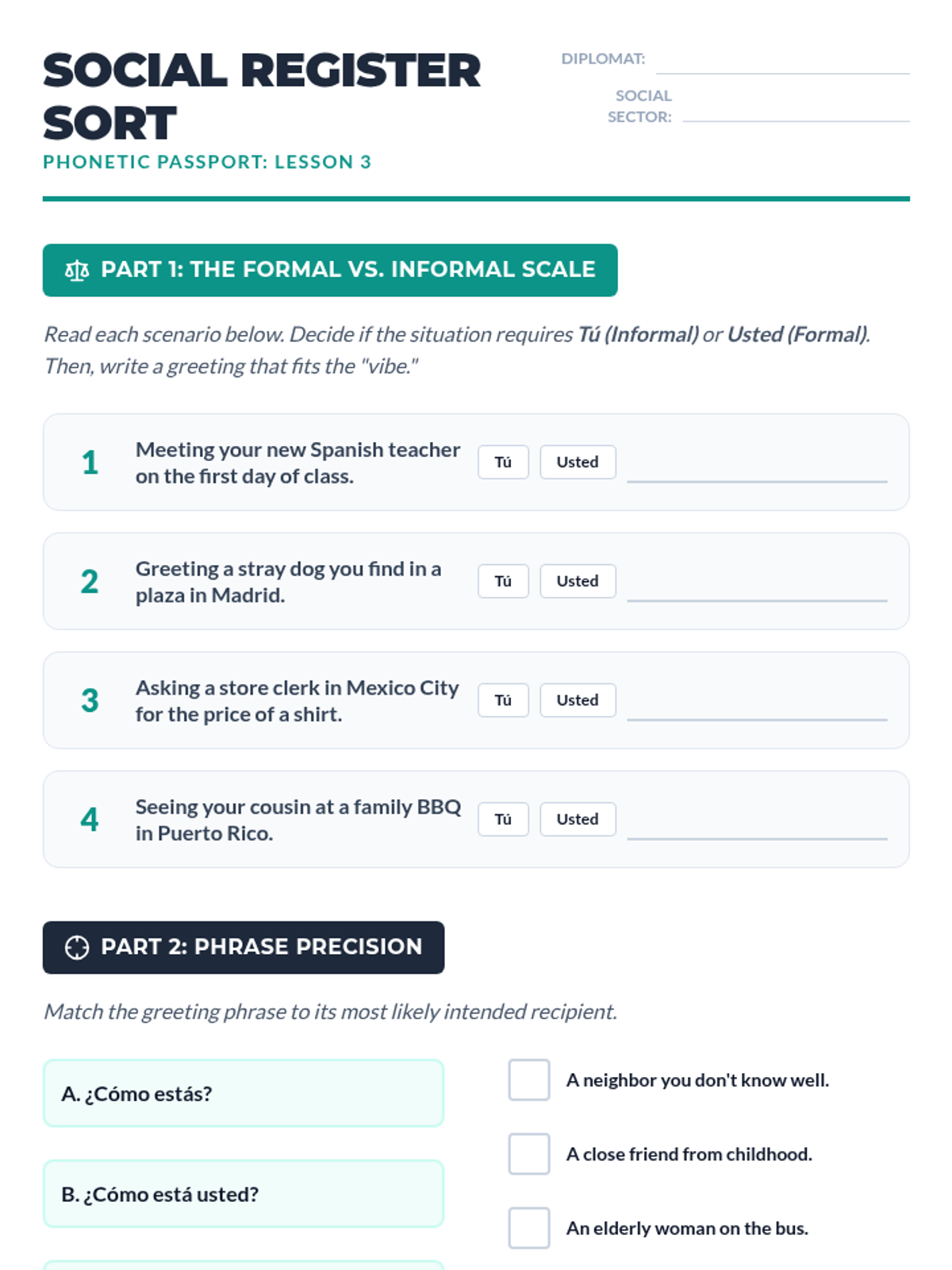 A comprehensive 5-lesson sequence for 12th-grade beginners to master Spanish phonetics, syllable stress, and the nuances of social register in greetings and farewells. Students move from individual sound production to complex, culturally appropriate dialogues.