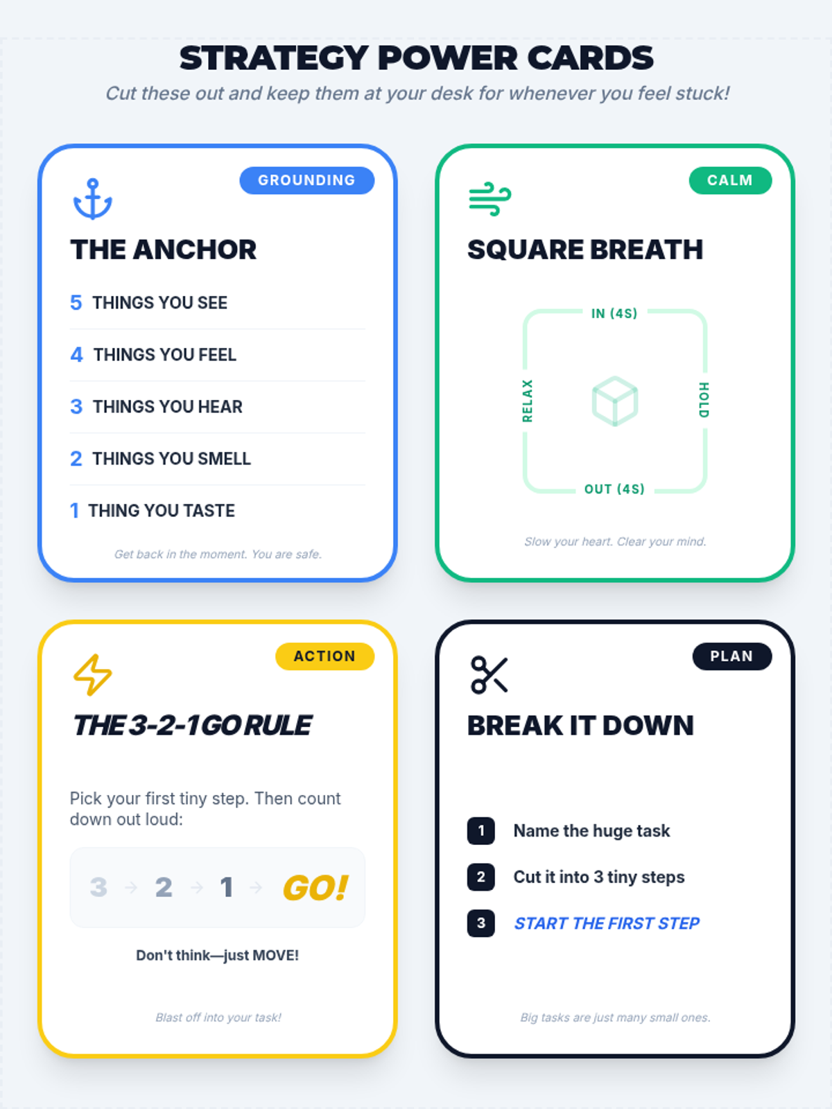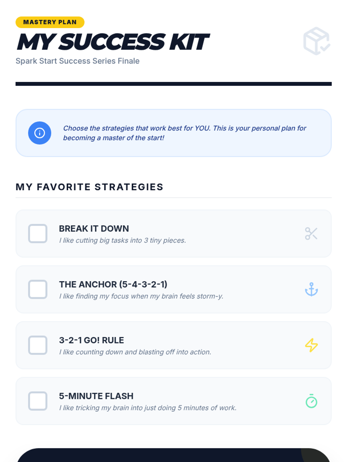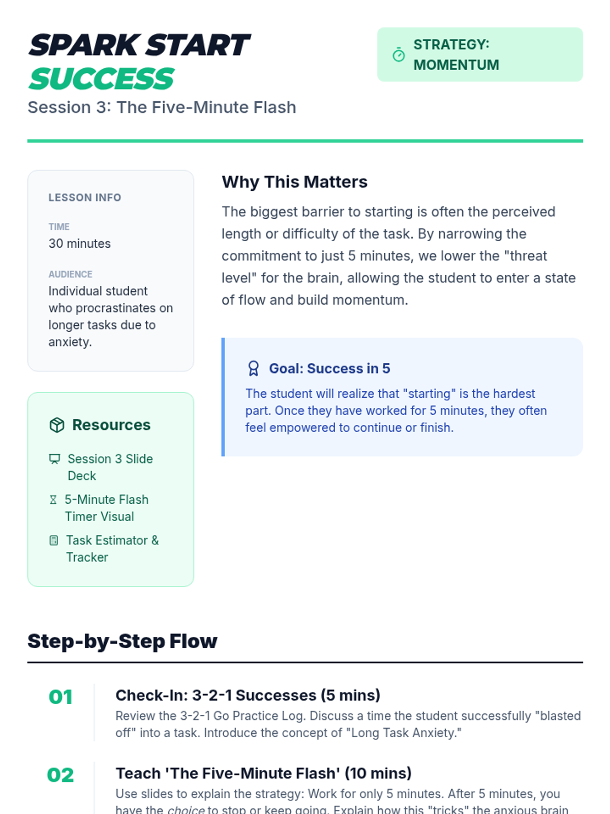 An 8-session executive functioning program designed for high schoolers to master time management and task initiation. Students use visual "maps" and blueprints to navigate their workload and build self-regulation habits.