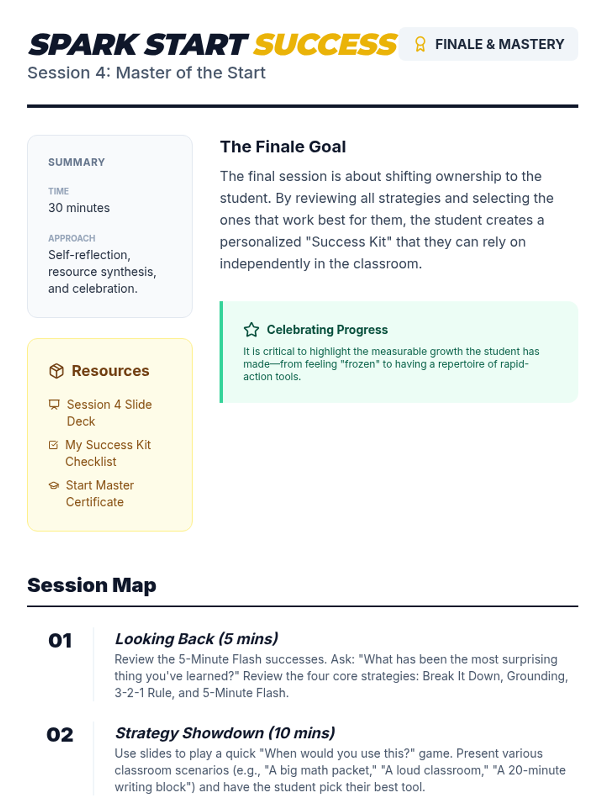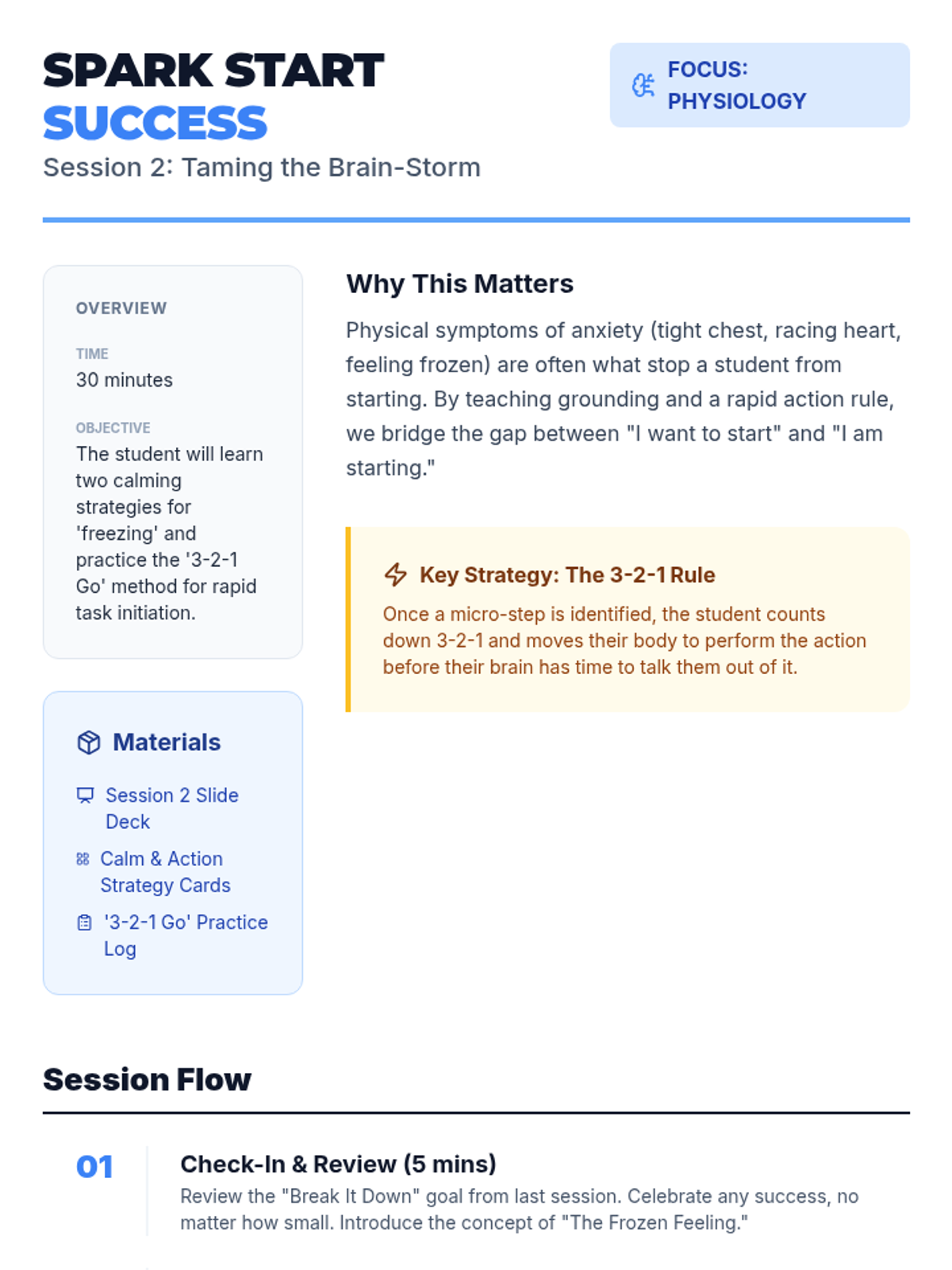 A 4-session individual support series designed to help students overcome anxiety and build the skills needed to independently initiate and complete academic tasks through structured strategies and playful engagement.
