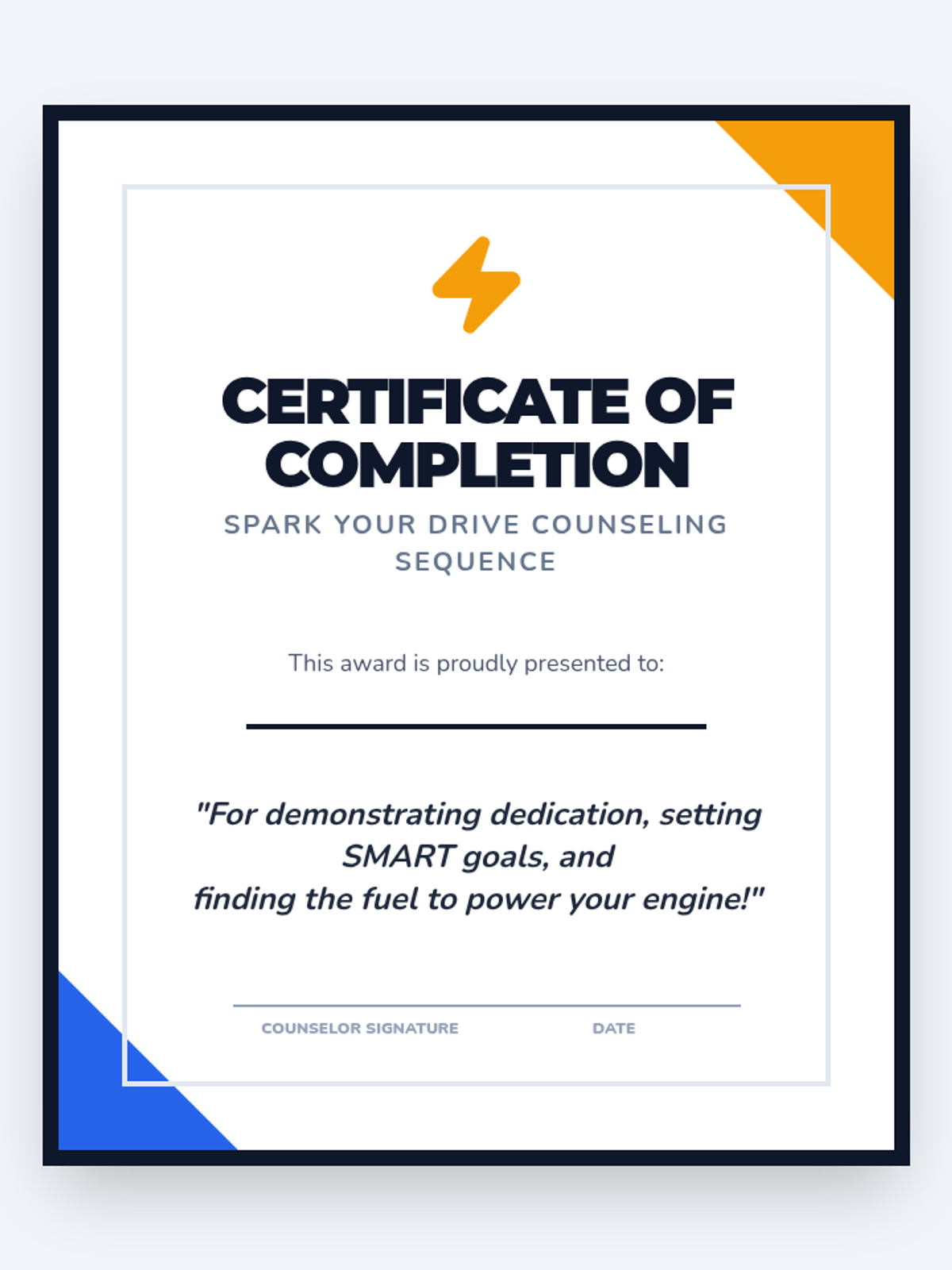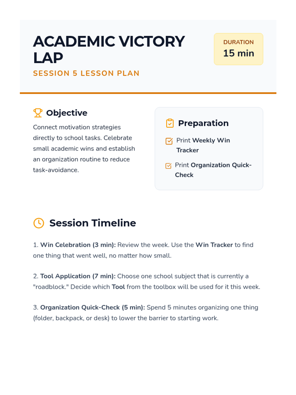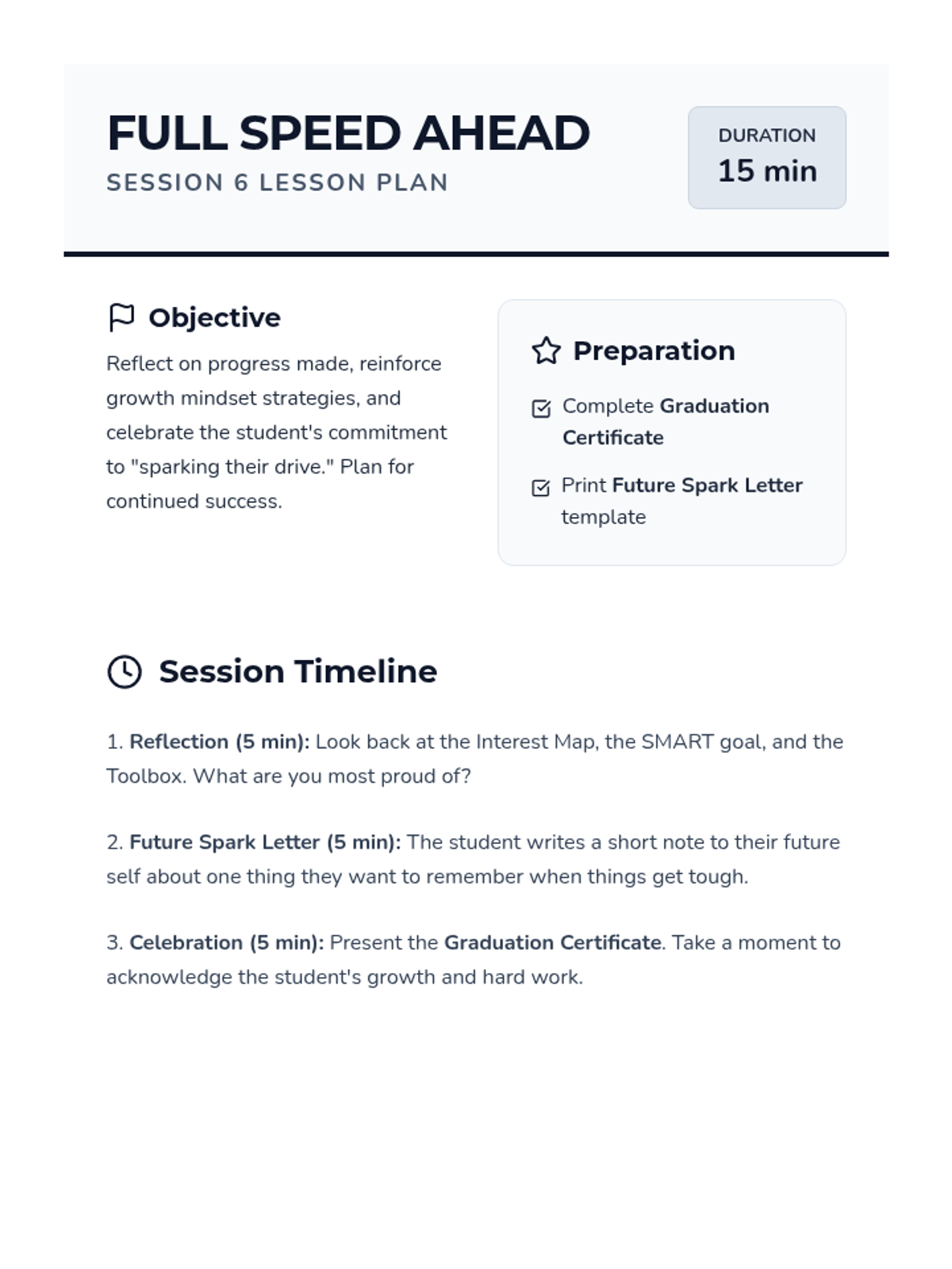A six-session individual counseling sequence for 5th graders to boost motivation, develop emotional regulation, and build effective coping strategies through a 'Spark and Engine' theme.