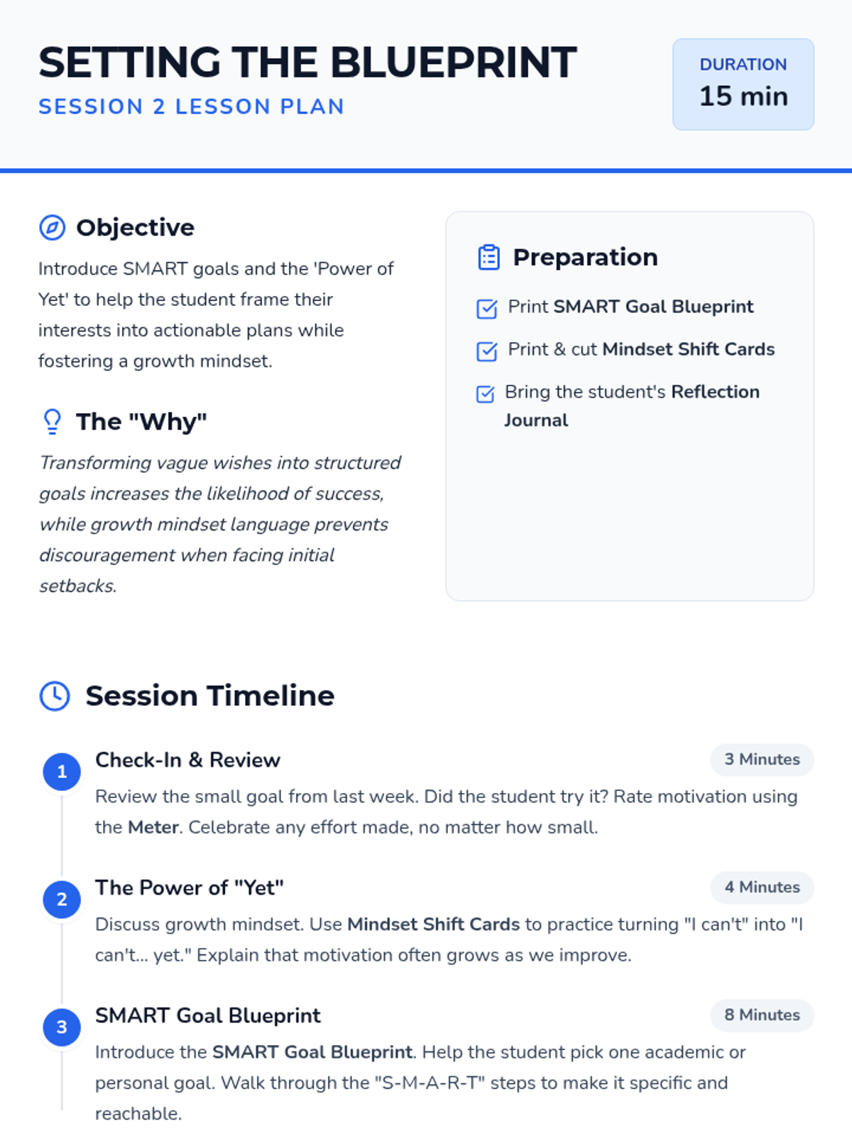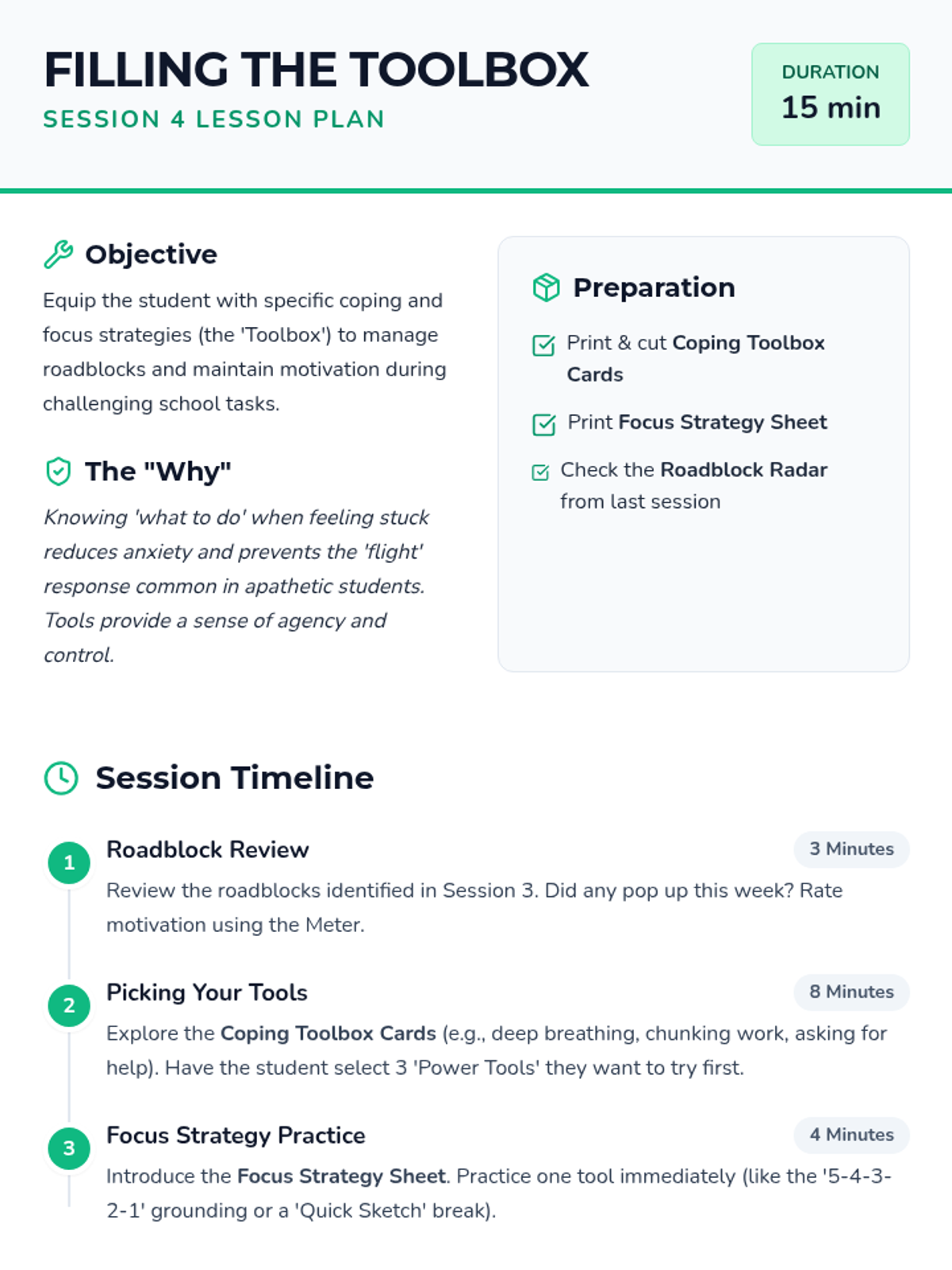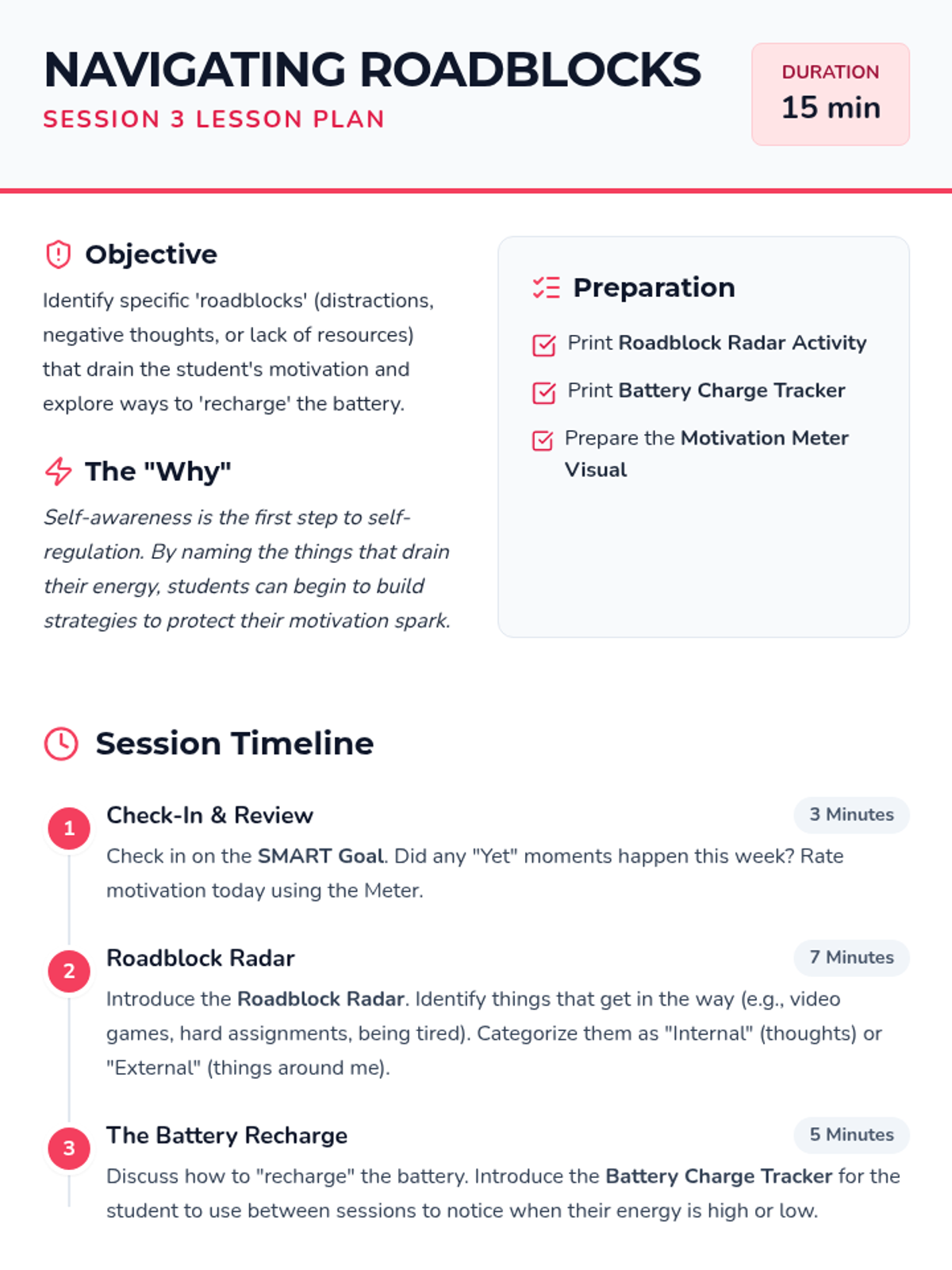 A six-session individual counseling sequence for 5th graders to boost motivation, develop emotional regulation, and build effective coping strategies through a 'Spark and Engine' theme.