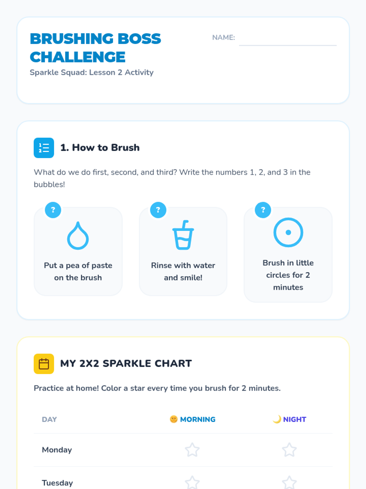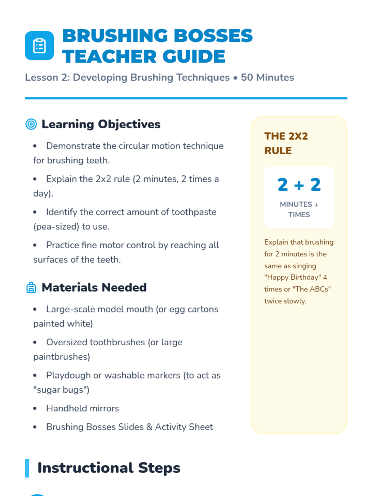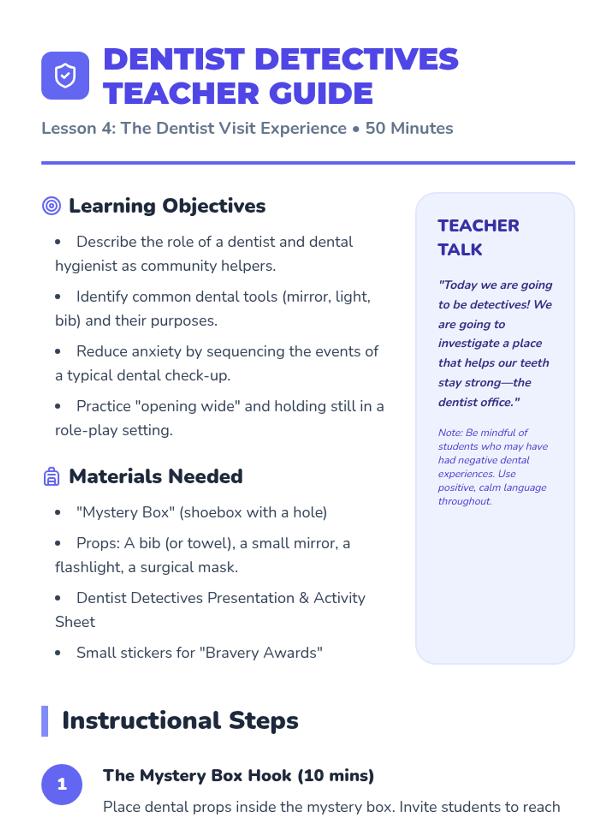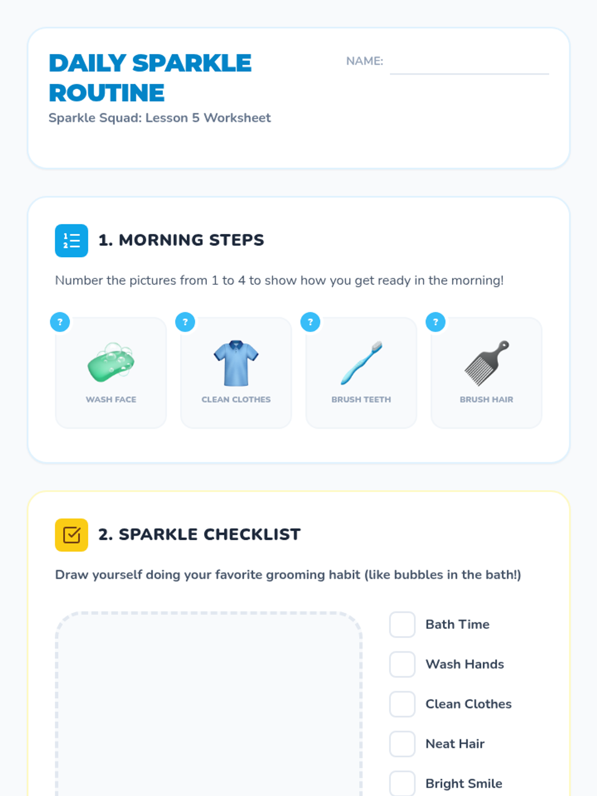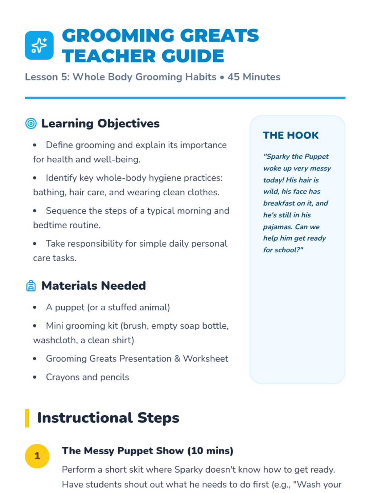 A comprehensive hygiene sequence for Kindergarteners focusing on oral health and grooming routines through hands-on activities, role-play, and the 'Sparkle Squad' theme.