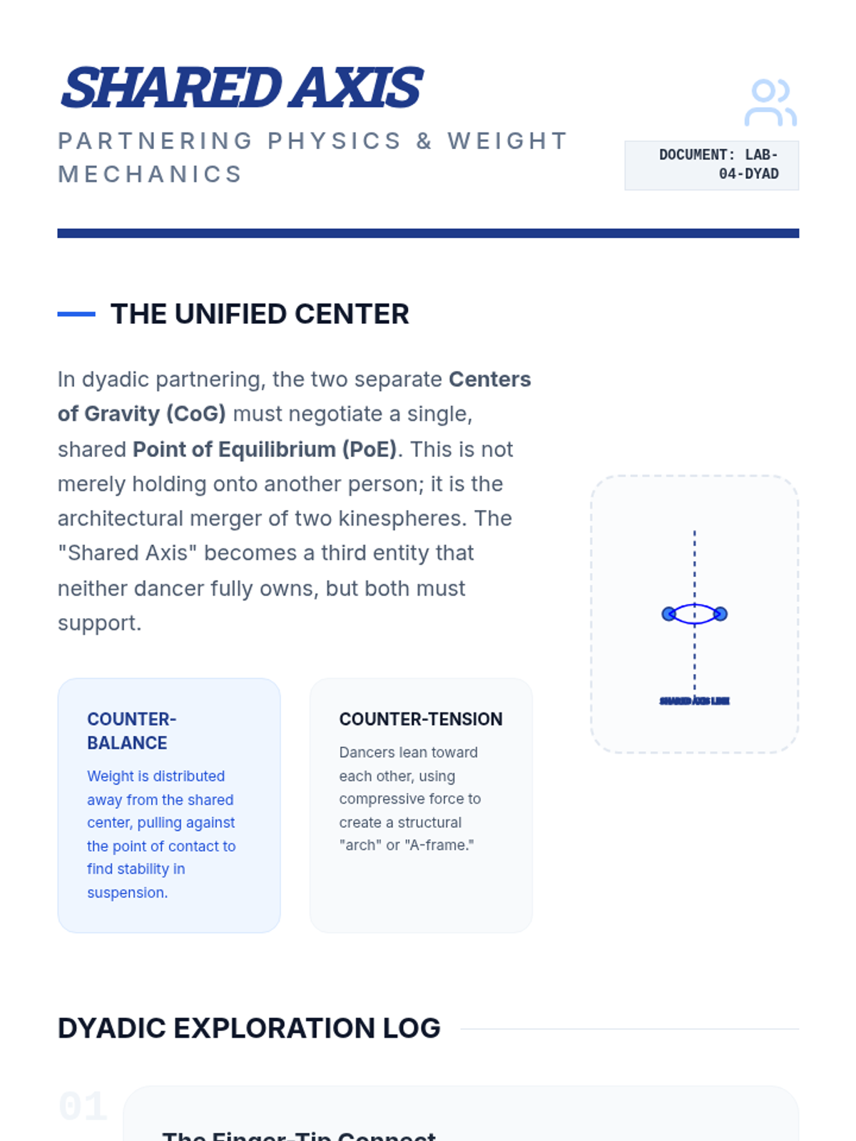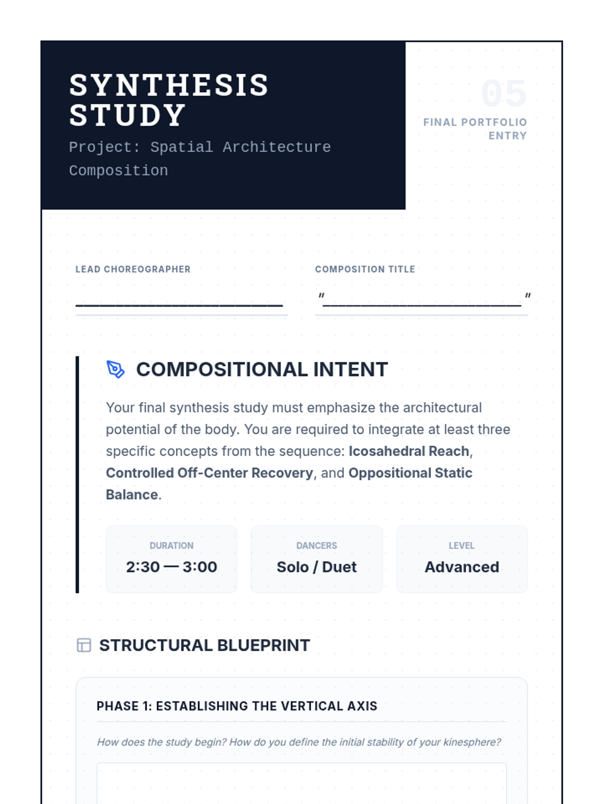 This advanced dance sequence for graduate students explores the intersection of physics and movement, focusing on Laban Space Harmony, off-center stability, and the architectural potential of the body in motion. Students will progress from individual spatial analysis to complex partnering mechanics and gravity-defying choreographic composition.