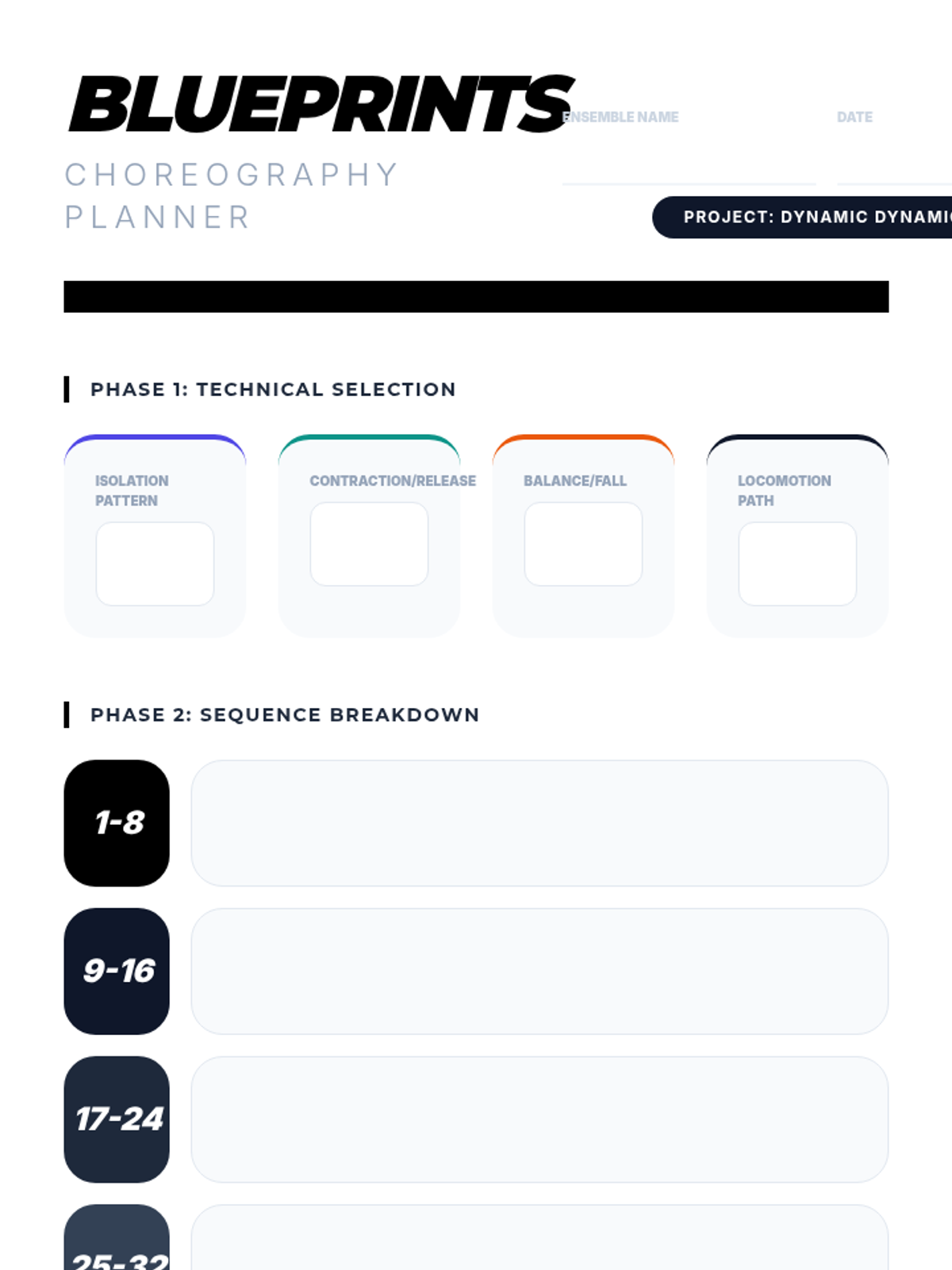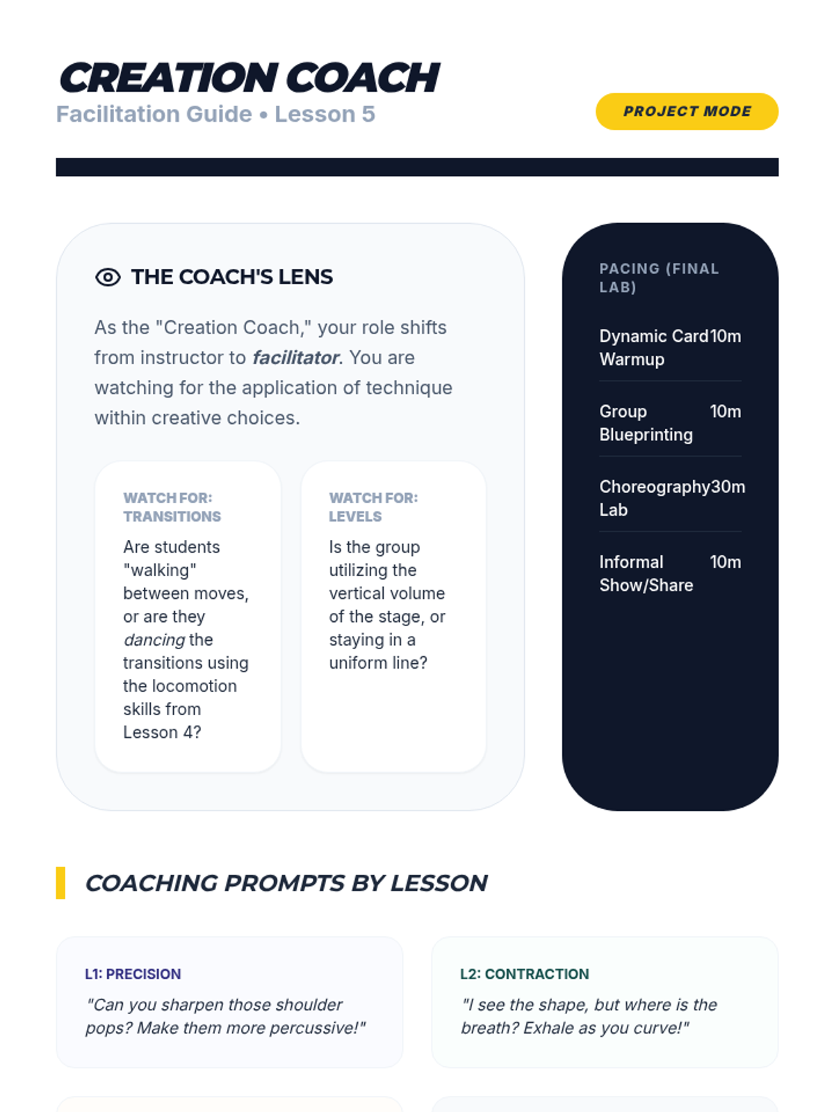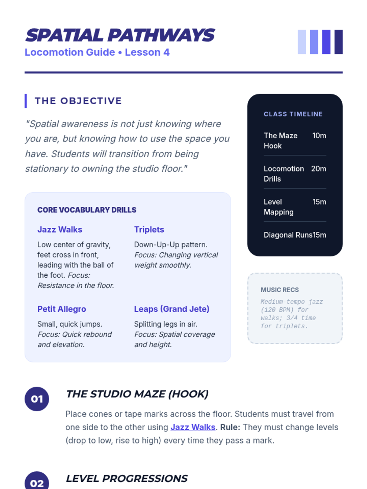 This 8th-grade dance sequence explores the technical foundations of jazz and contemporary dance, focusing on spatial awareness, body isolations, and the mechanics of weight shift. Students progress from micro-movements to full-body traveling sequences, culminating in a collaborative choreography project.