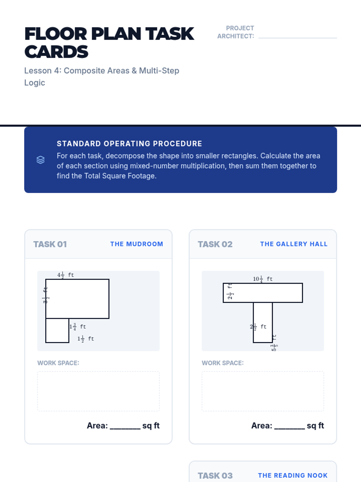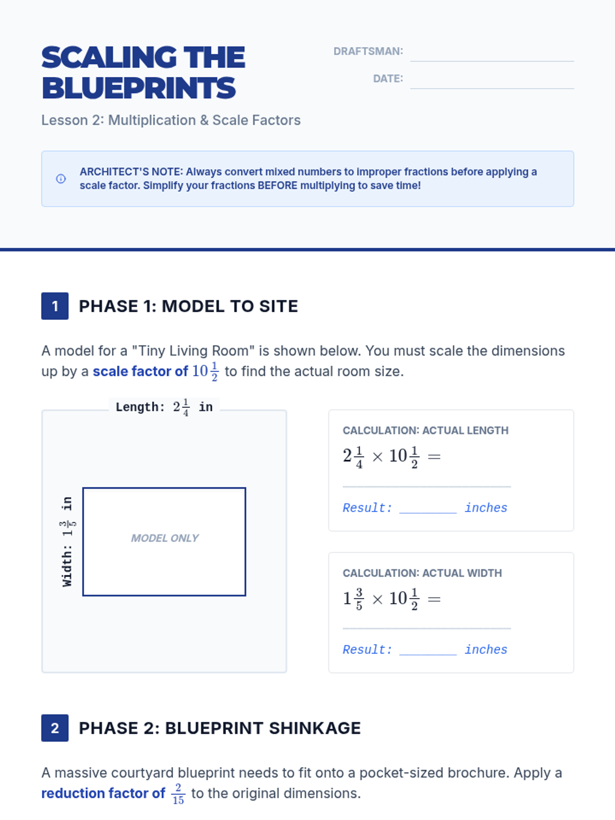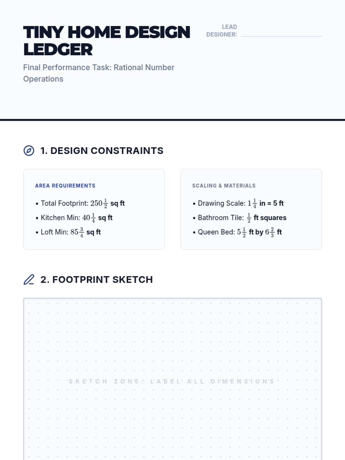 This sequence applies fraction multiplication and division to architectural design and spatial planning, moving from visual area models to complex multi-step scaling and design challenges. Students master operations with rational numbers through the lens of a professional architect.