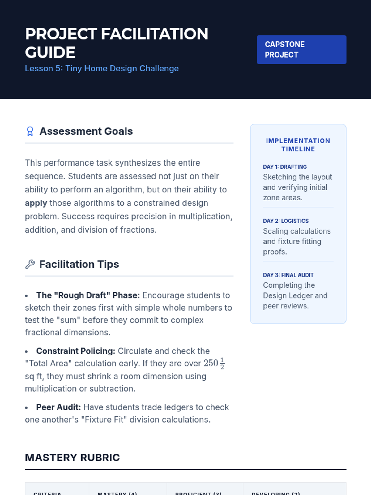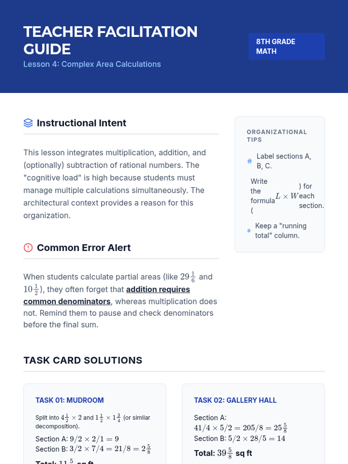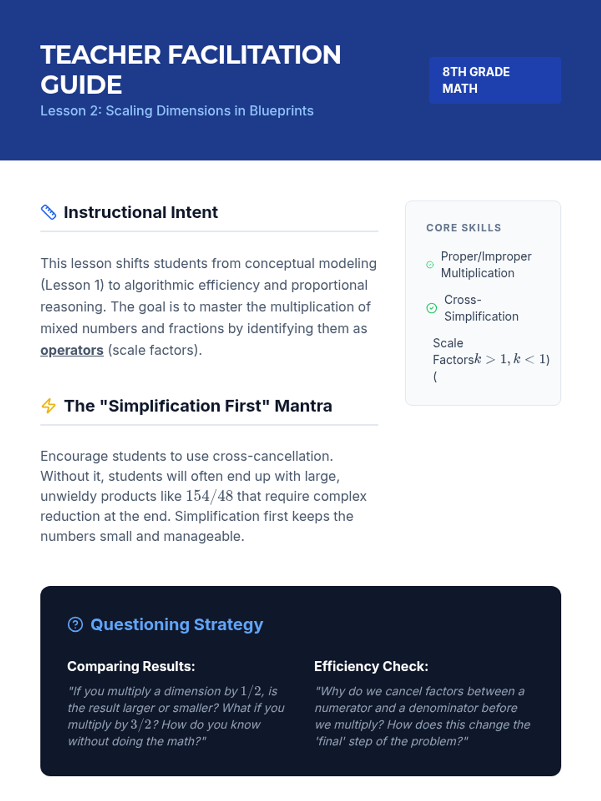 This sequence applies fraction multiplication and division to architectural design and spatial planning, moving from visual area models to complex multi-step scaling and design challenges. Students master operations with rational numbers through the lens of a professional architect.