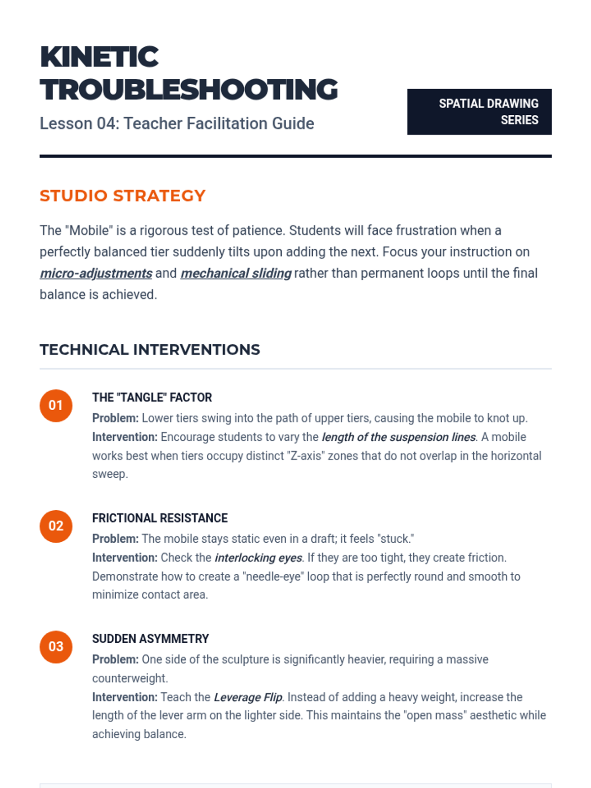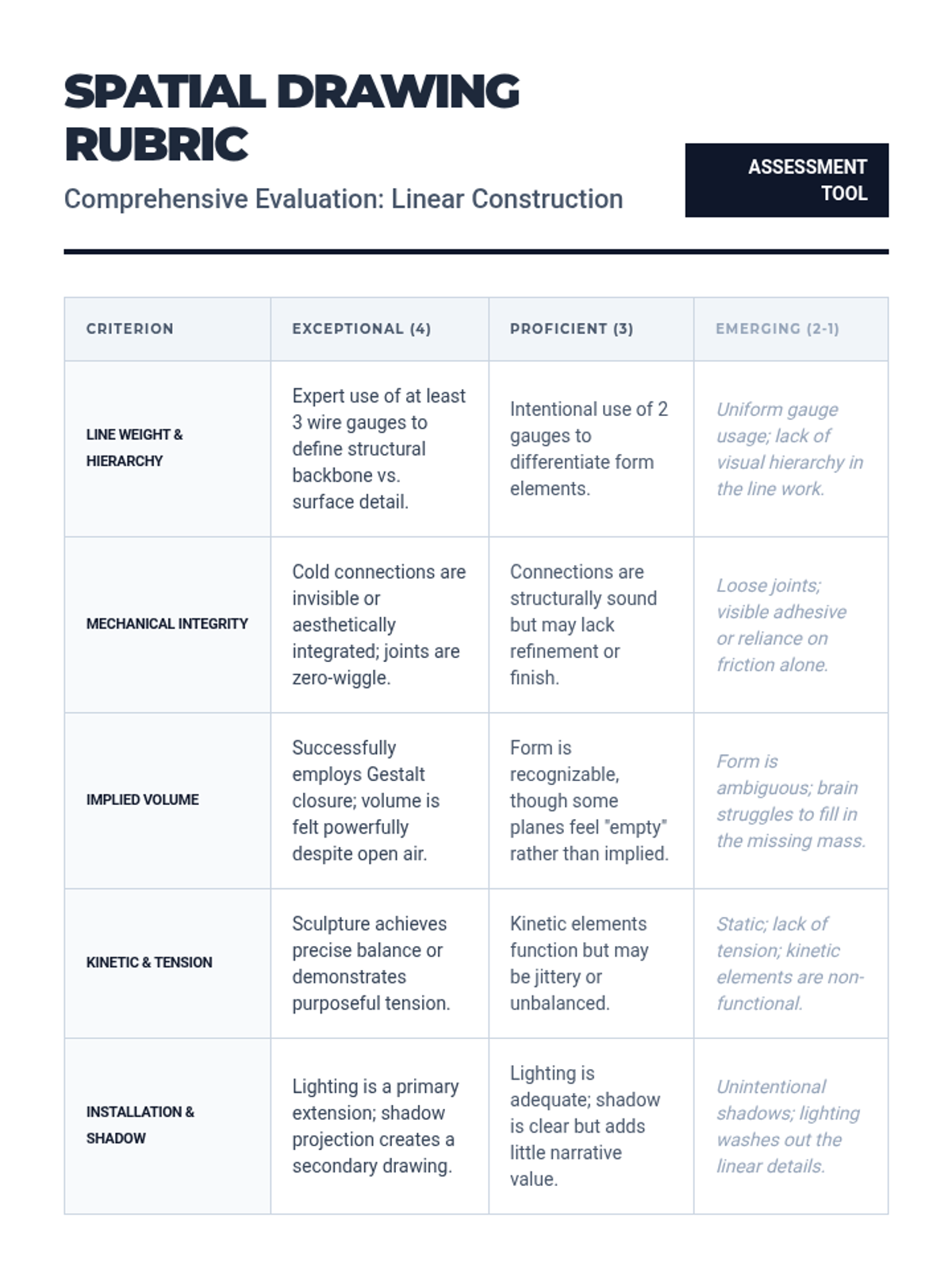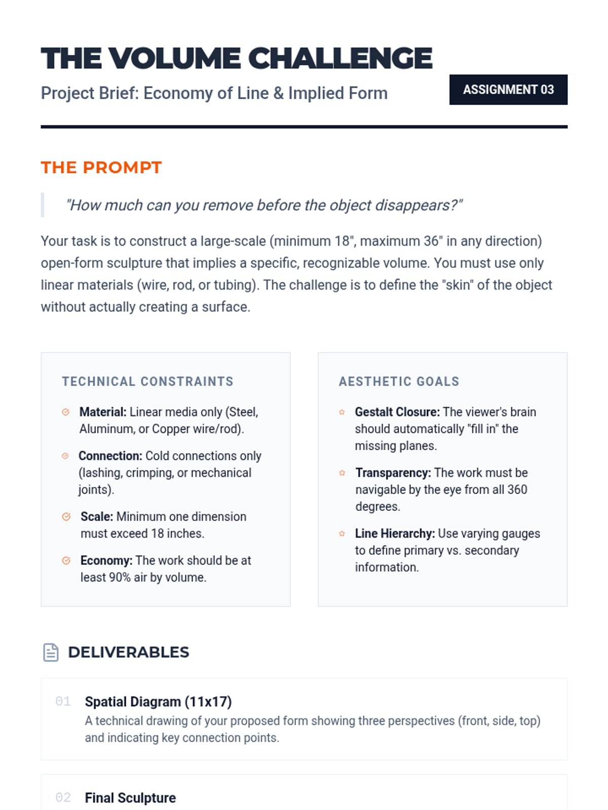 This sequence explores linear media (wire, rod, and tubing) to create 'drawings in space' that define volume without mass. Students learn to translate 2D contour drawings into 3D forms using cold-connection techniques, investigating implied volume, tension, and the interplay between light and shadow.