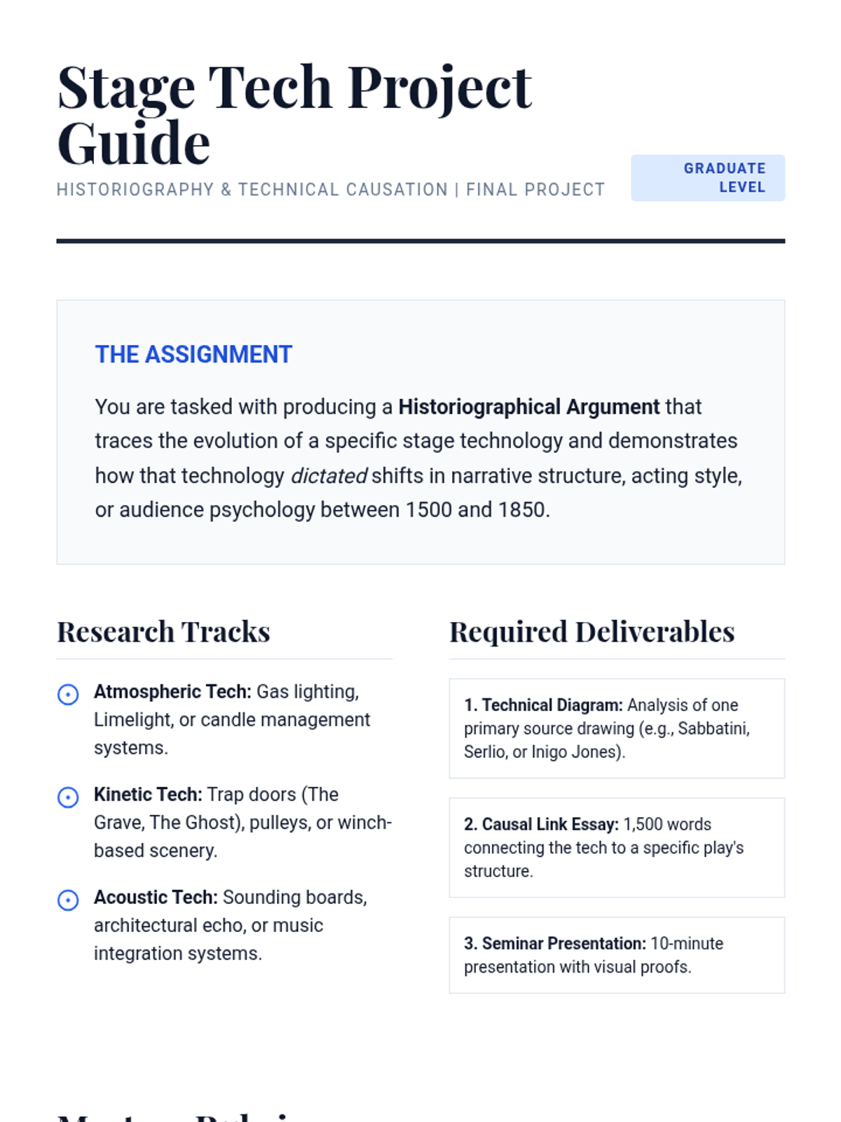 A comprehensive exploration of stage management for undergraduate students, covering organizational hierarchy, documentation, rehearsal management, and technical execution. Students transition from understanding the SM role to mastery of the prompt book and cue calling.