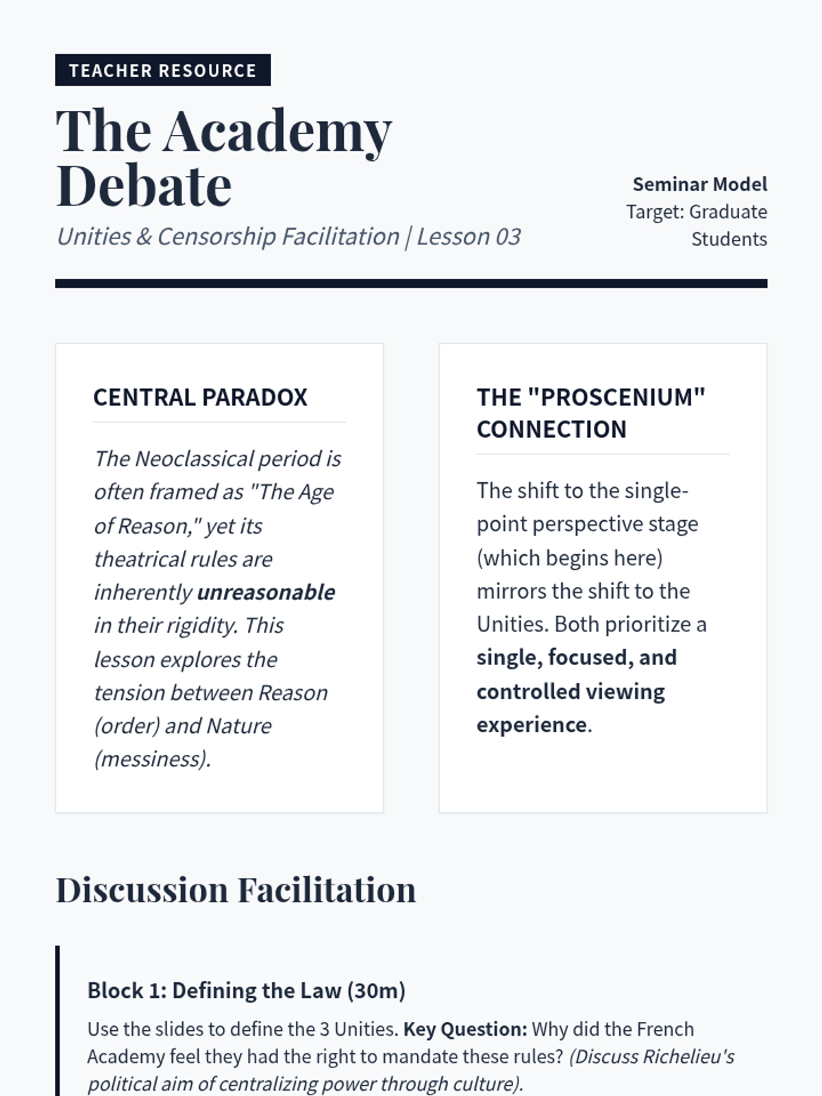 This sequence establishes the technical and structural foundations required for professional playwriting. Students master industry-standard formatting and deconstruct theatrical architecture using classic and contemporary models to understand how structure dictates pacing and dramatic tension.