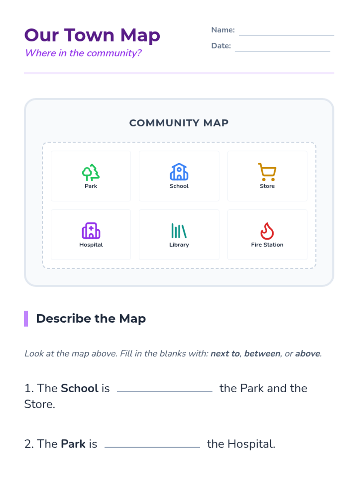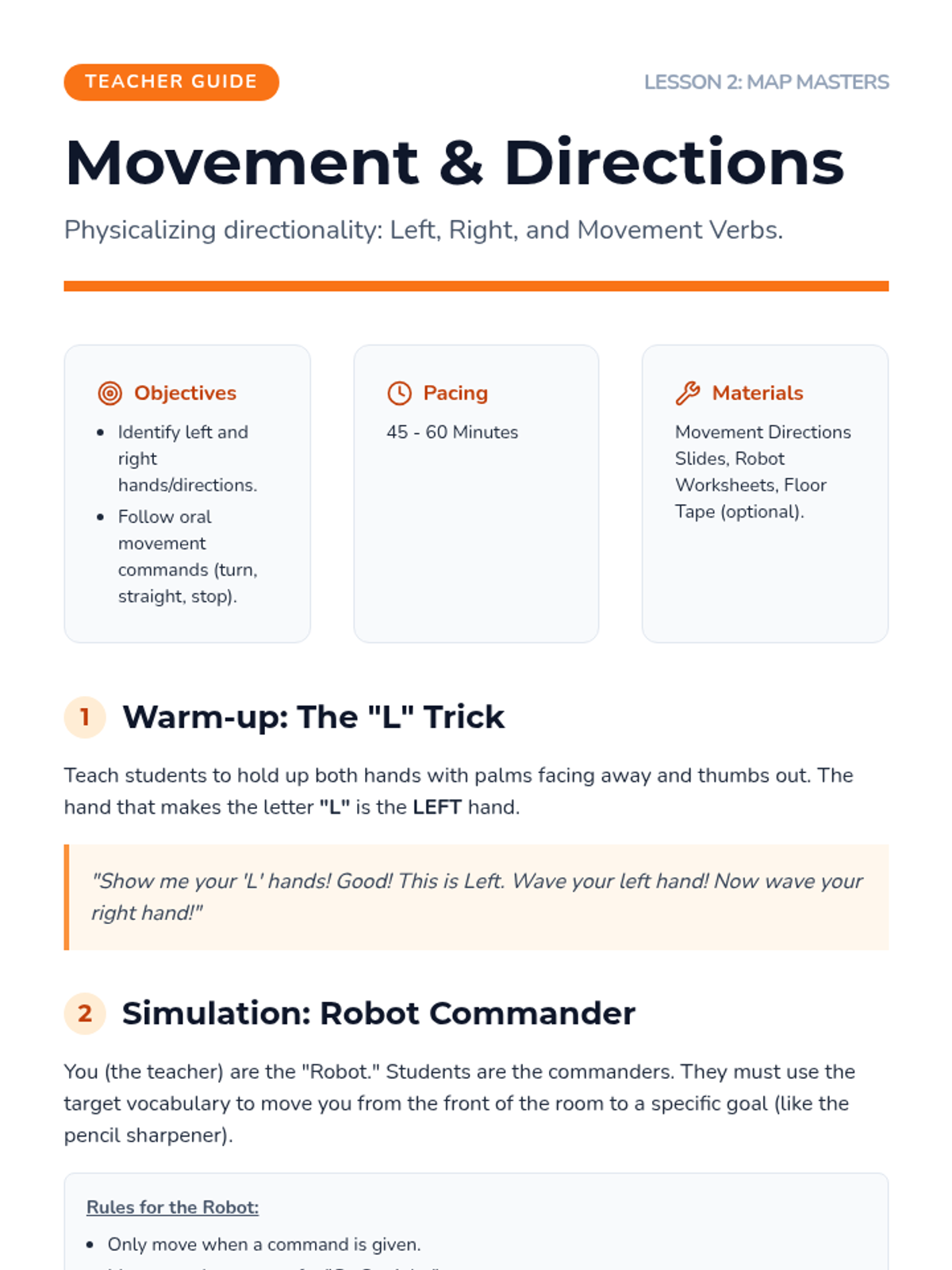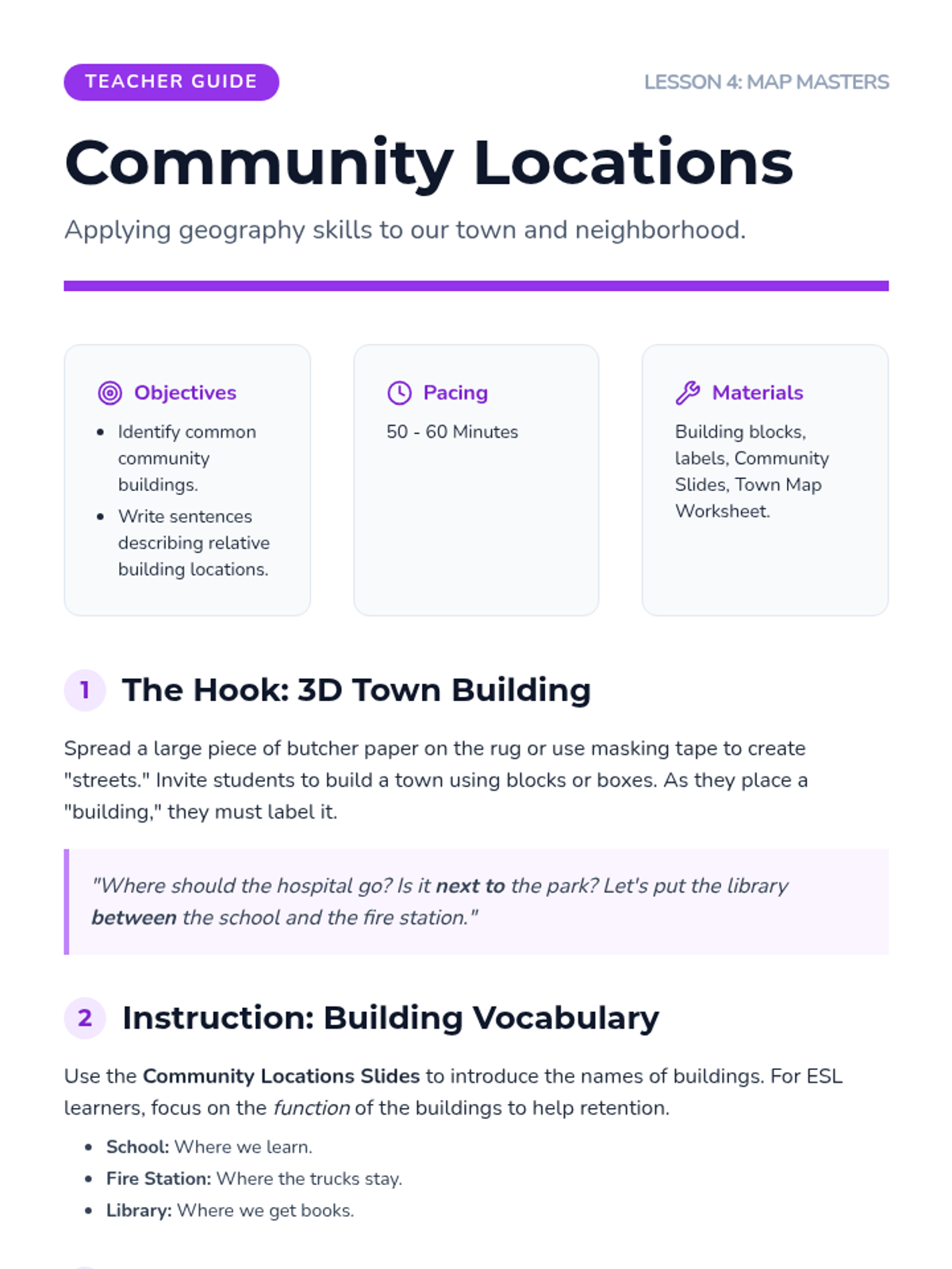 A comprehensive ESL sequence for 1st graders focusing on the academic language of spatial relationships, directional movement, and map literacy within a Social Studies context. Students progress from basic positional words to navigating and creating their own maps.