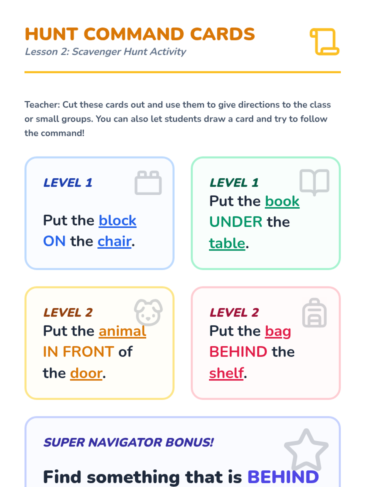A foundational physics and spatial reasoning sequence for Kindergarten students focused on using positional vocabulary (above, below, beside, in front of, behind) to describe the relative location of objects. Students progress from physical movement to 2D mapping and verbal communication challenges.