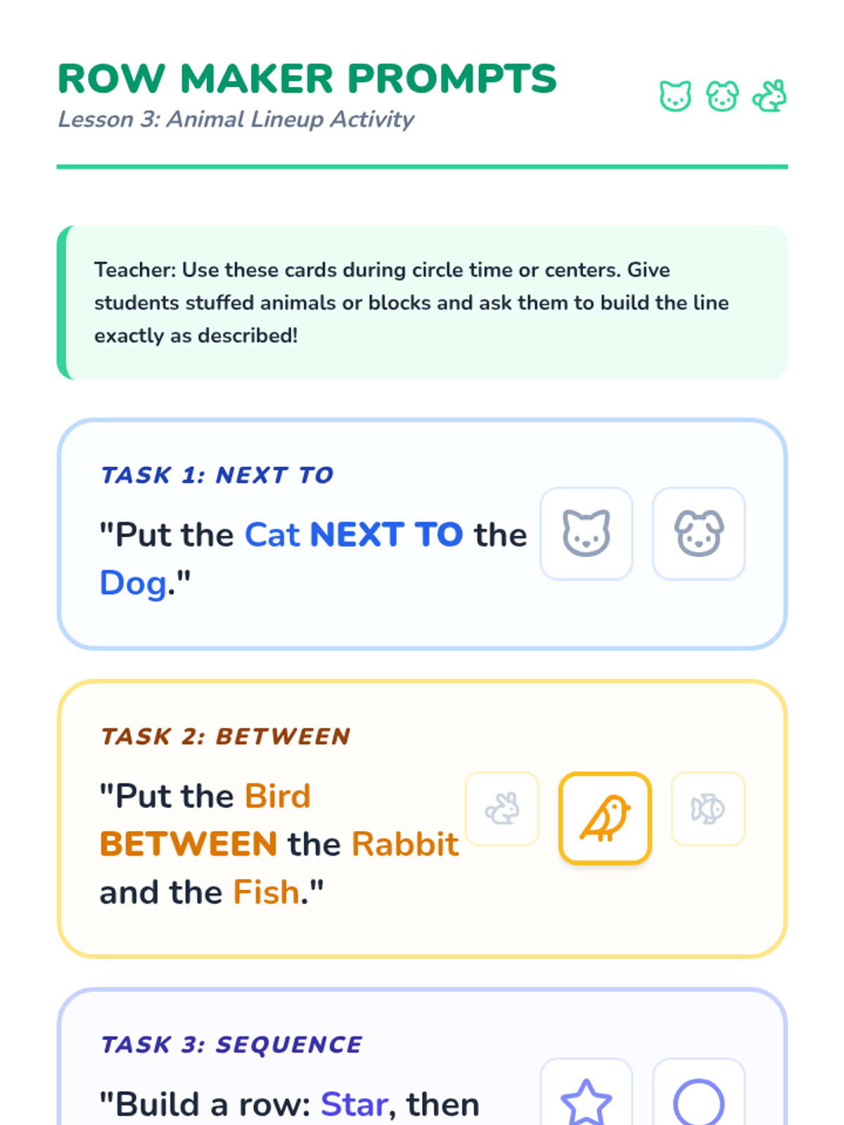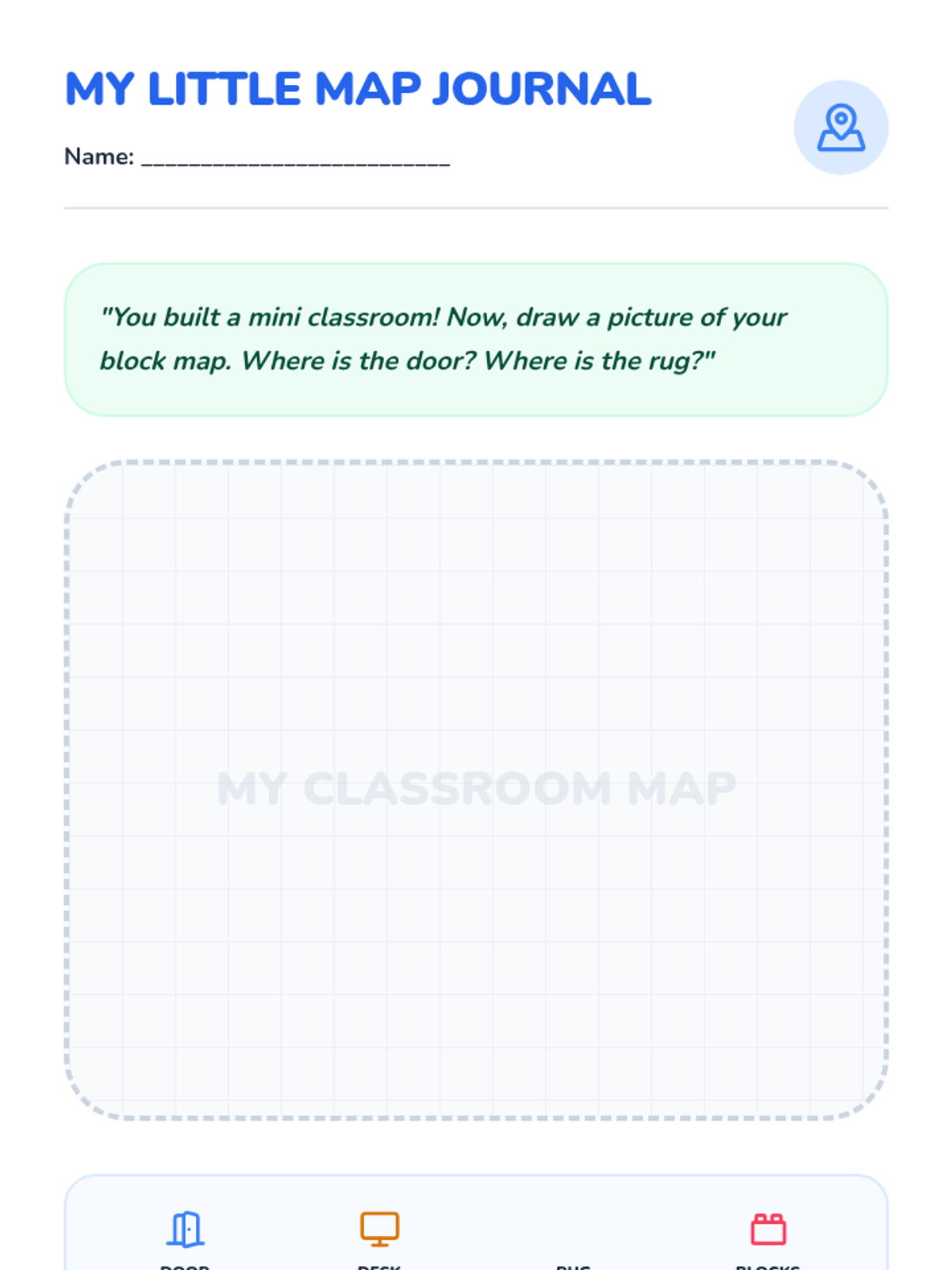 A Pre-K sequence focused on developing spatial awareness and positional vocabulary through physical movement, object manipulation, and classroom mapping. students explore terms like in, out, over, under, next to, and between.