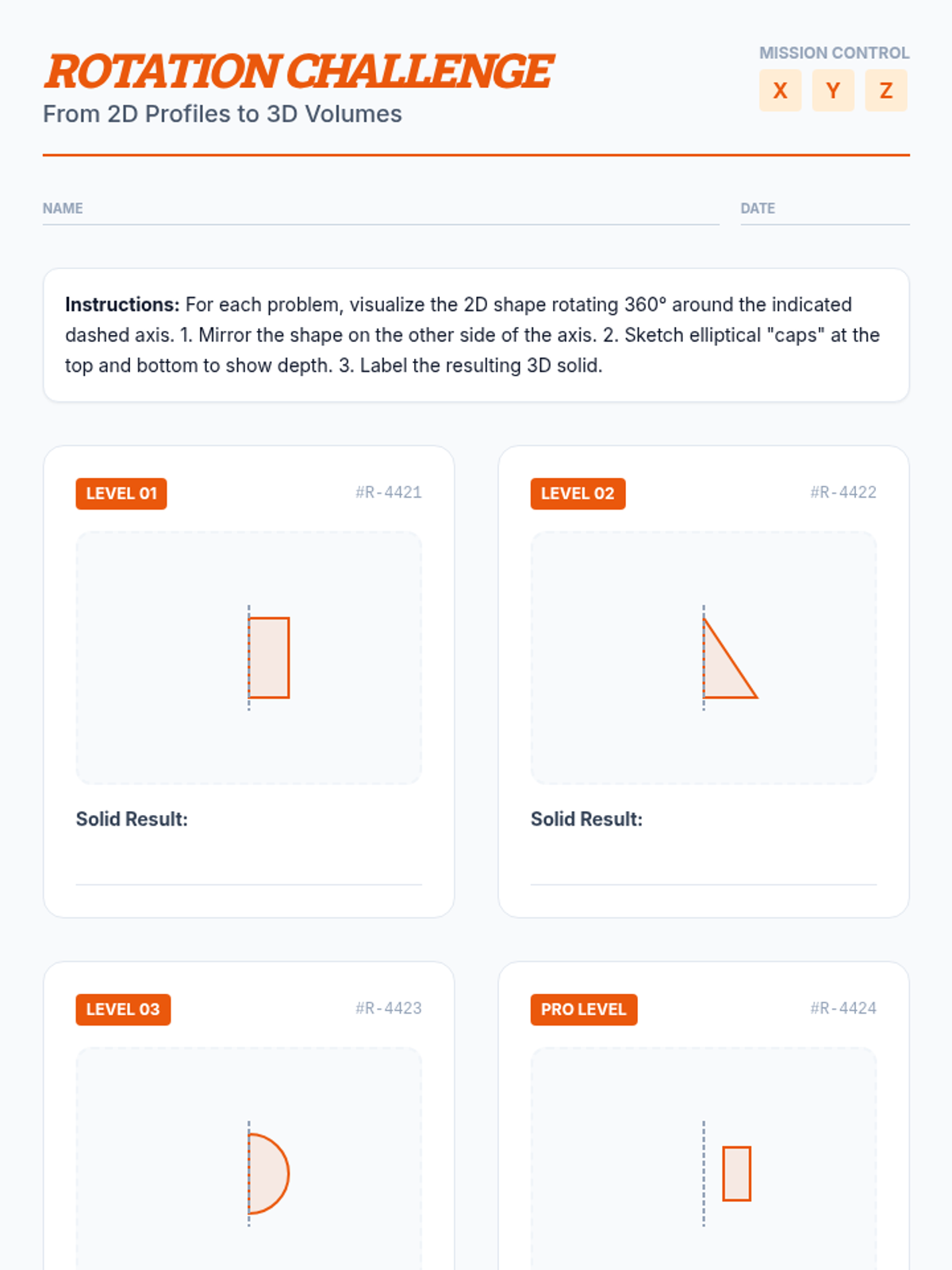 A 10th-grade sequence focusing on the cognitive skill of spatial visualization. Students explore 3D objects through 2D cross-sections and conceptualize how 2D shapes create 3D forms when rotated around an axis, bridging geometry and engineering.