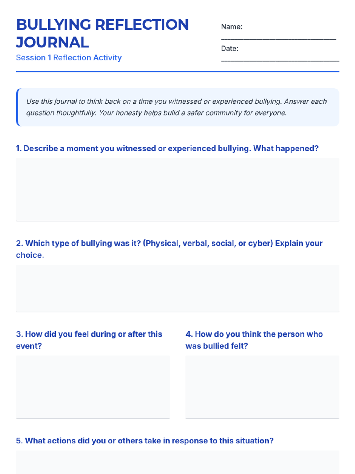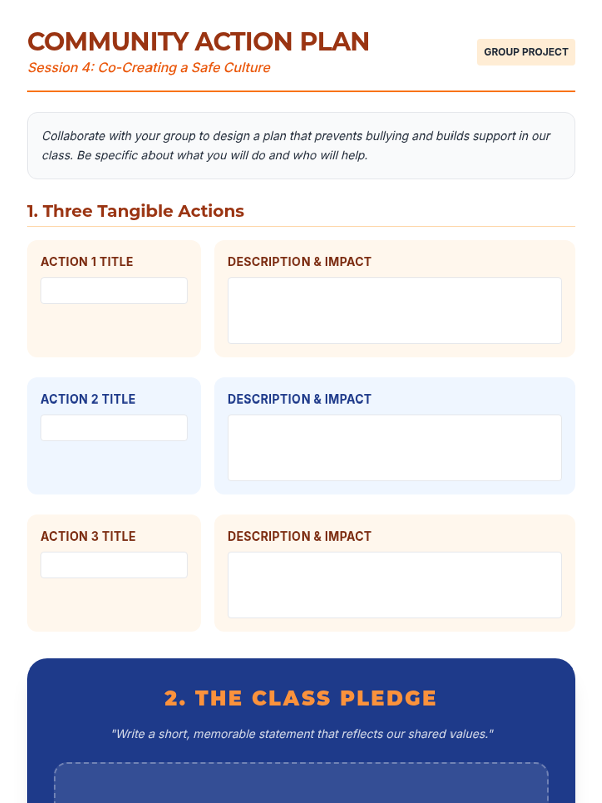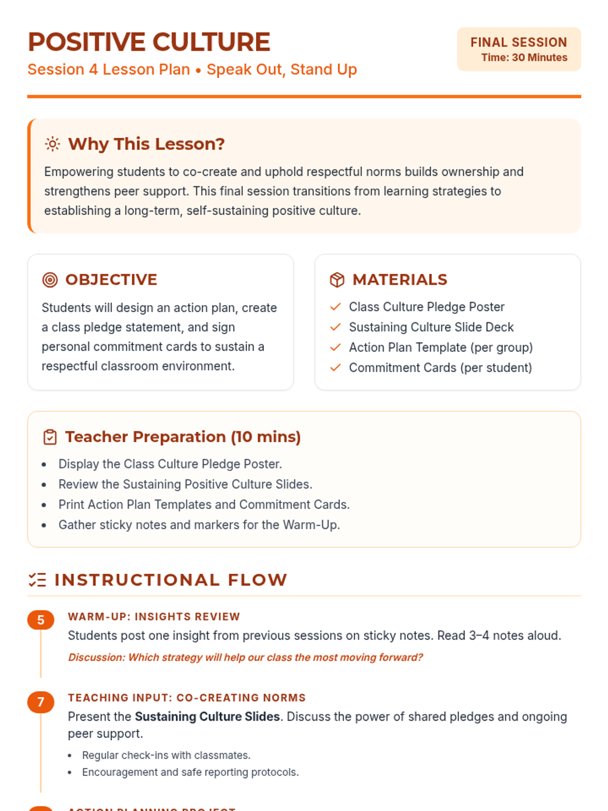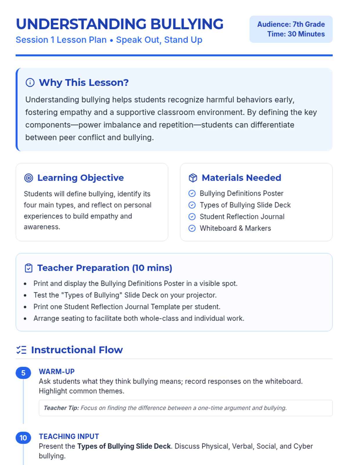 A 4-session unit empowering 7th graders to recognize, prevent, and respond to bullying through empathy, intervention strategies, and community building.