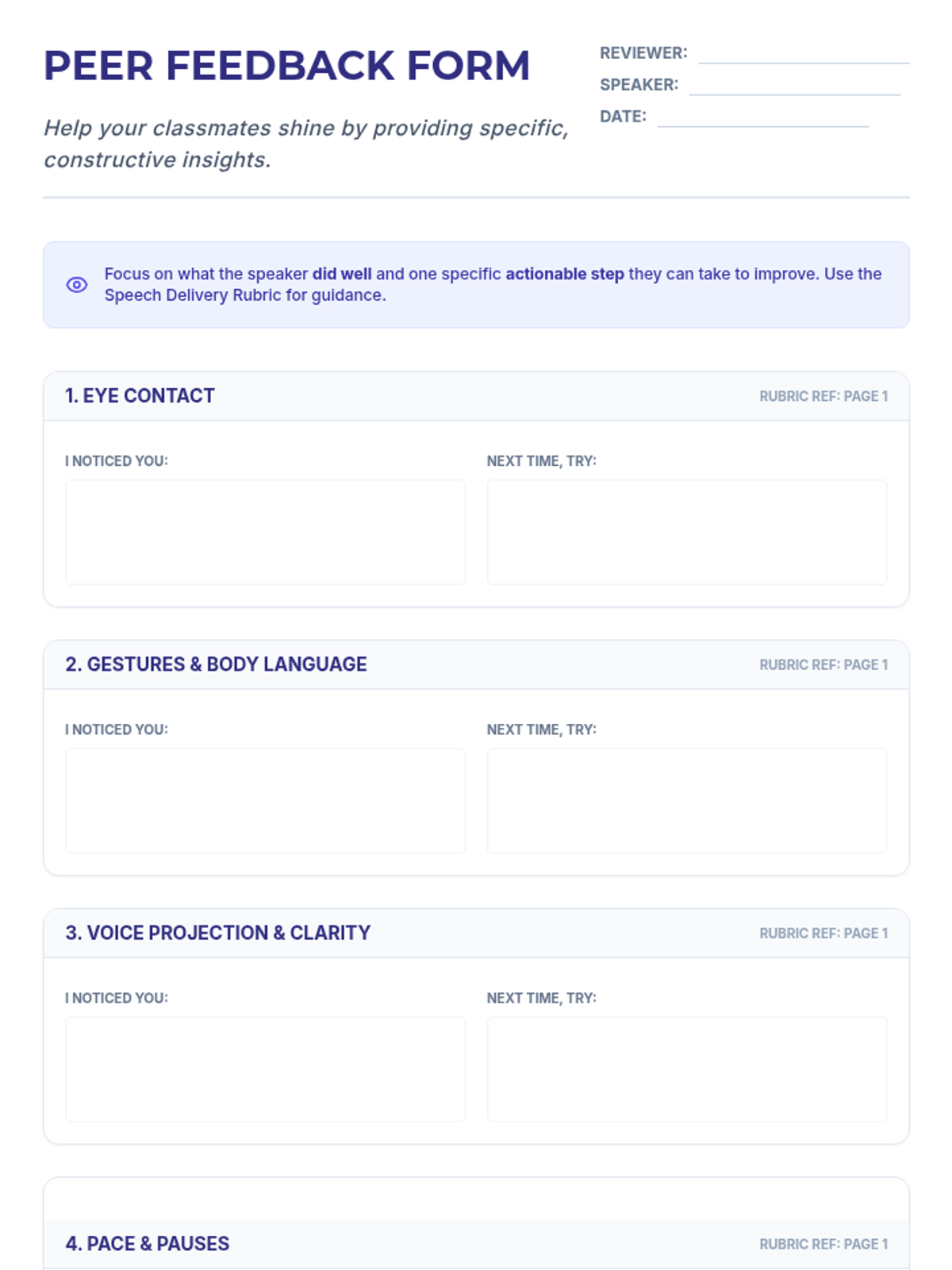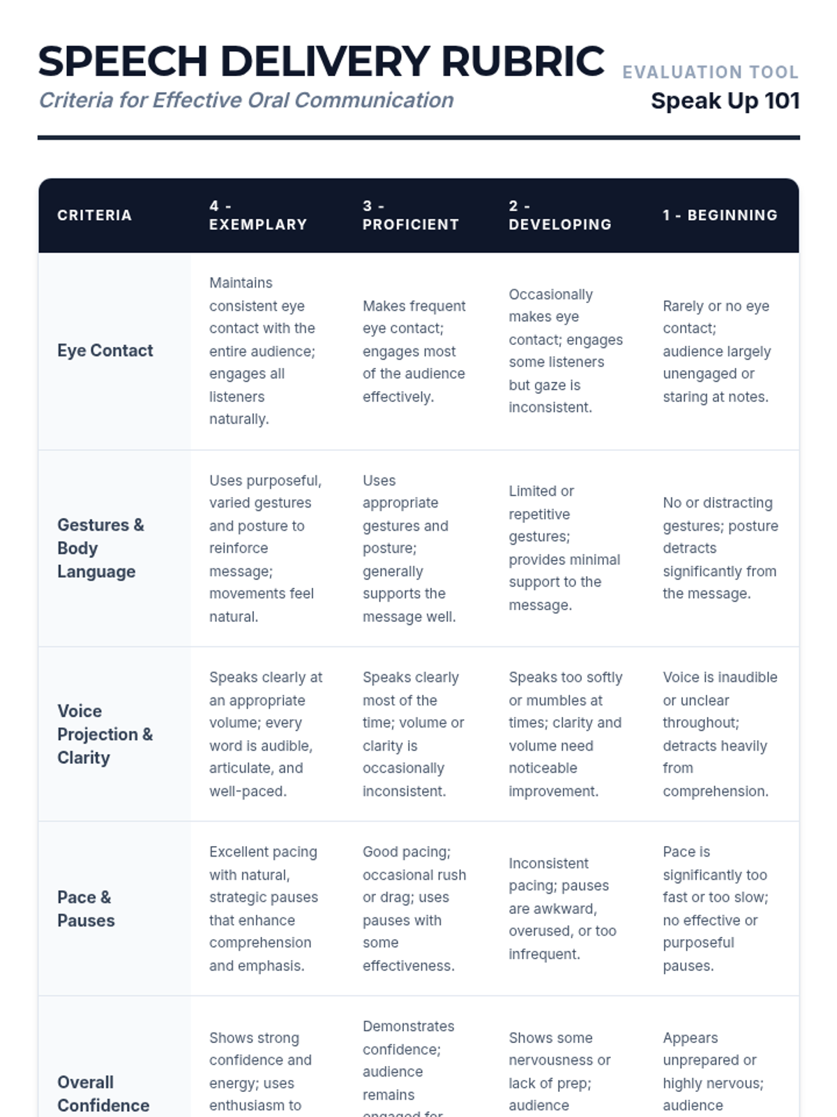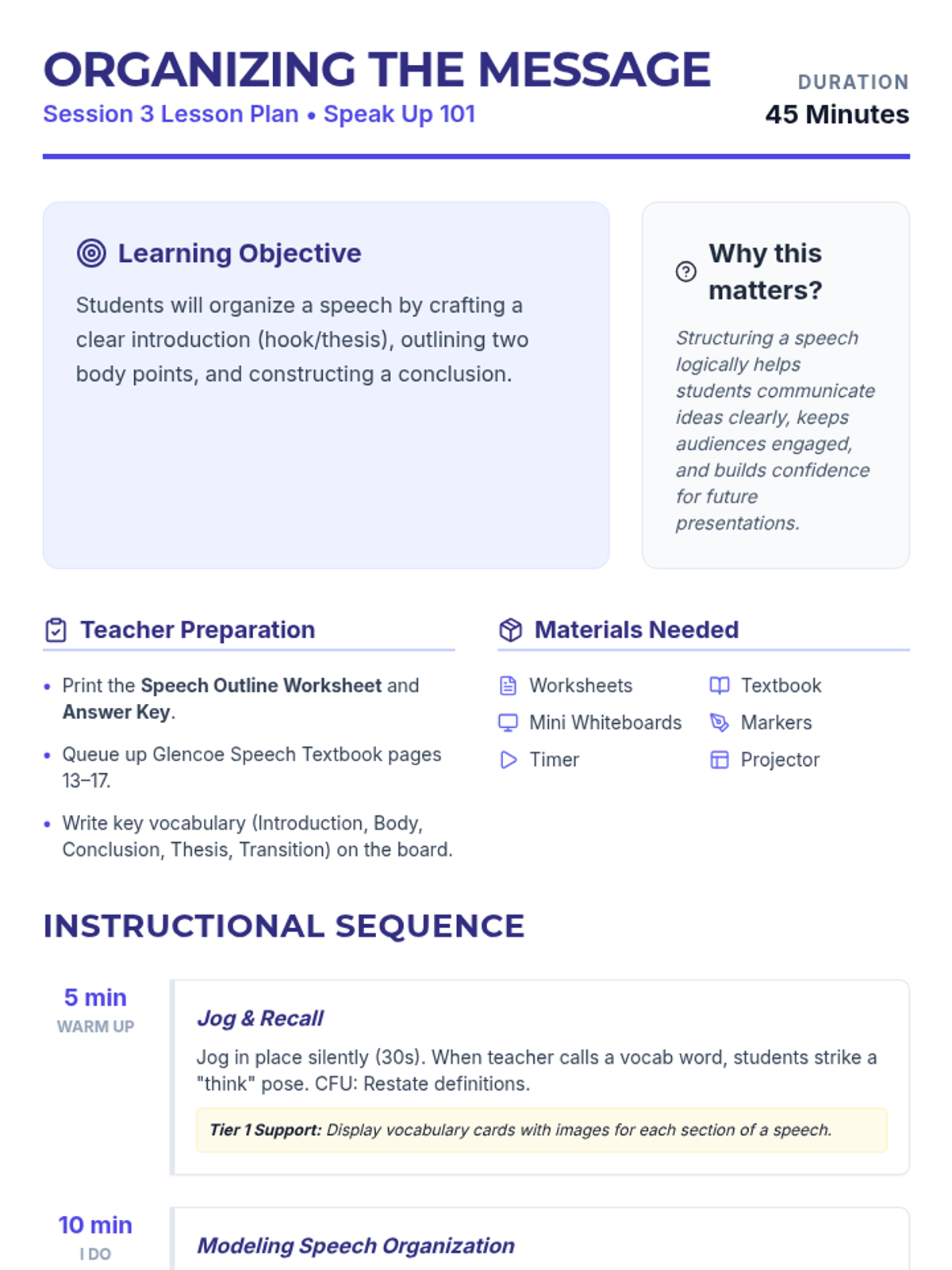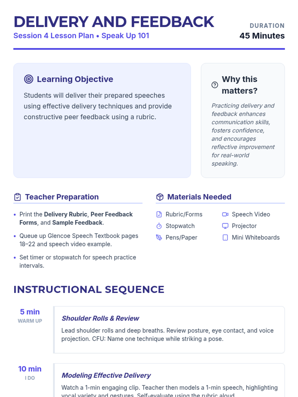A four-day unit for 9th grade students to master the fundamentals of oral communication, covering the communication process, topic selection, speech organization, and delivery techniques. Students engage in interactive activities and peer feedback to build confidence and clarity in their speaking skills.