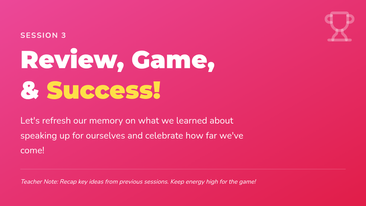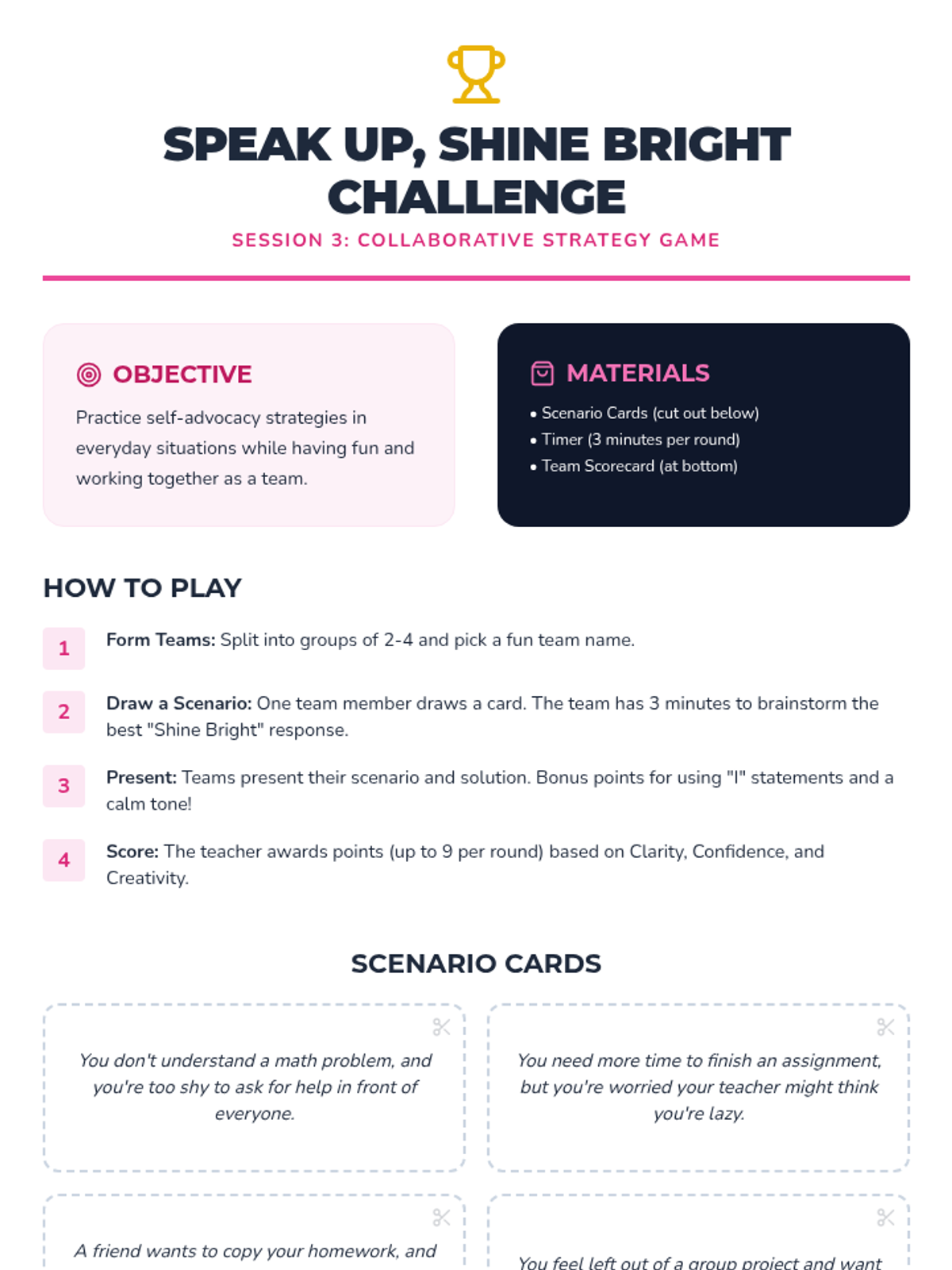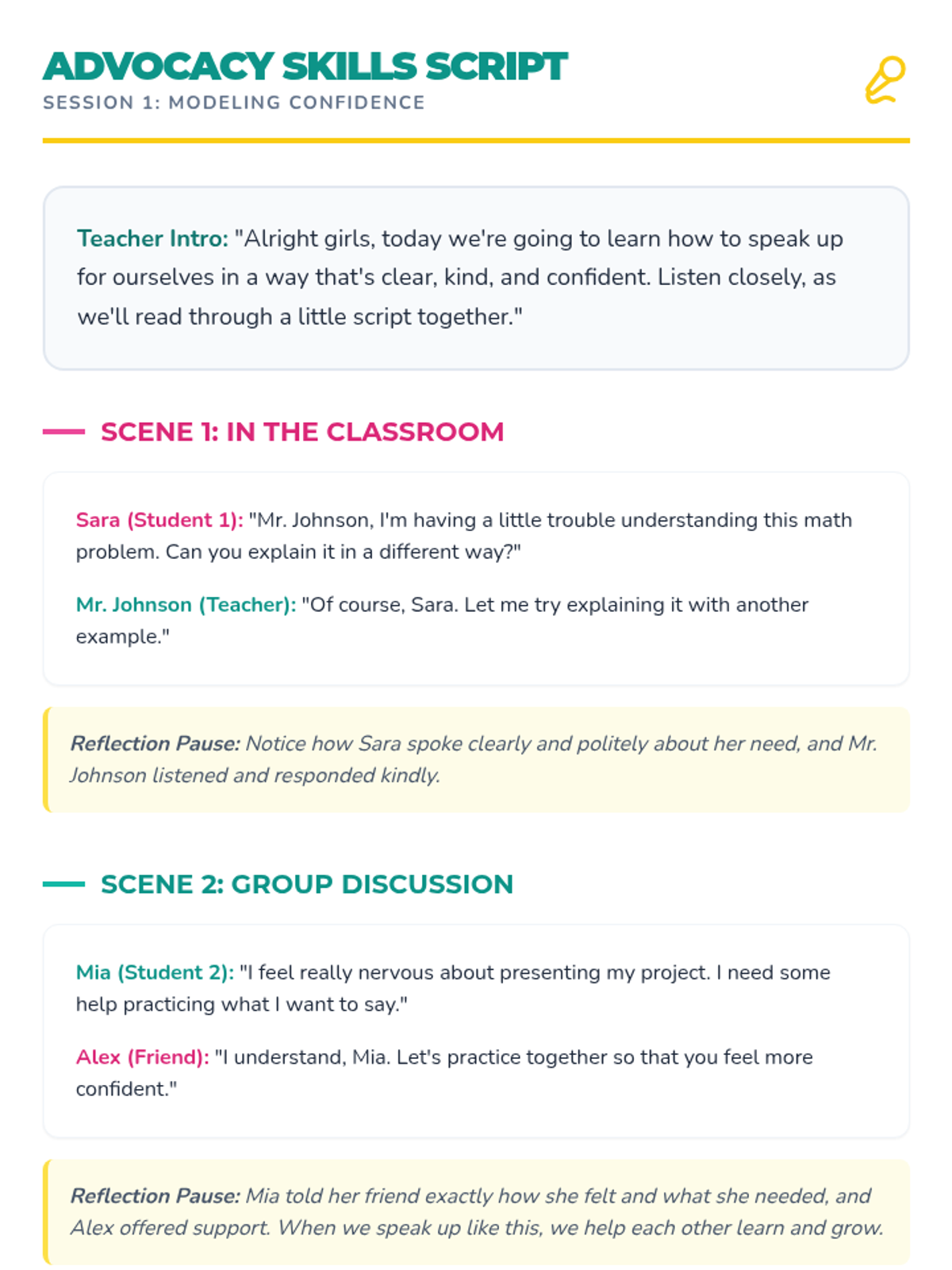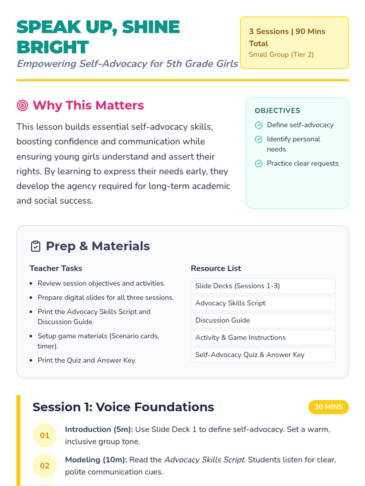 A 3-session small group unit for 5th-grade girls designed to build self-advocacy skills, confidence, and effective communication through interactive discussions, role-playing, and games.