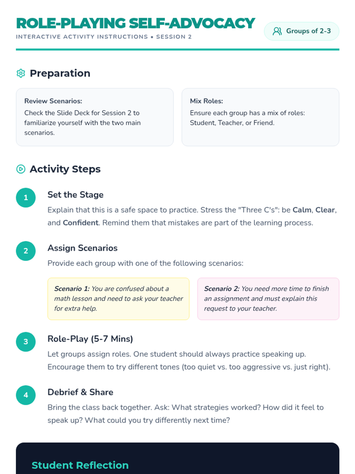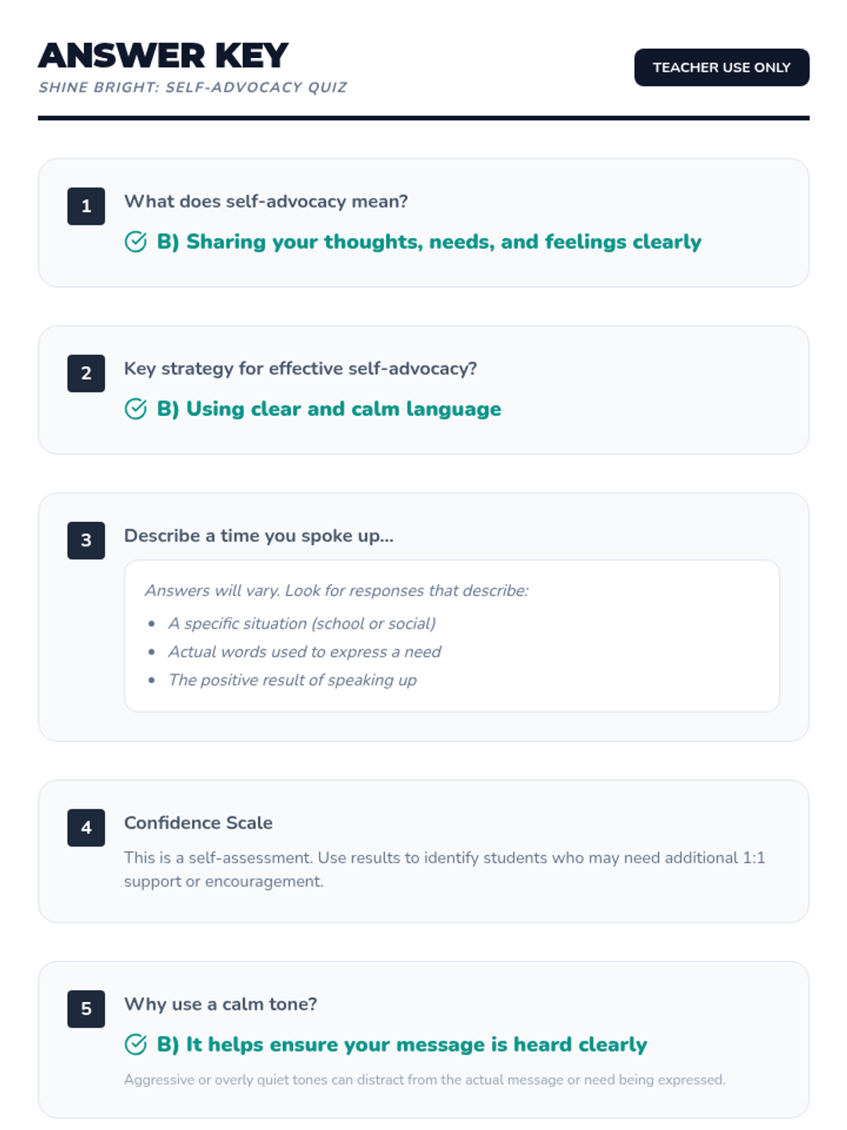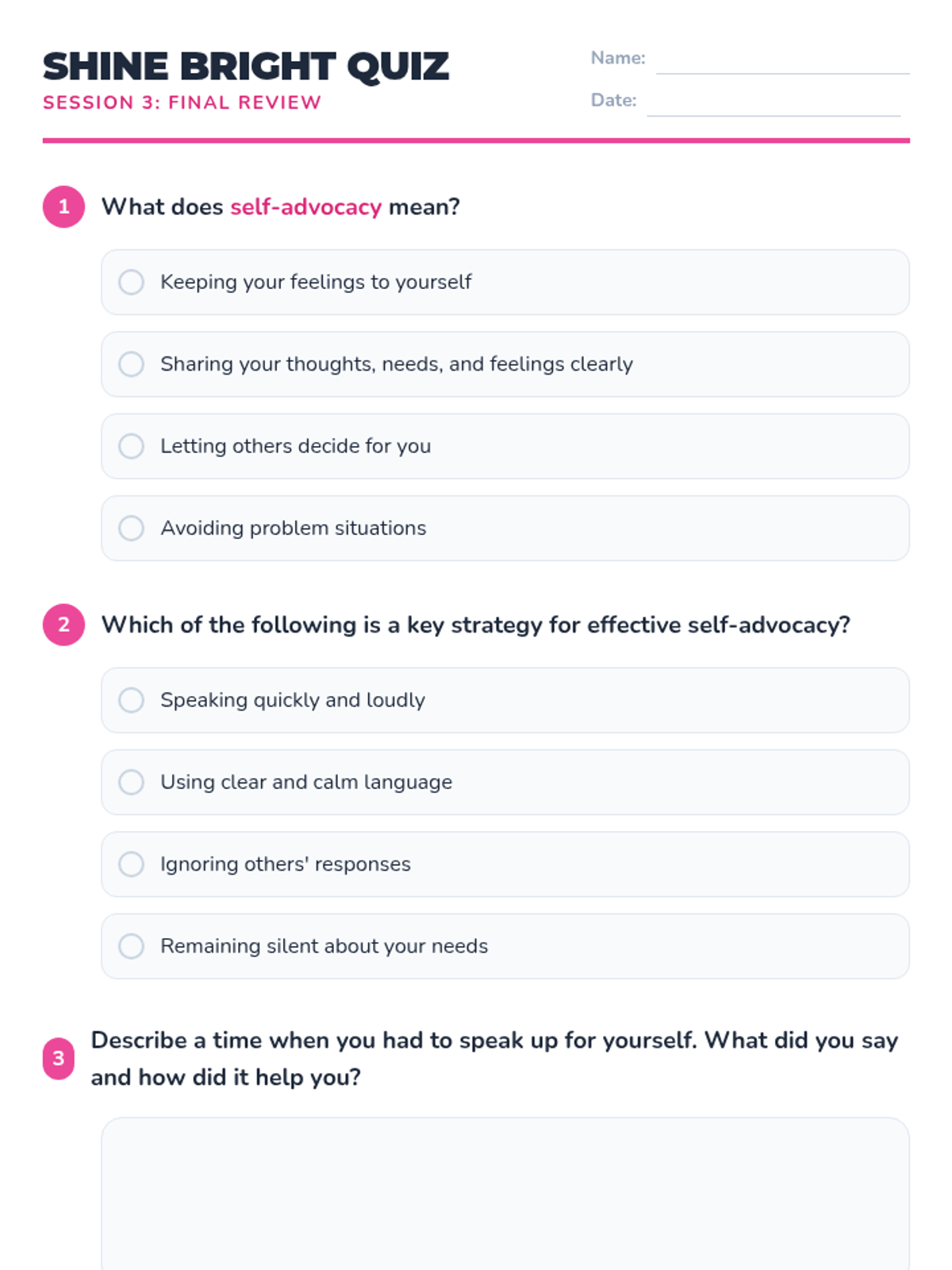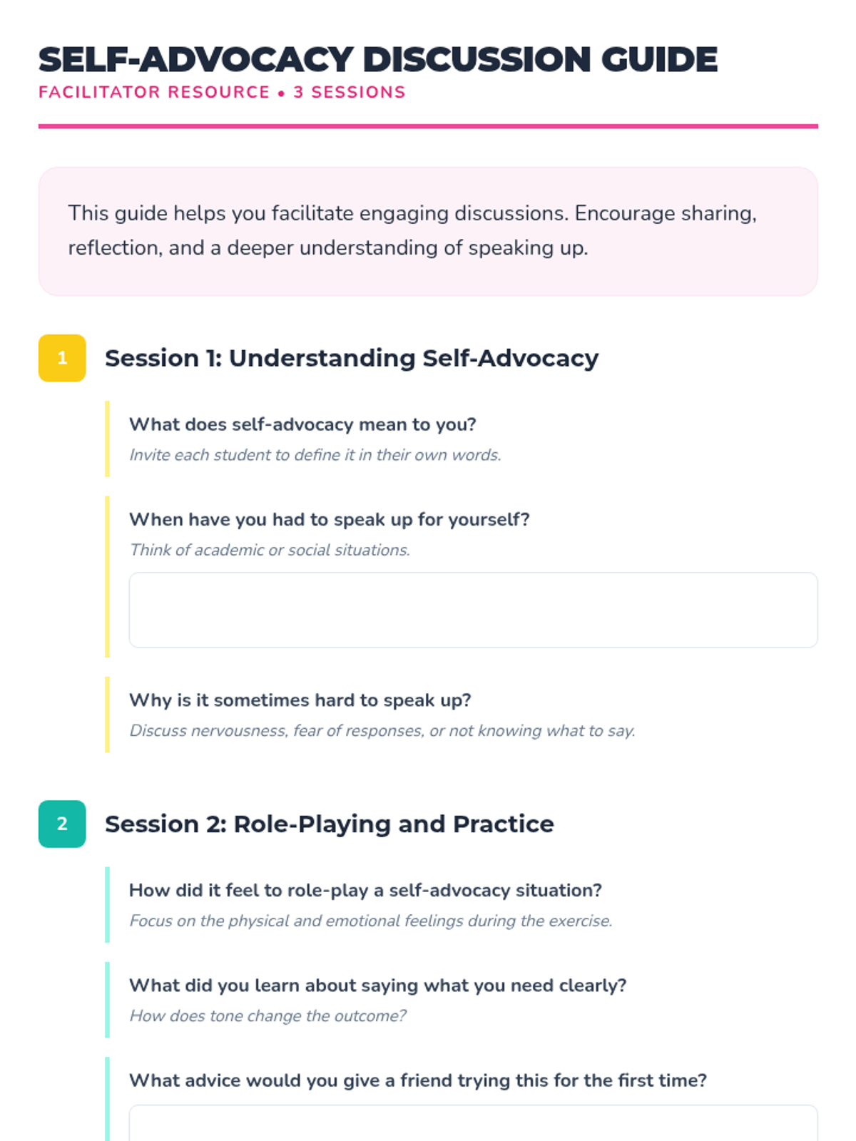 A 3-session small group unit for 5th-grade girls designed to build self-advocacy skills, confidence, and effective communication through interactive discussions, role-playing, and games.