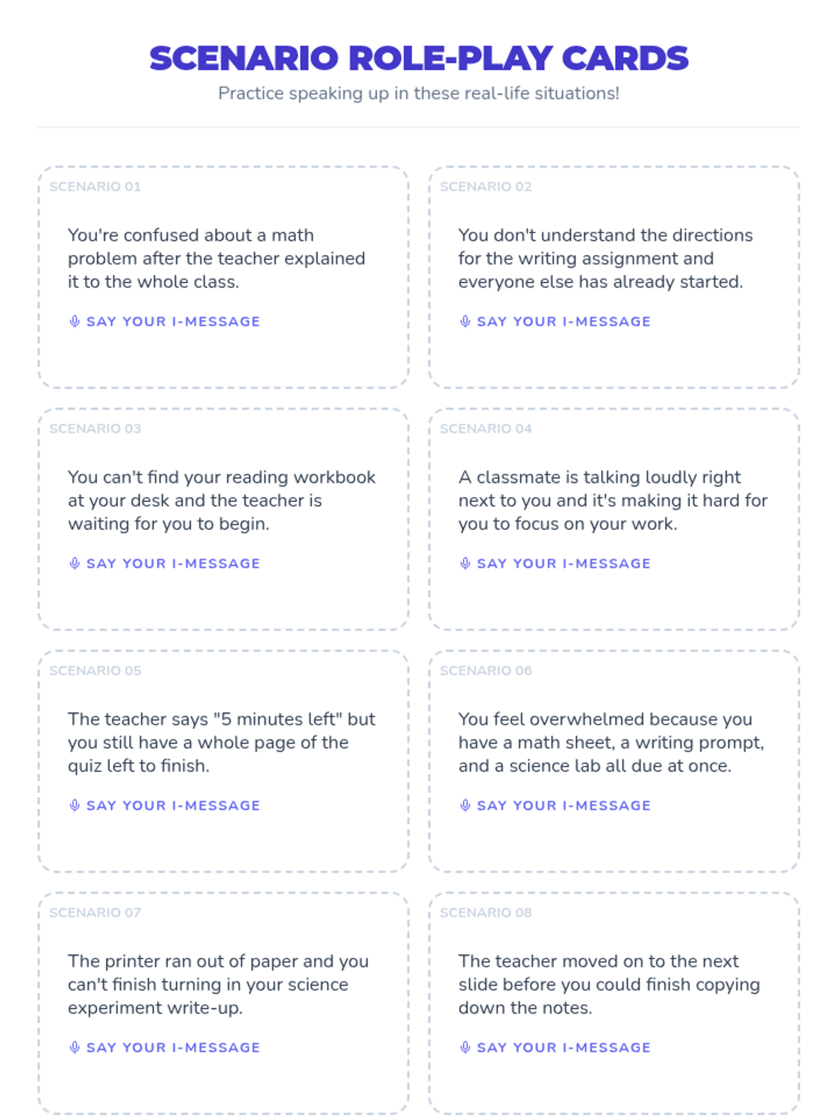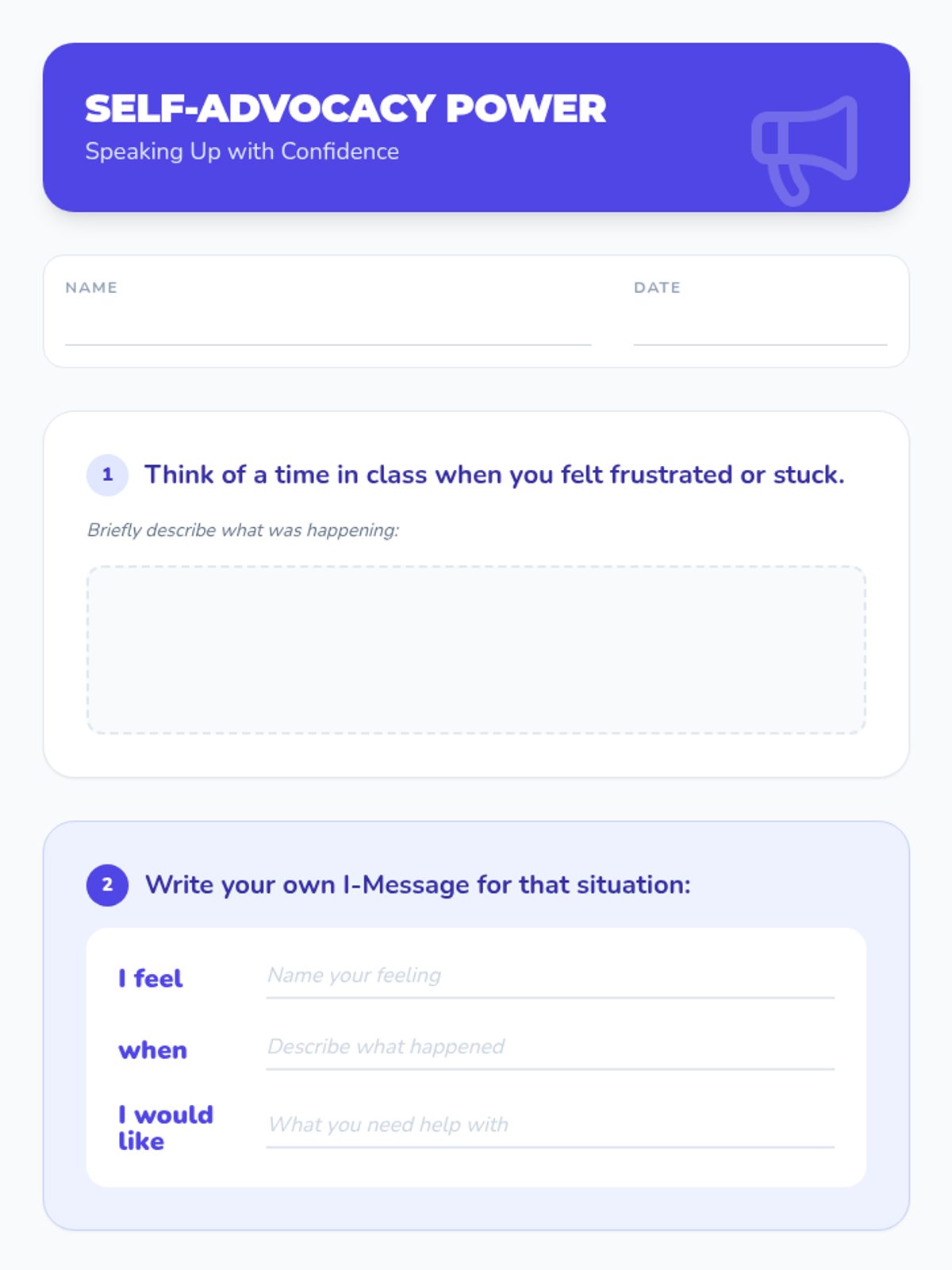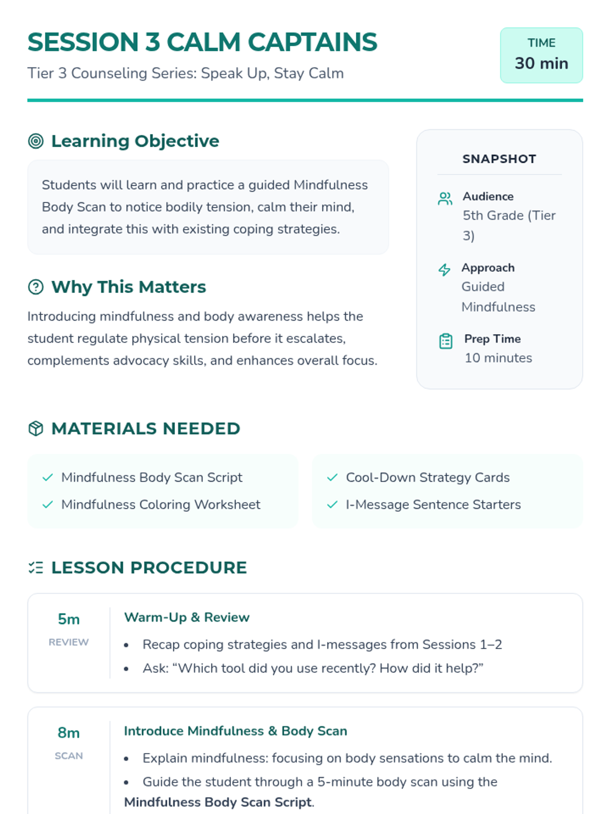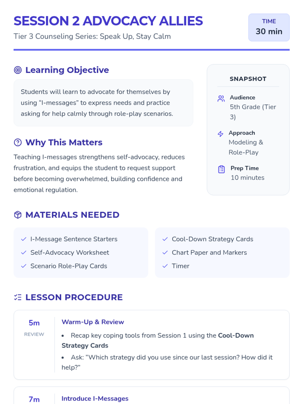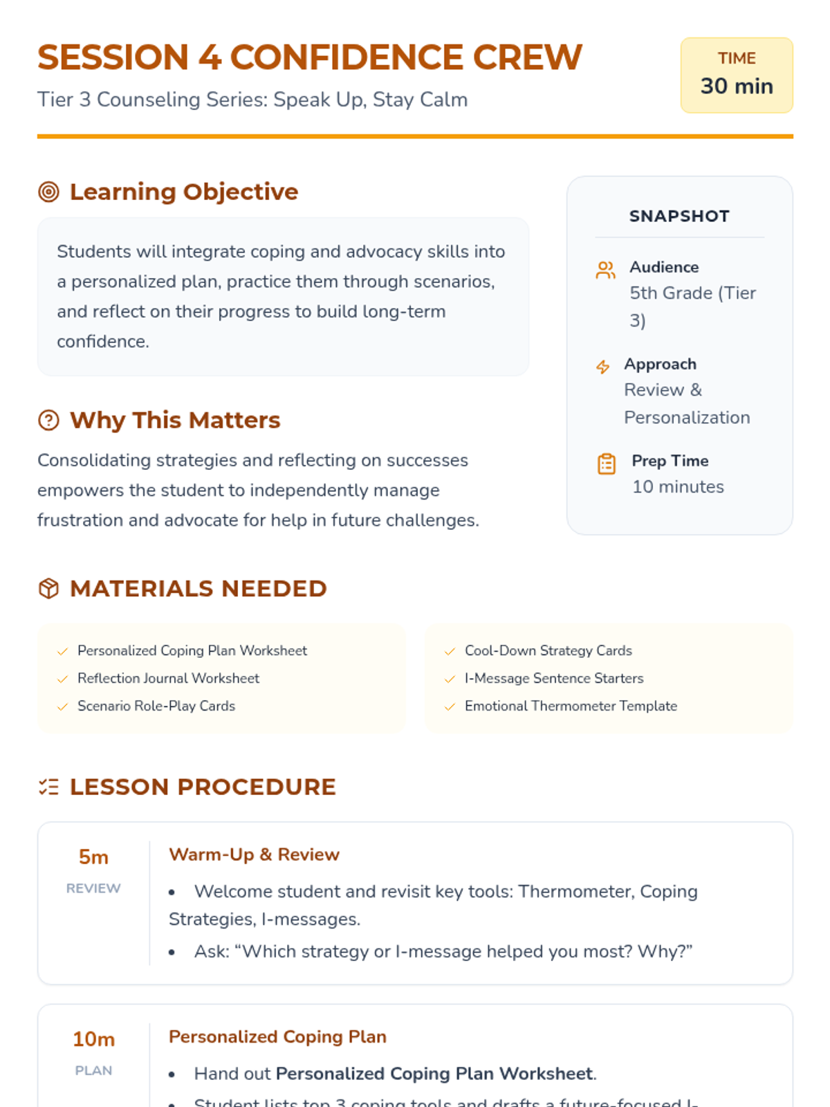 A 4-session Tier 3 counseling series for a 5th grader focused on building self-advocacy skills, managing frustration through coping strategies, and replacing emotional overwhelm with confident communication. Each session includes interactive activities, guided practice, and portable tools for classroom use.