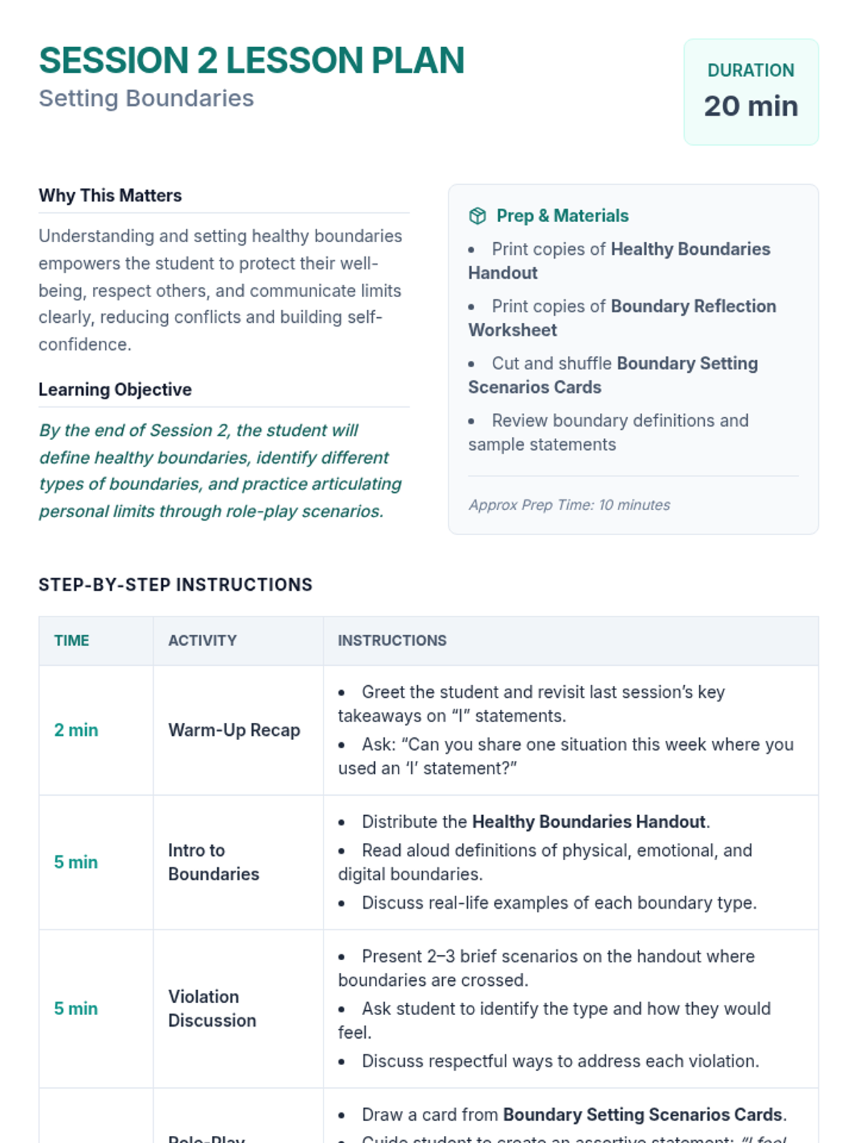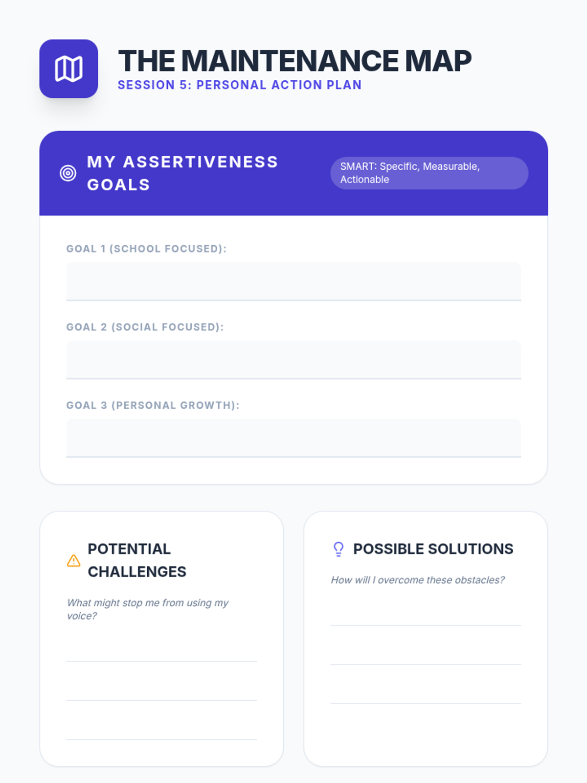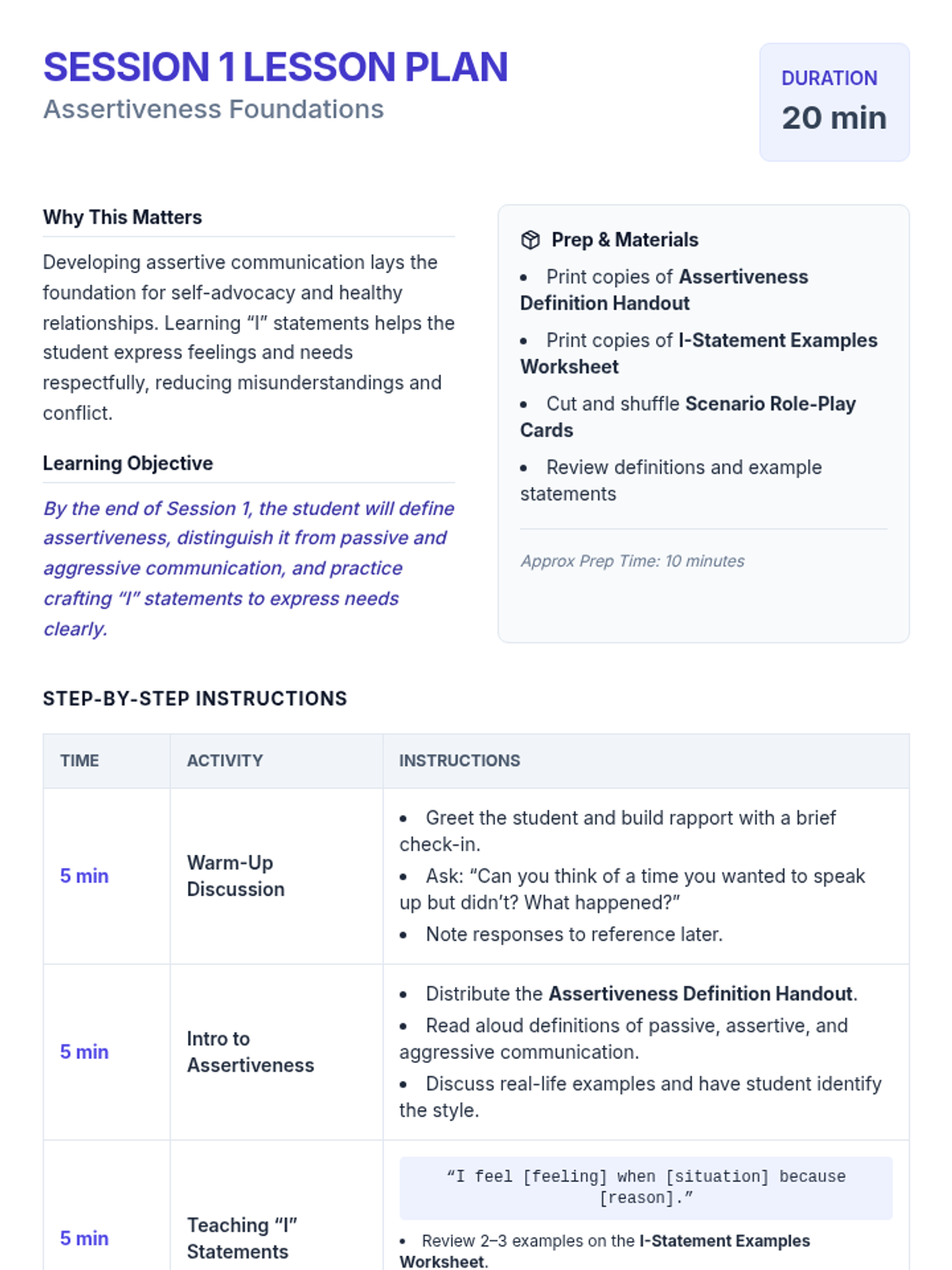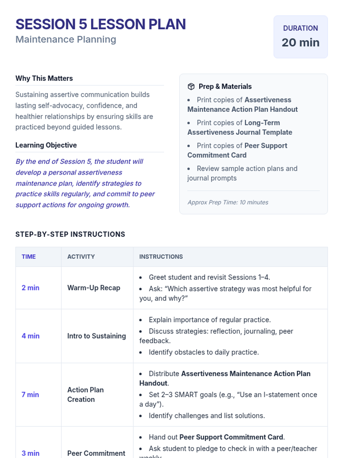 A 5-session individual Tier 3 intervention sequence designed to help middle school students develop assertive communication, set boundaries, and advocate for themselves confidently.