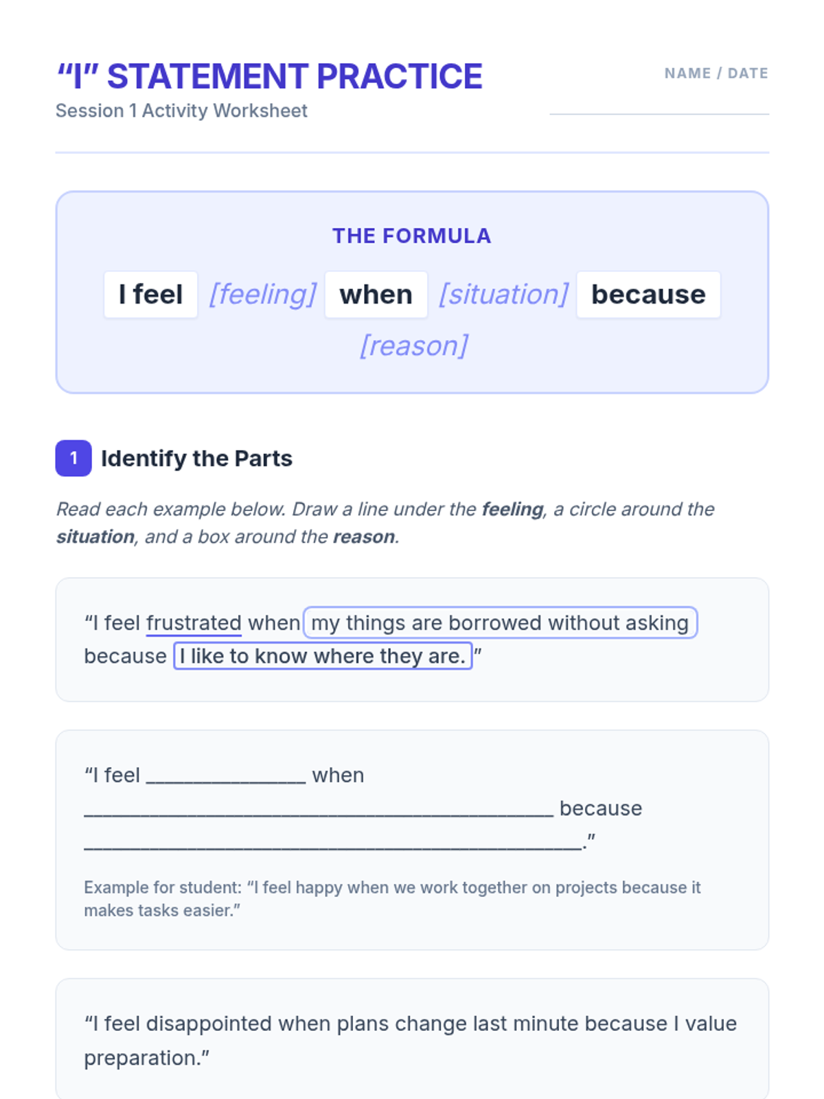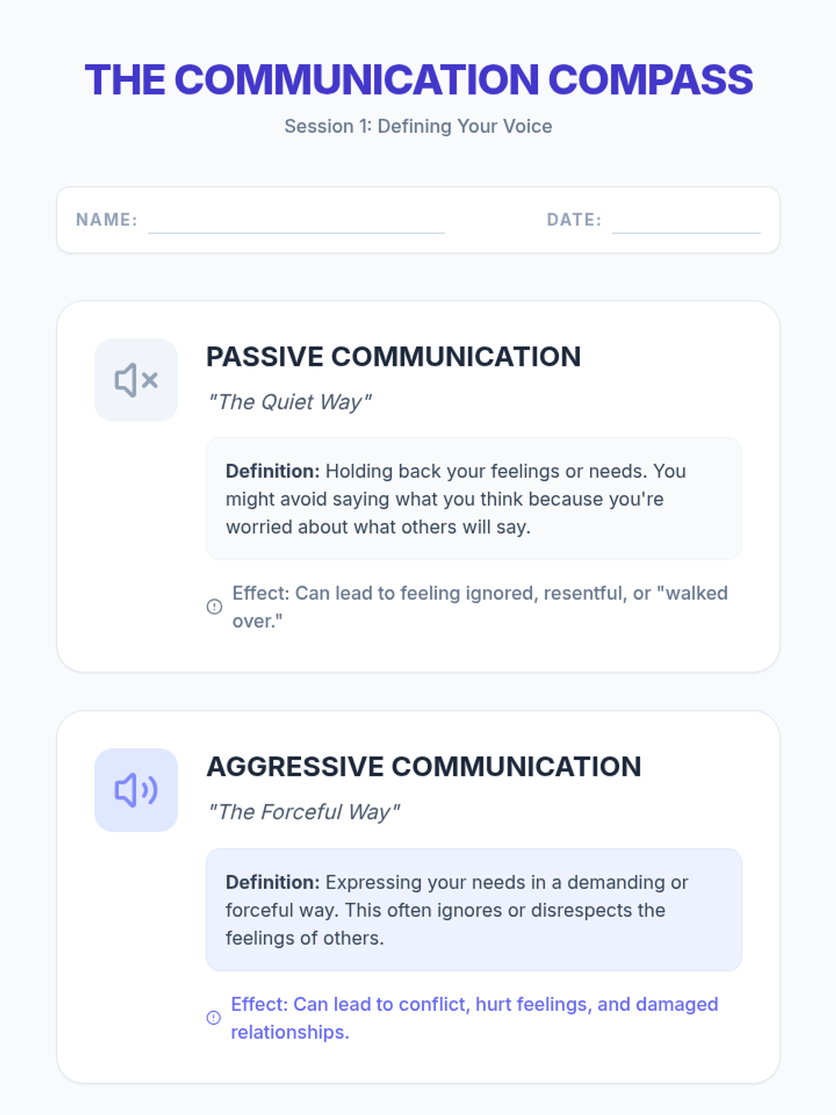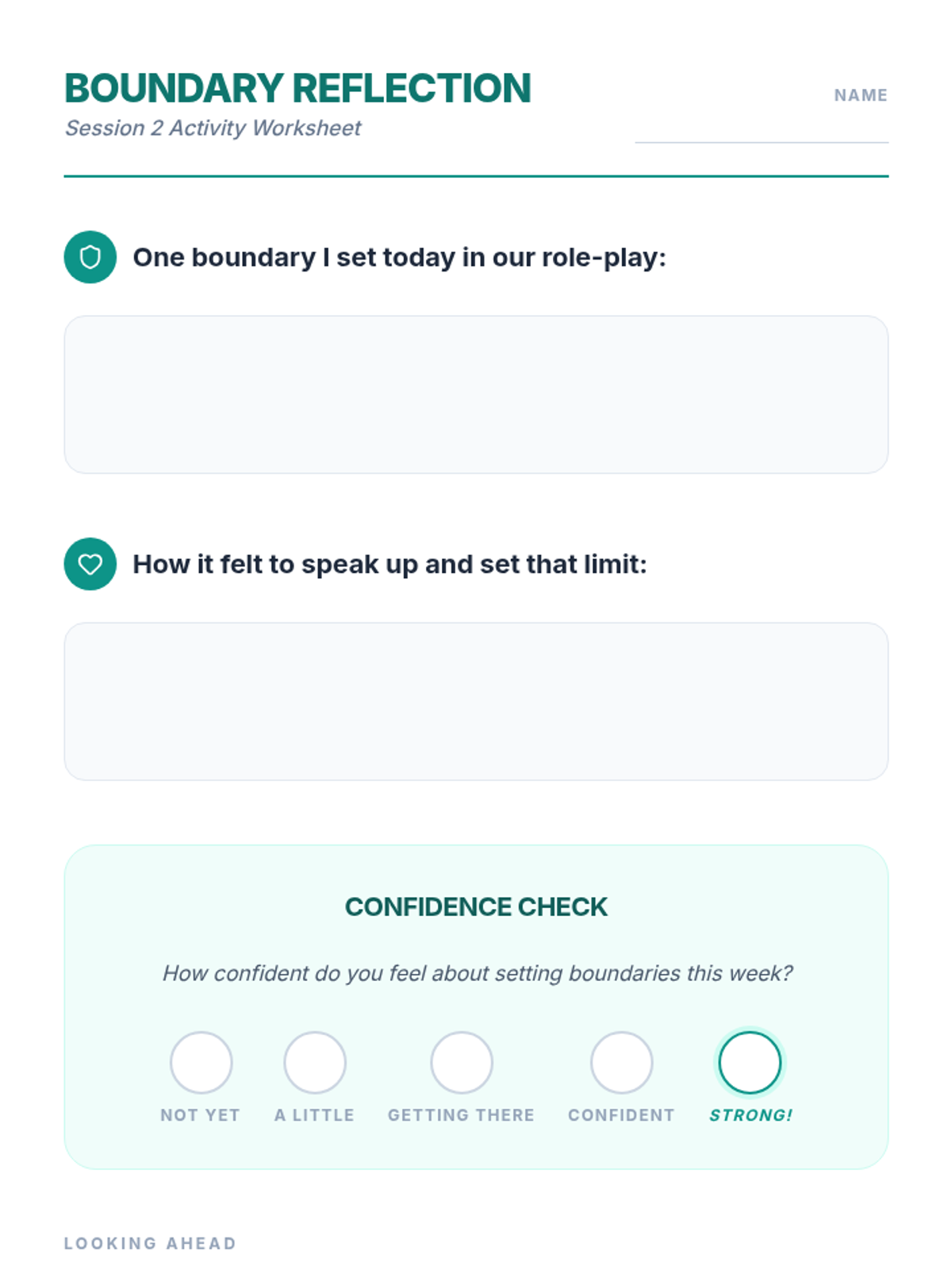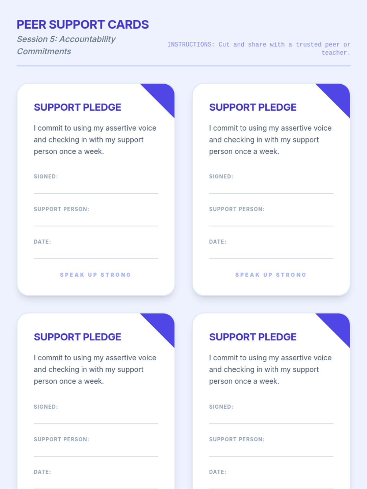 A 5-session individual Tier 3 intervention sequence designed to help middle school students develop assertive communication, set boundaries, and advocate for themselves confidently.