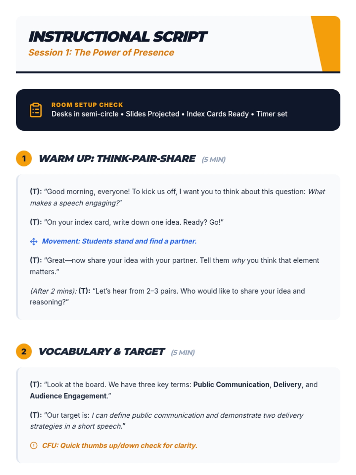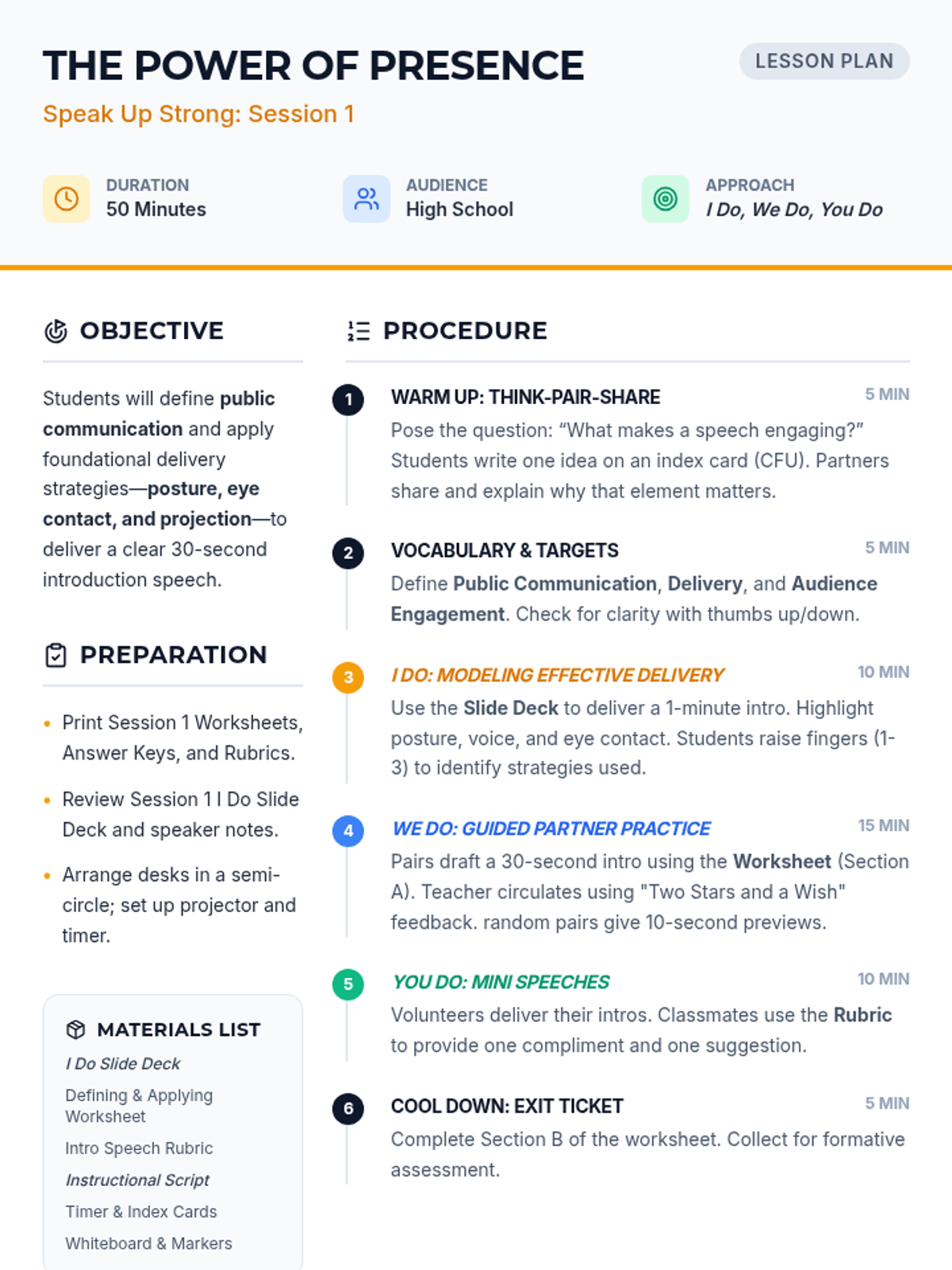 A high school oral communication unit that uses the I Do, We Do, You Do model to teach foundational public speaking skills, delivery strategies, and audience engagement.