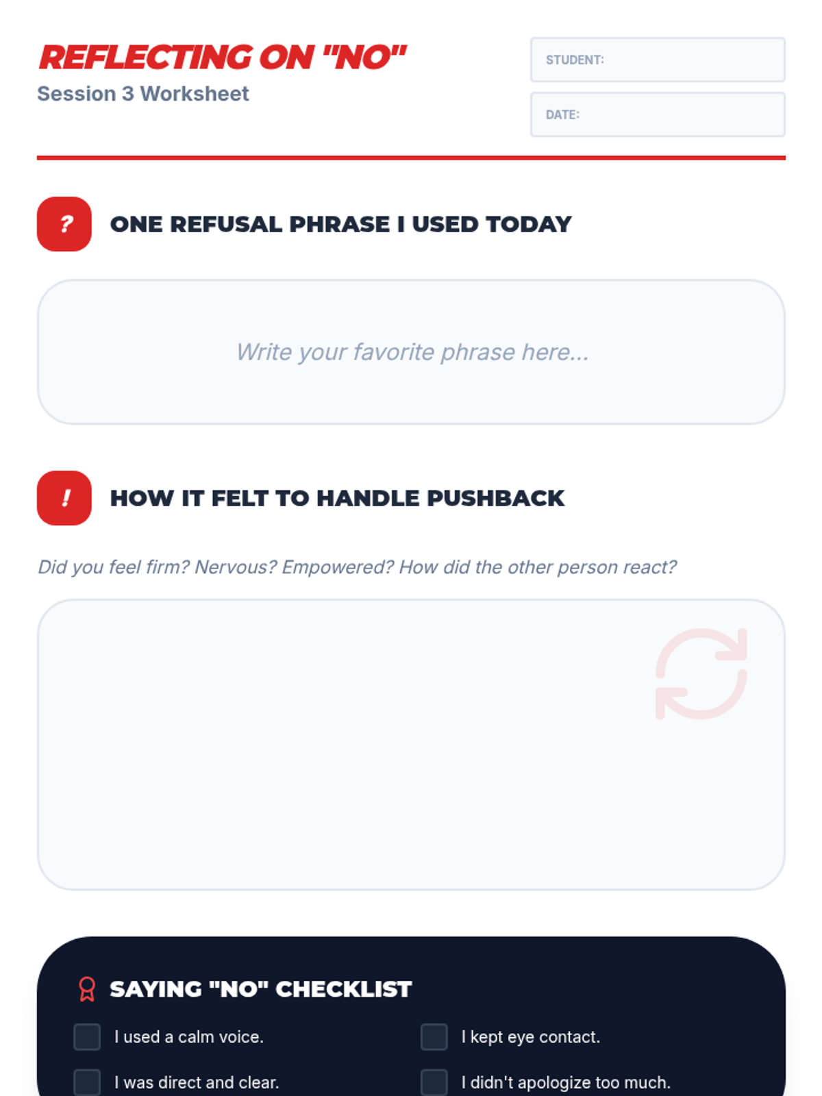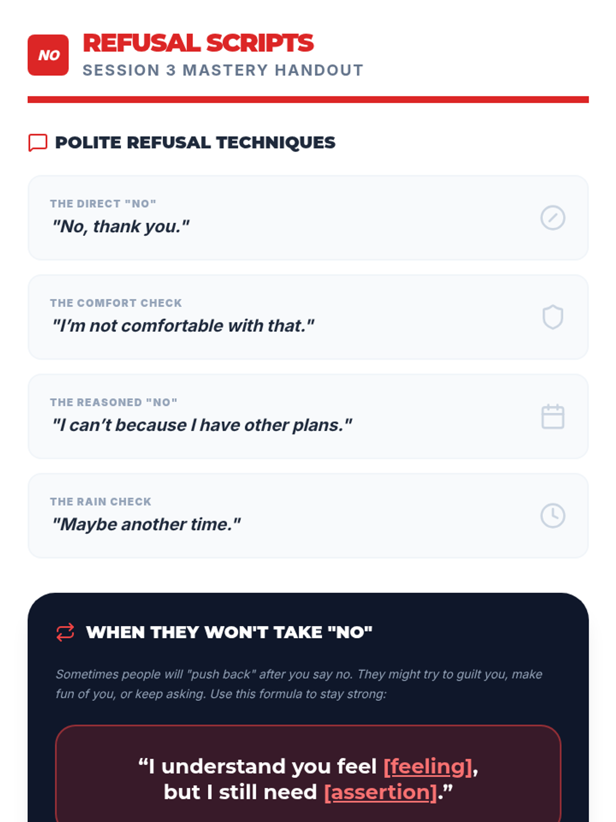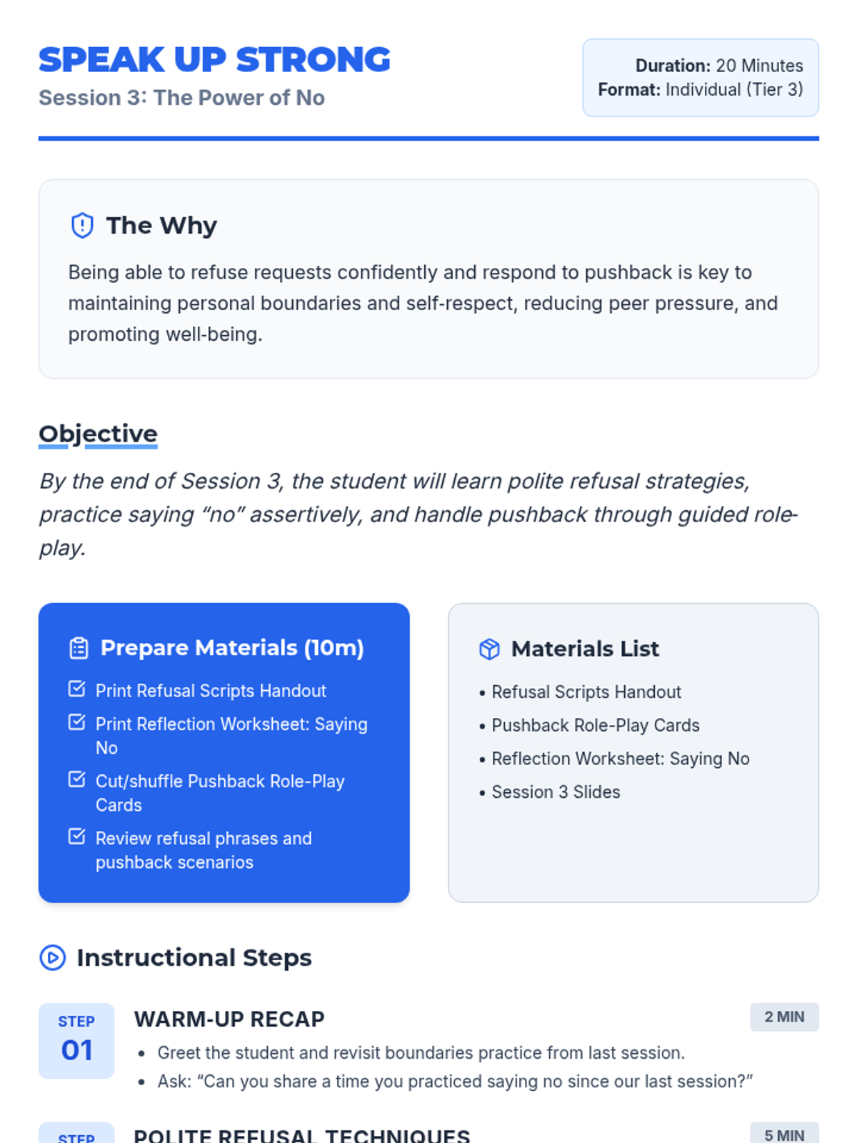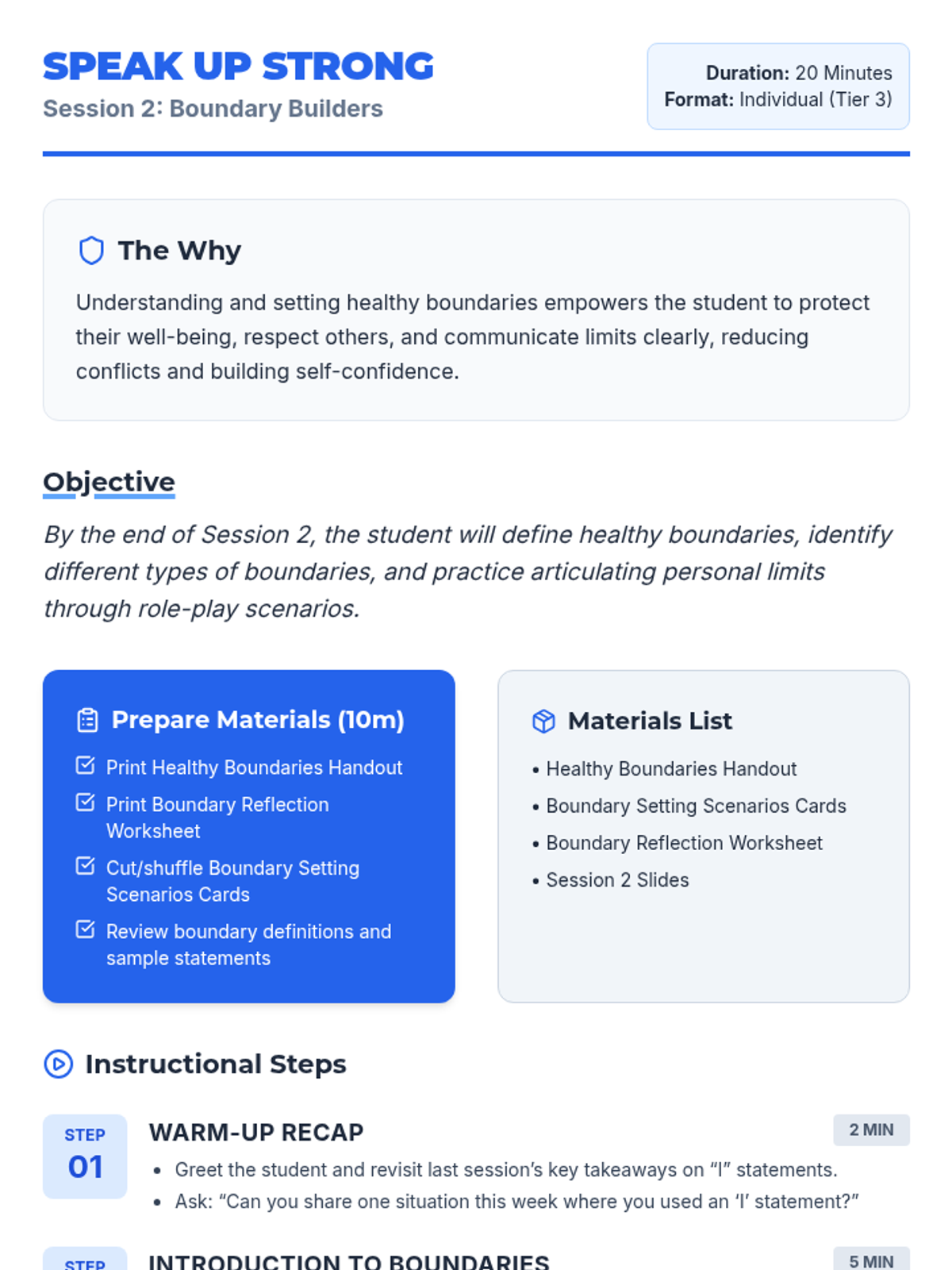 A 5-session individual Tier 3 program designed to help middle school students develop assertive communication, set healthy boundaries, and build self-advocacy skills through role-play and reflection.