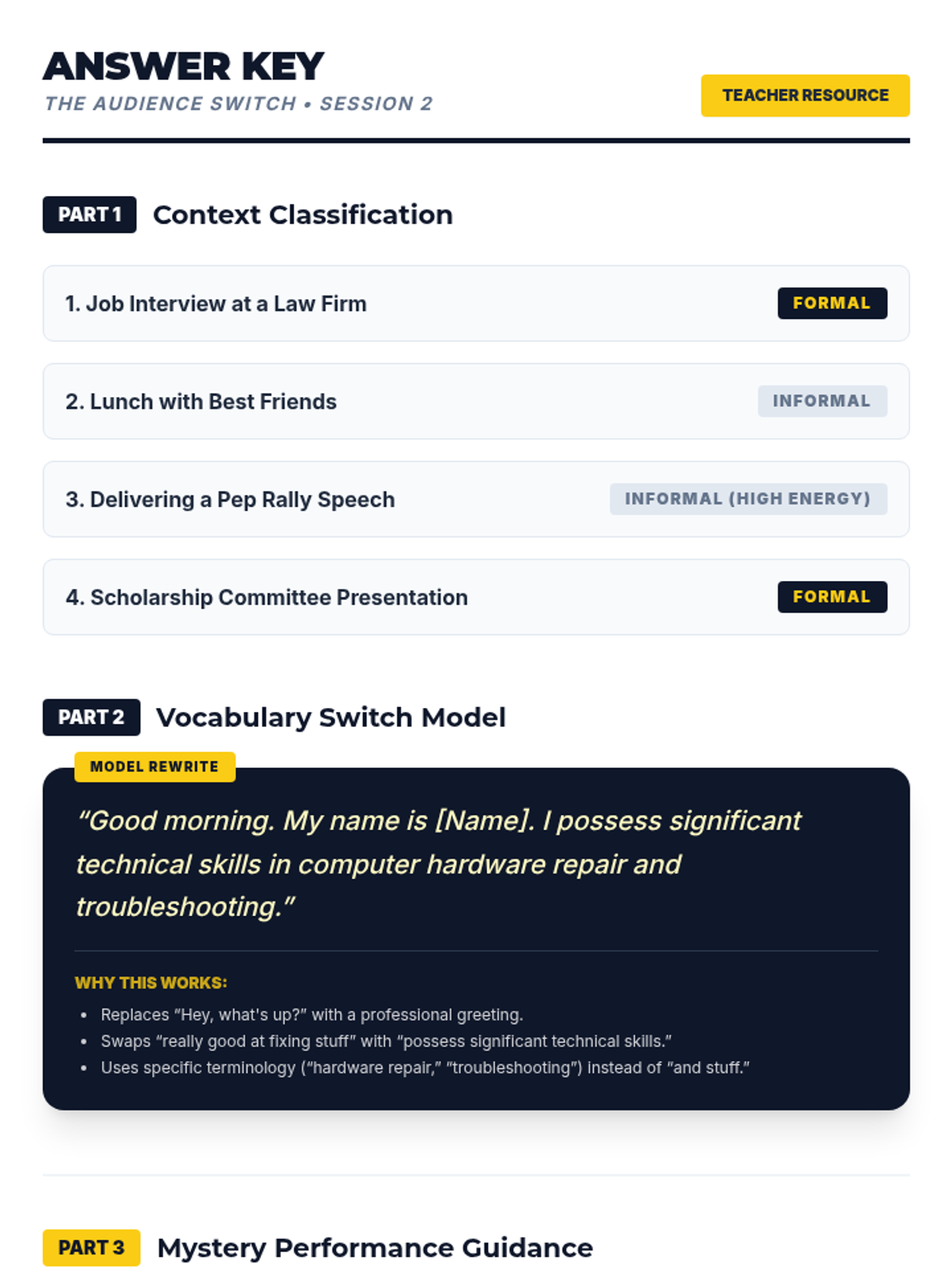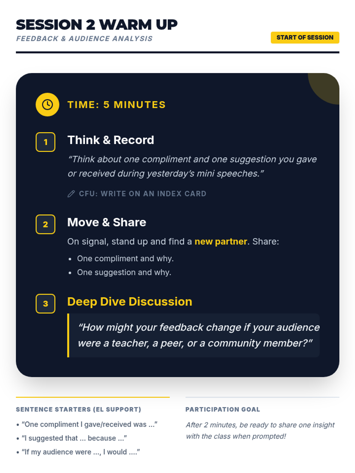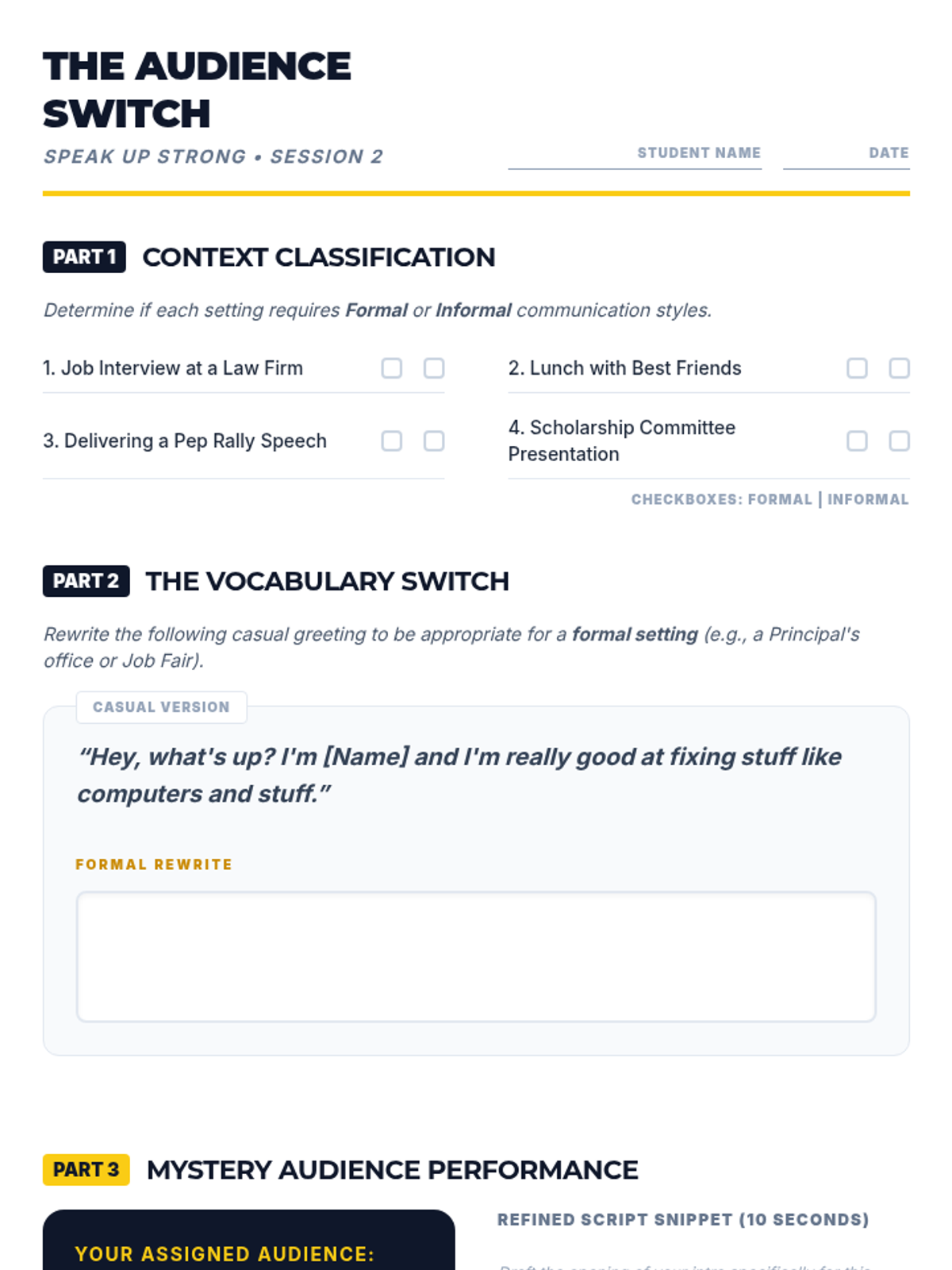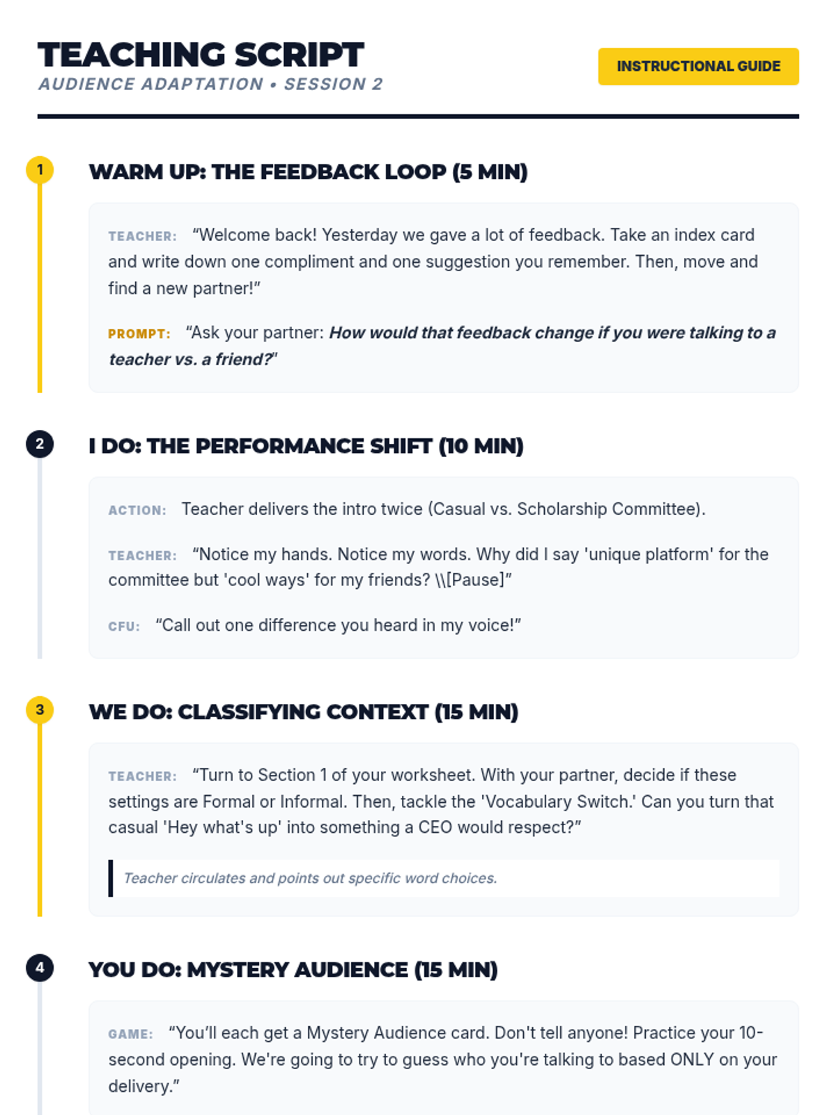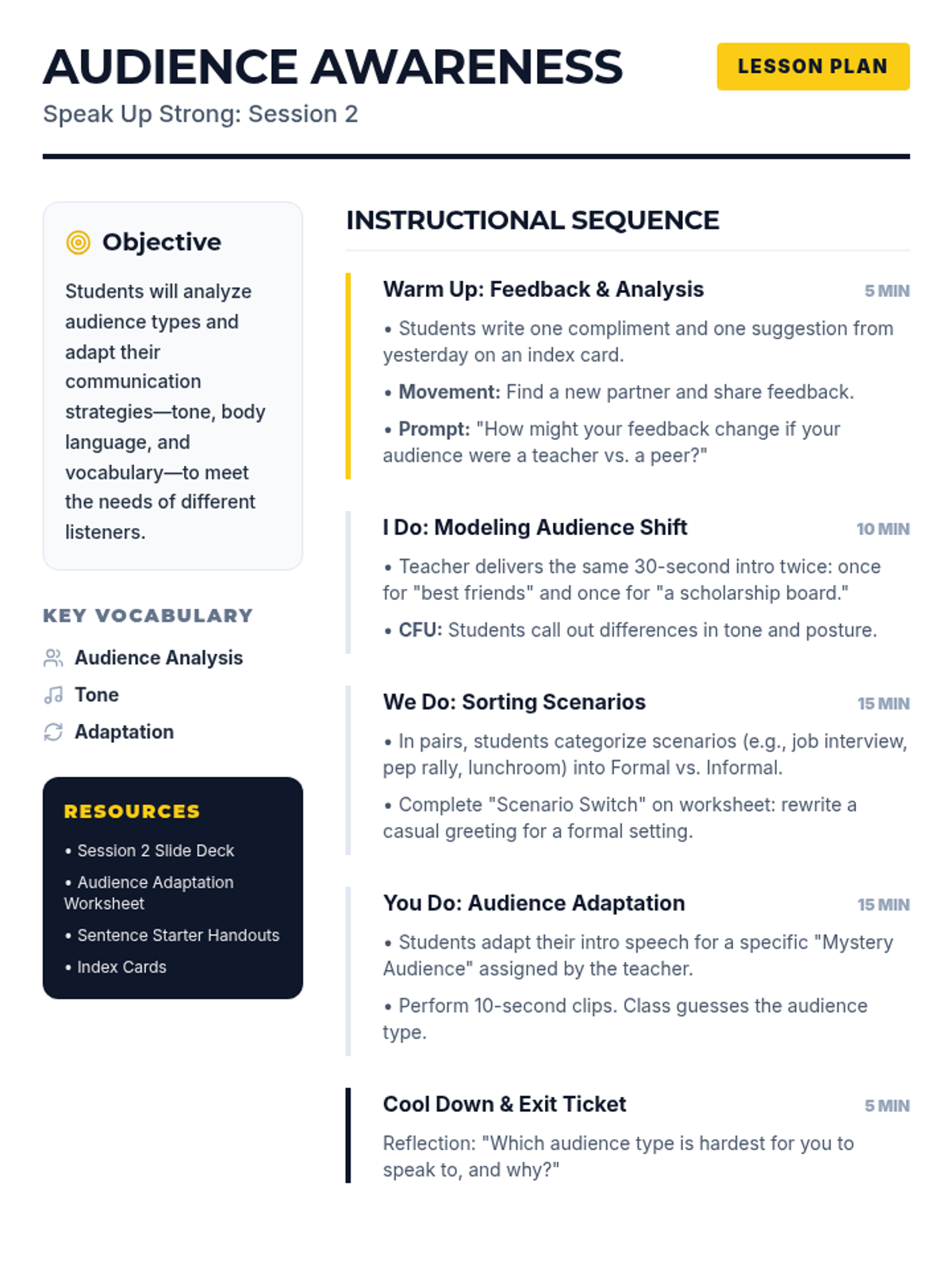 A three-session high school unit focused on mastering public communication through delivery strategies, audience analysis, and practical application. Students progress from basic delivery mechanics to adapting speeches for different audiences.