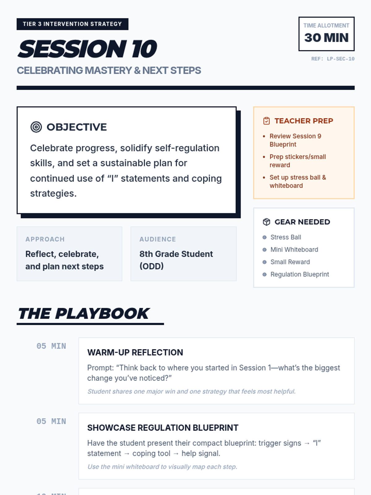 A comprehensive 10-session Tier 3 counseling series for an 8th-grade student with ODD, focusing on emotional literacy, 'I' statements, and self-regulation blueprints.