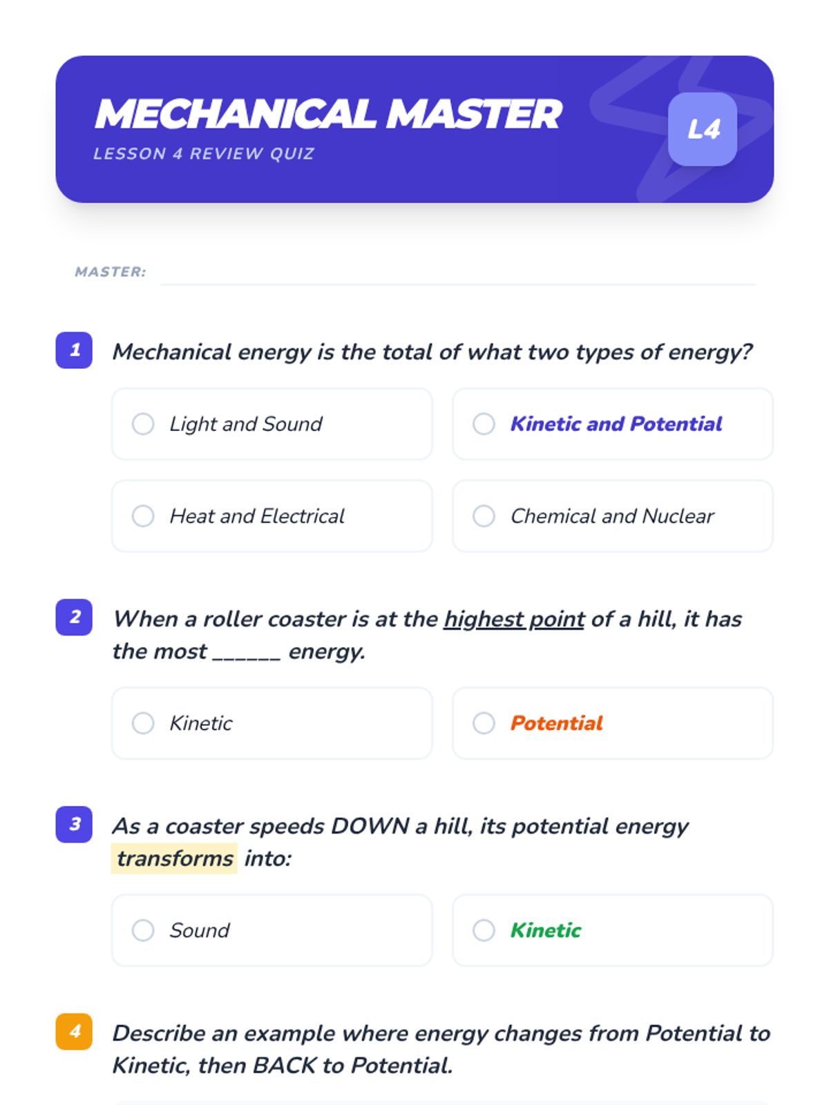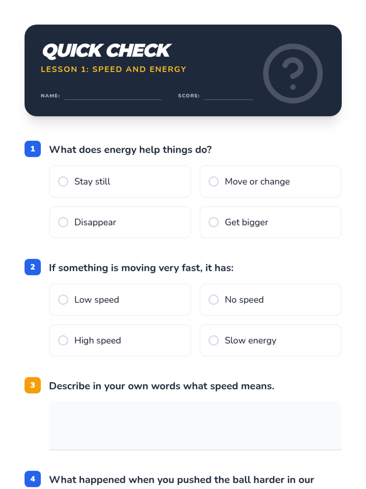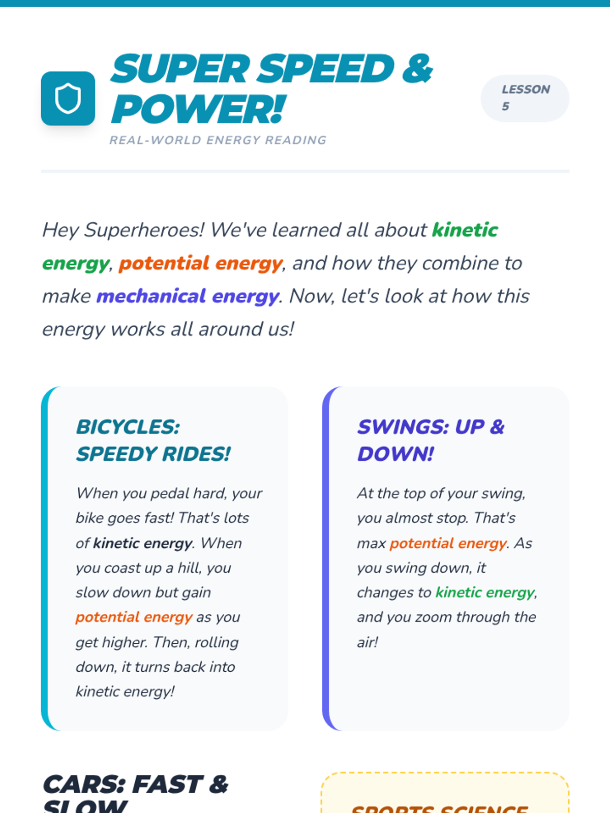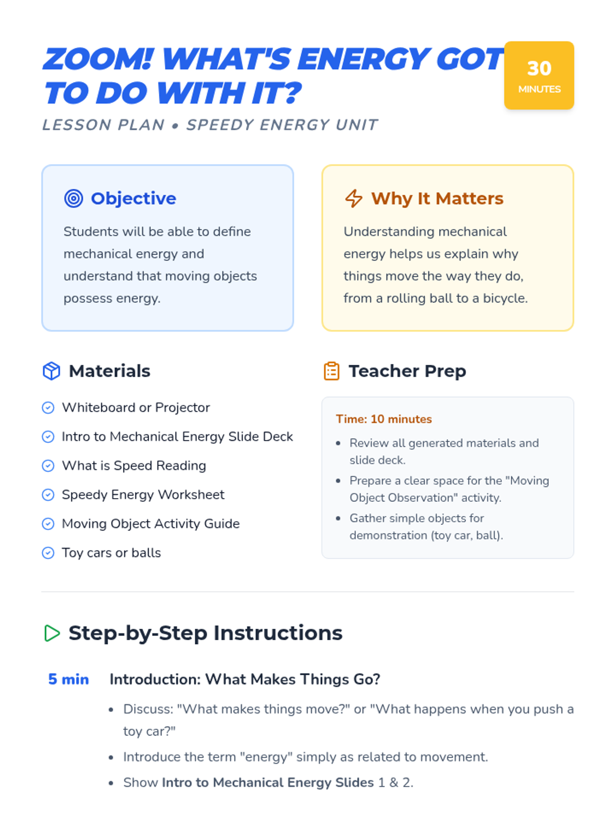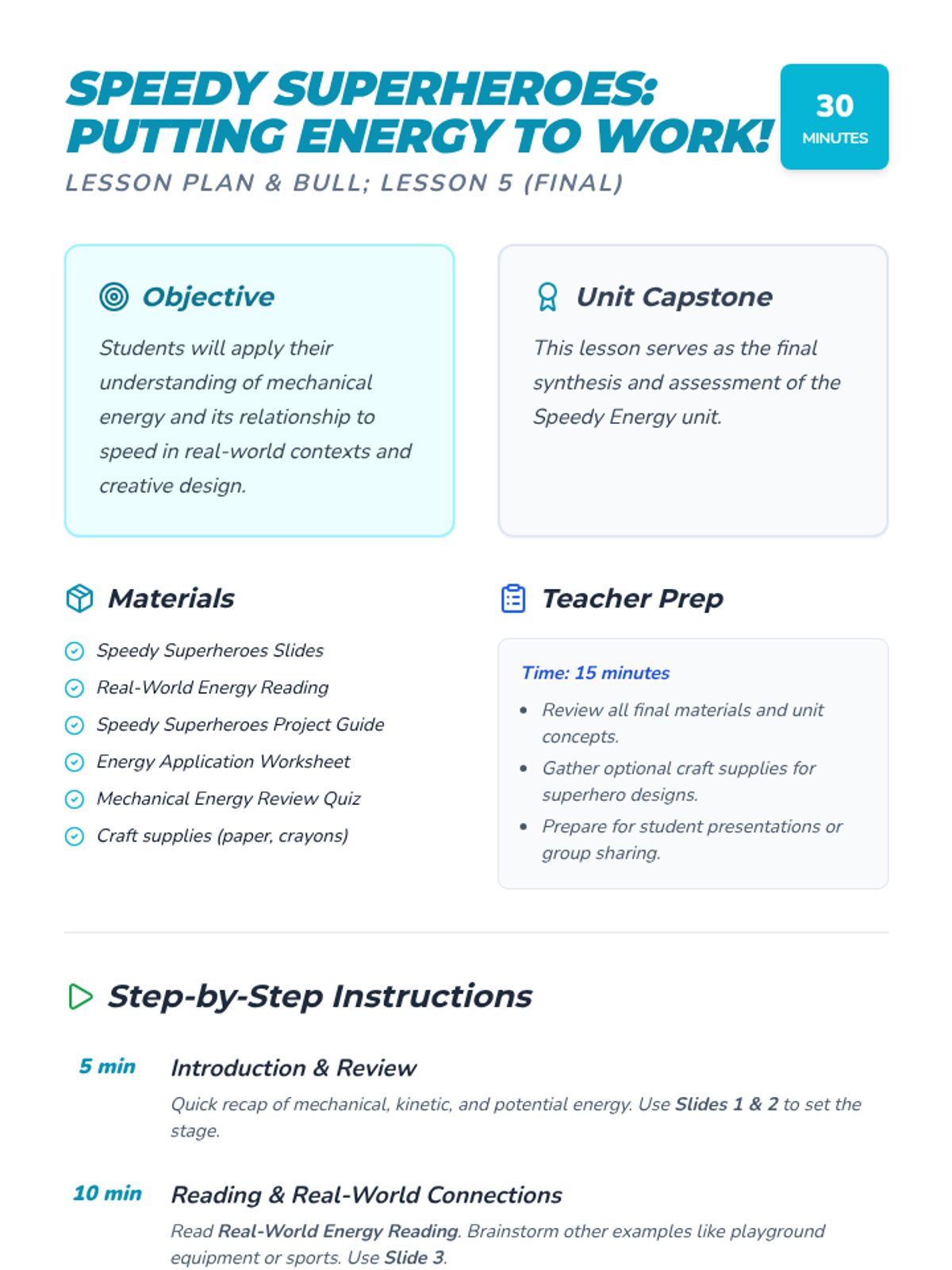 A 5-day unit for 3rd graders exploring the relationship between speed and mechanical energy through hands-on experiments, creative projects, and interactive lessons.