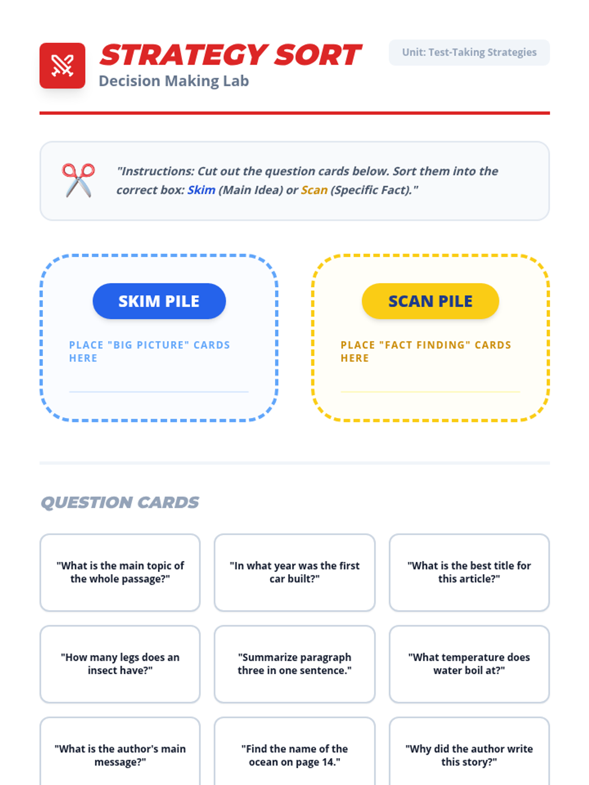 A comprehensive sequence for 4th Grade ESL students to master test-taking logic. Students learn the Process of Elimination (POE), identify extreme language red flags, categorize common distractor types, and evaluate the 'best' vs. 'correct' answers, culminating in a creative workshop where they design their own distractors.