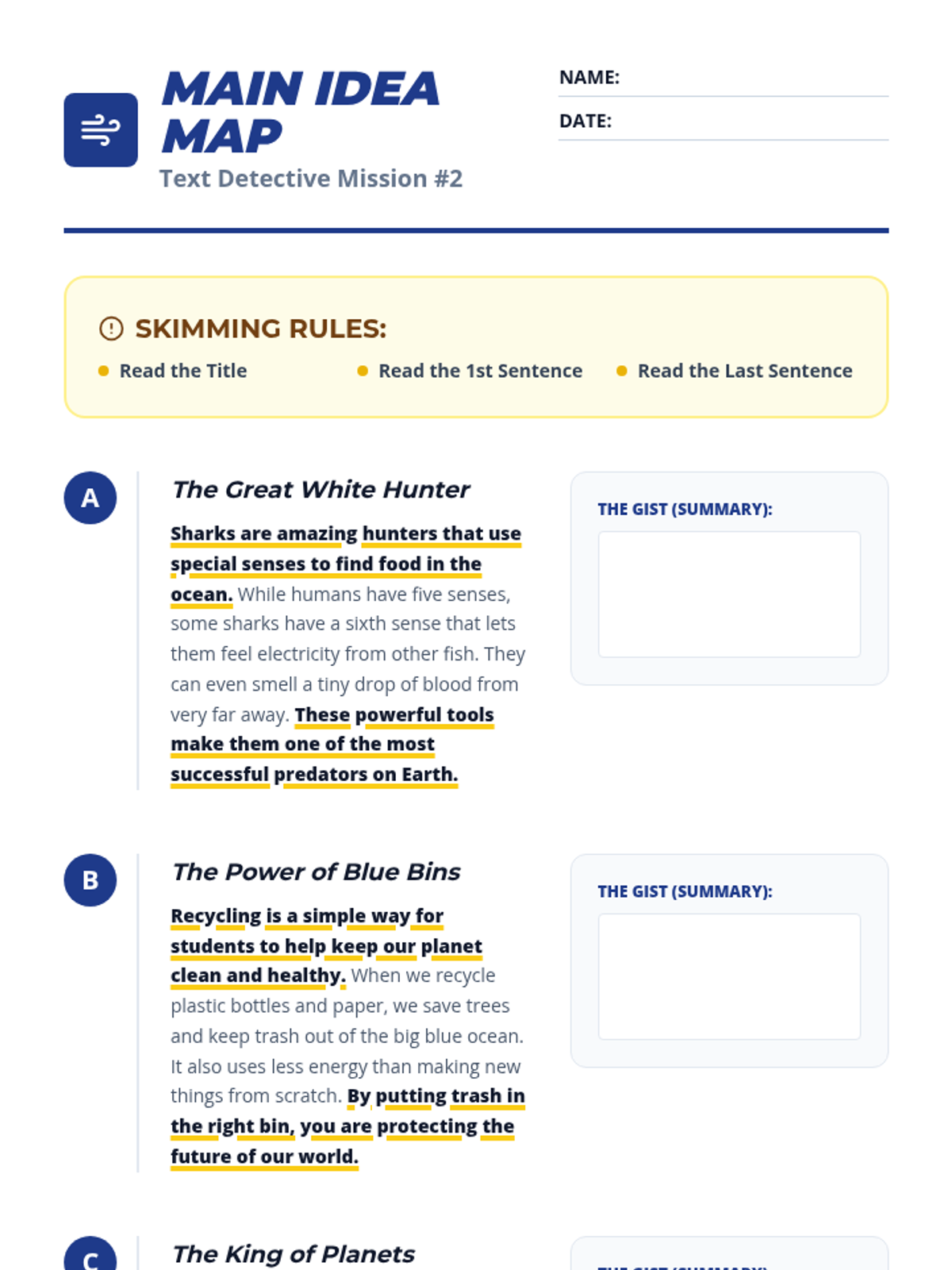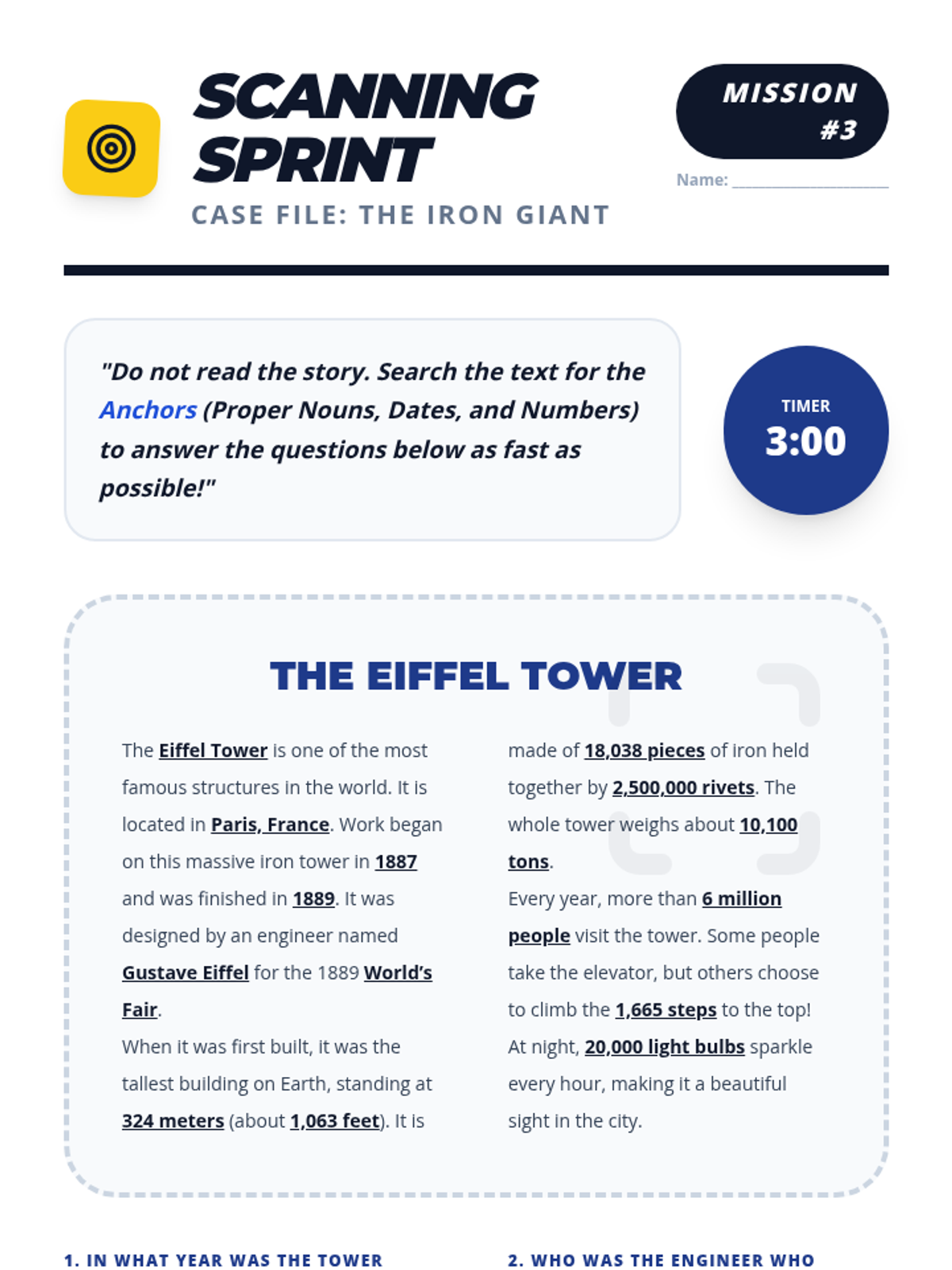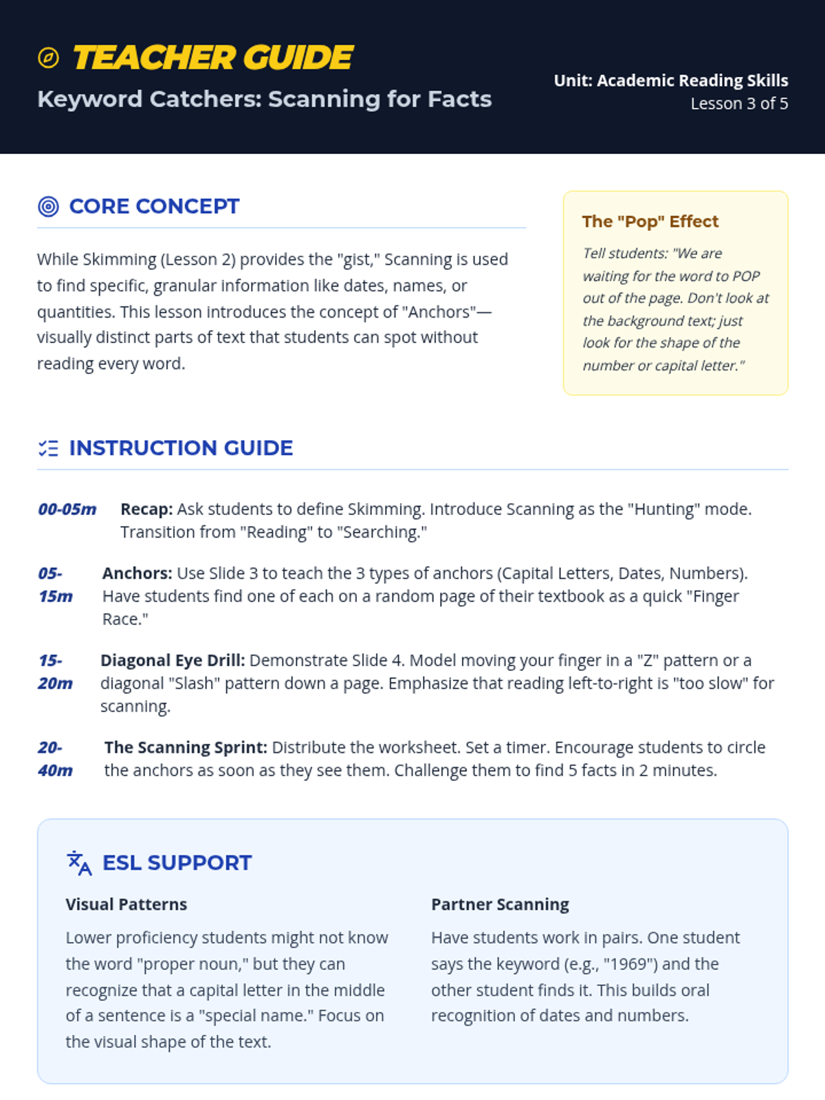 A 4th-grade ESL sequence focusing on academic reading efficiency through skimming for main ideas and scanning for specific details, using a 'Text Detective' theme.