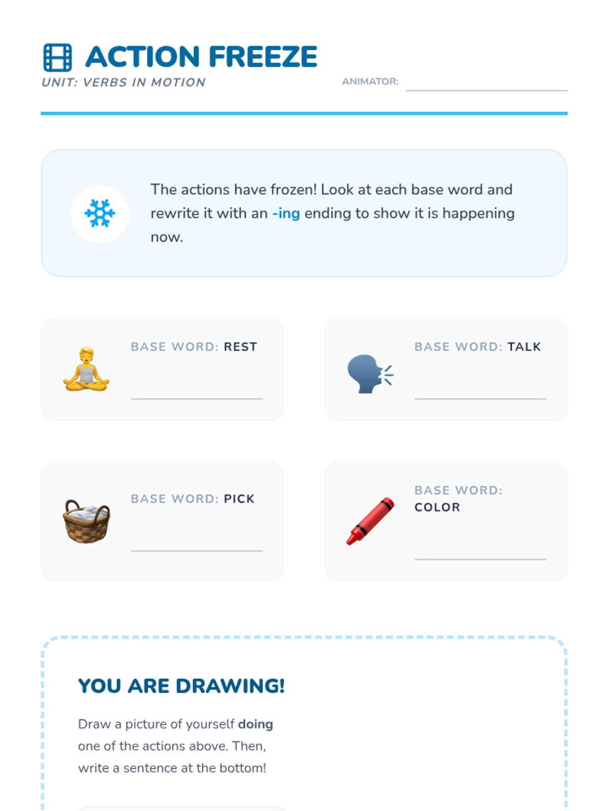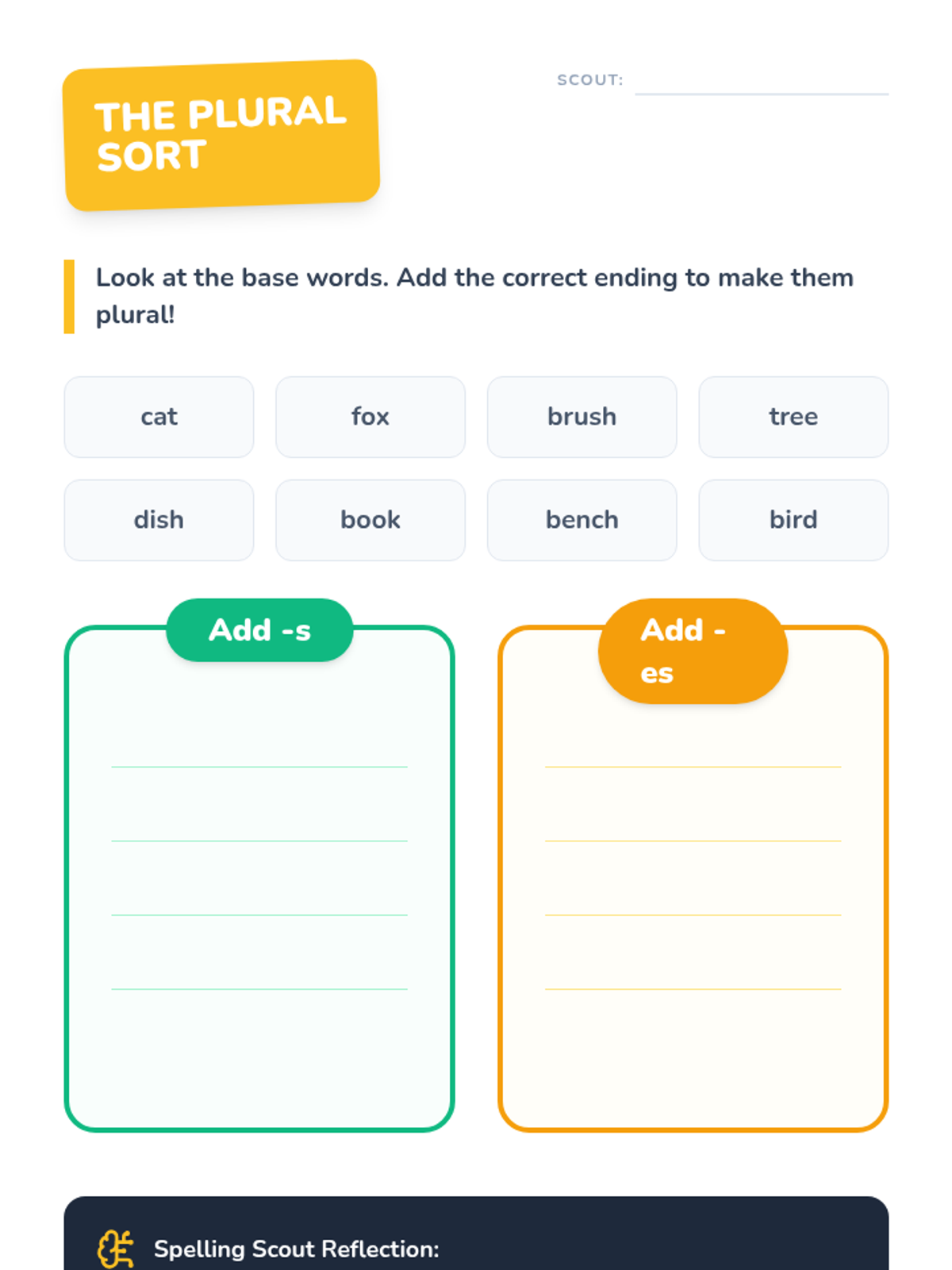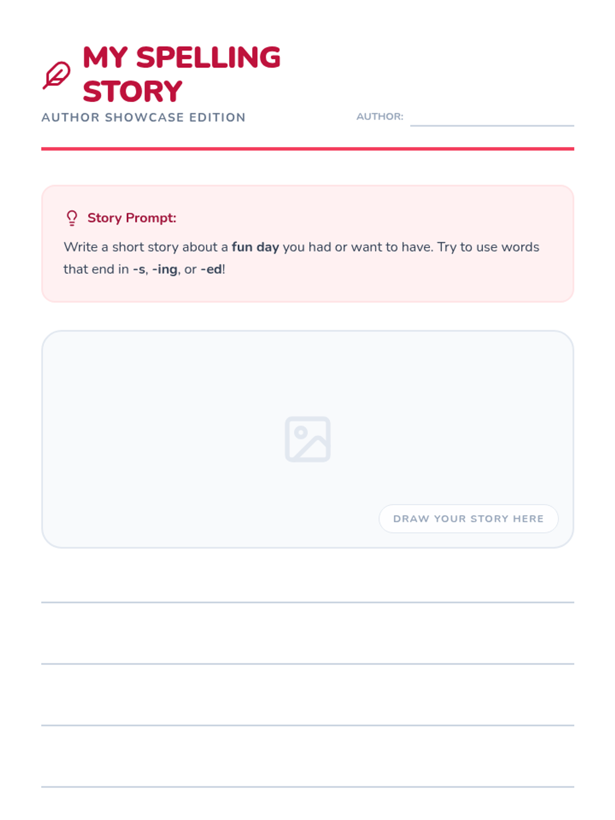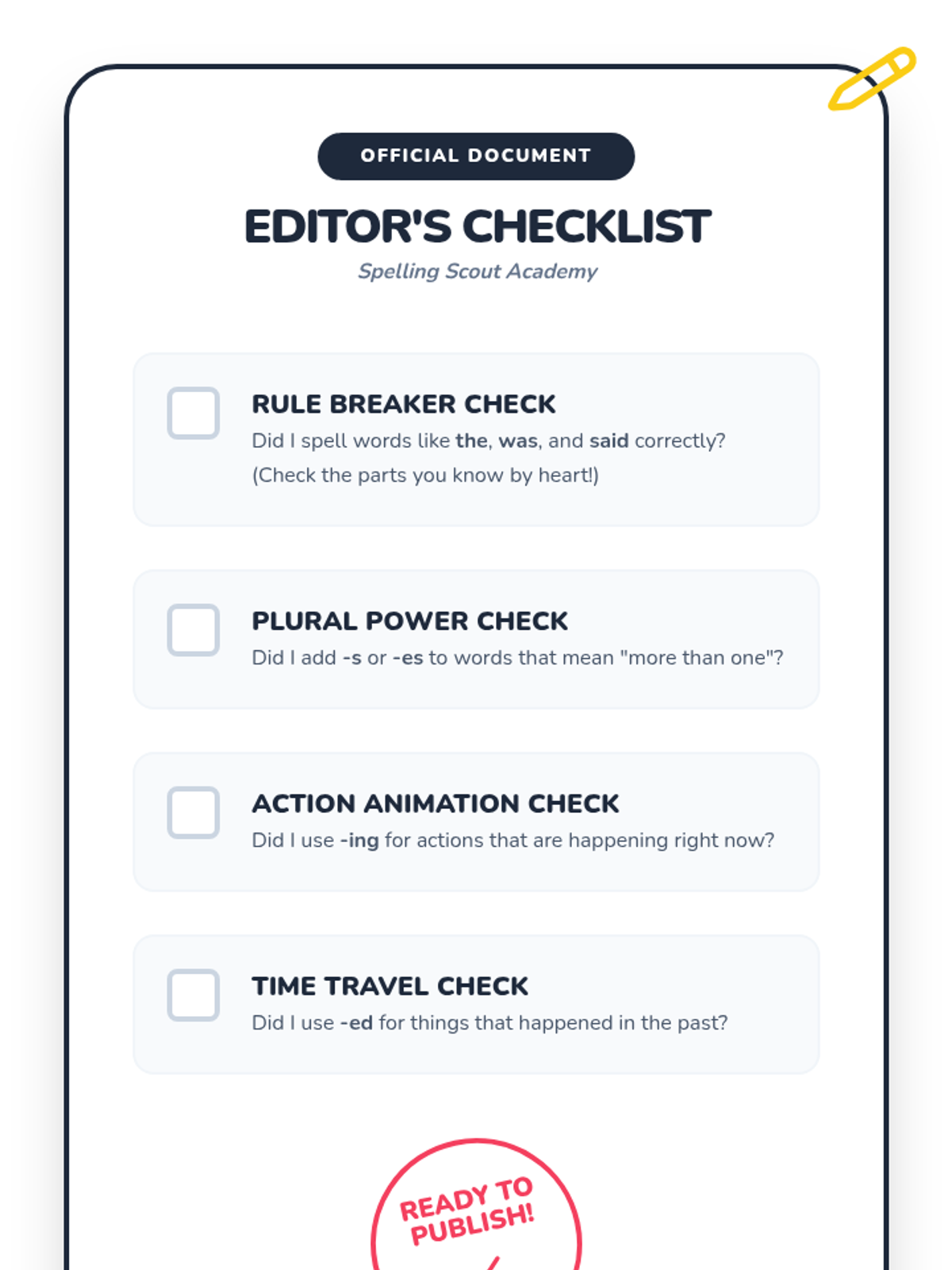 A comprehensive first-grade spelling sequence focusing on high-frequency irregular 'sight words' and essential inflectional endings (-s, -es, -ing, -ed). Students use a 'Word Detective' theme to investigate spelling patterns and apply them in creative writing tasks.