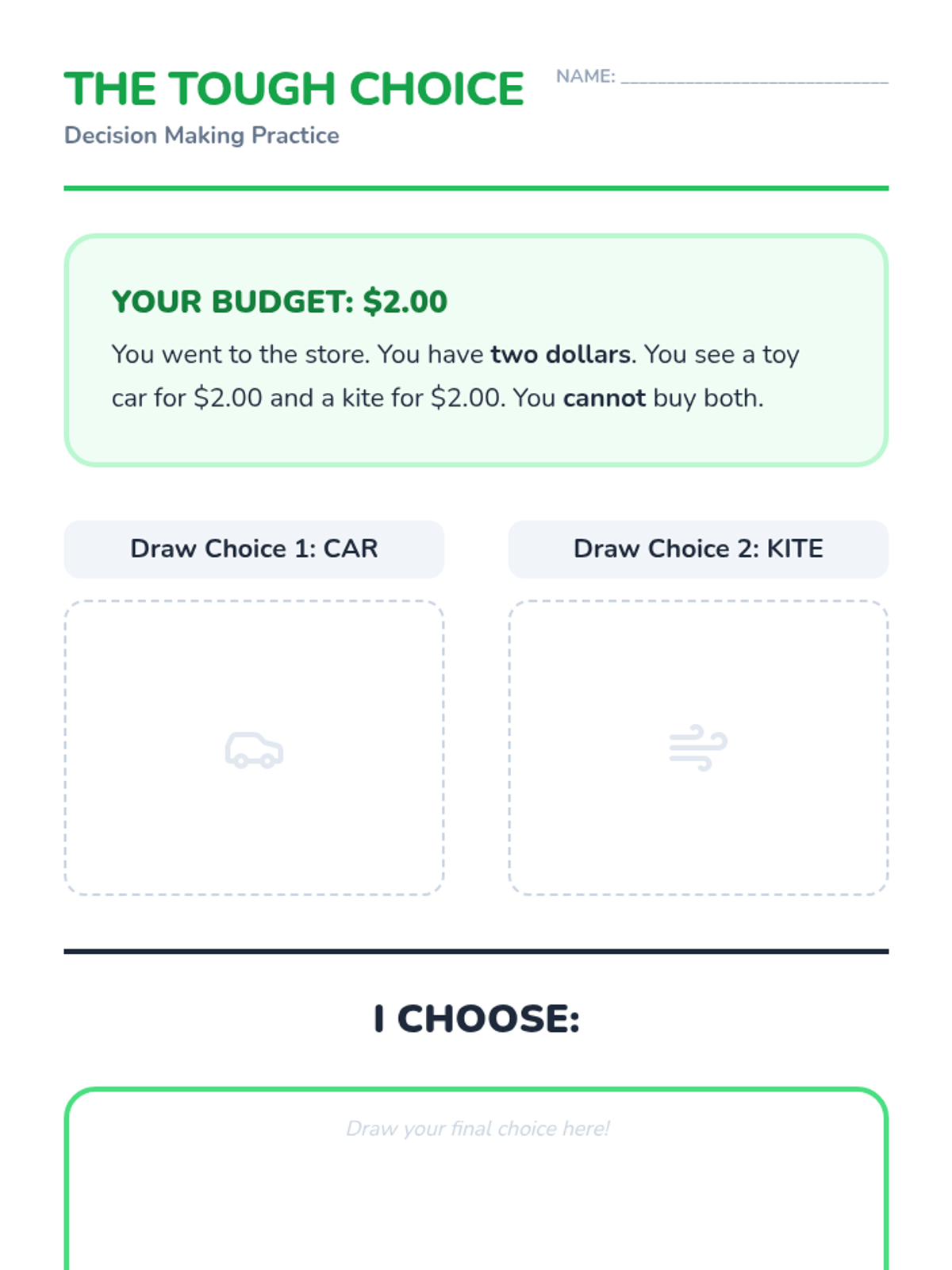 A Kindergarten sequence introducing the economic concepts of choices and opportunity cost. Students learn that choosing one thing means giving up another through games, stories, and reflection.