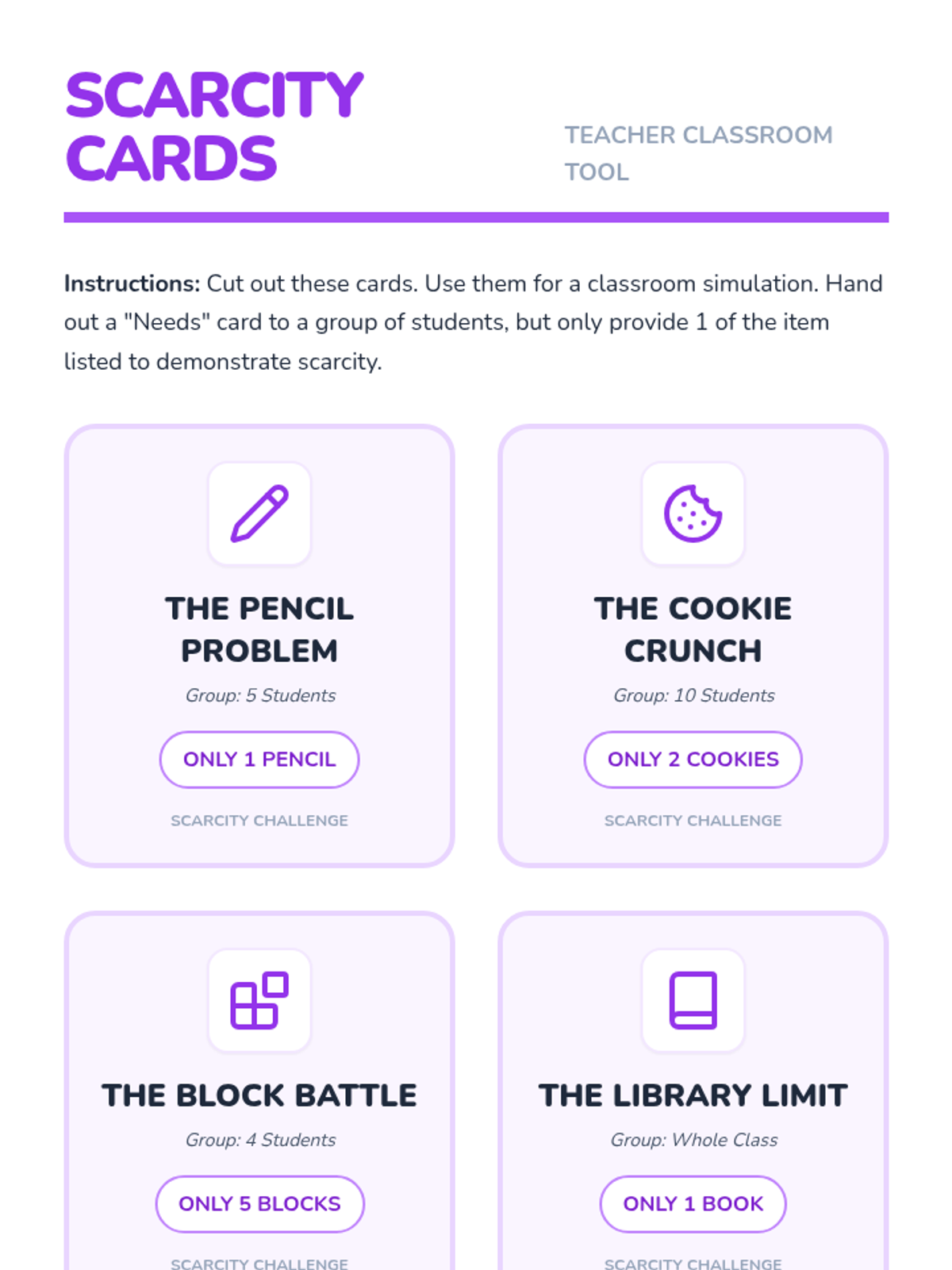 This sequence introduces Kindergarten students to foundational economic concepts through concrete experiences. Students explore the difference between needs and wants, encounter scarcity through a limited resource simulation, practice decision-making with trade-offs, and participate in a classroom market using earned tokens.