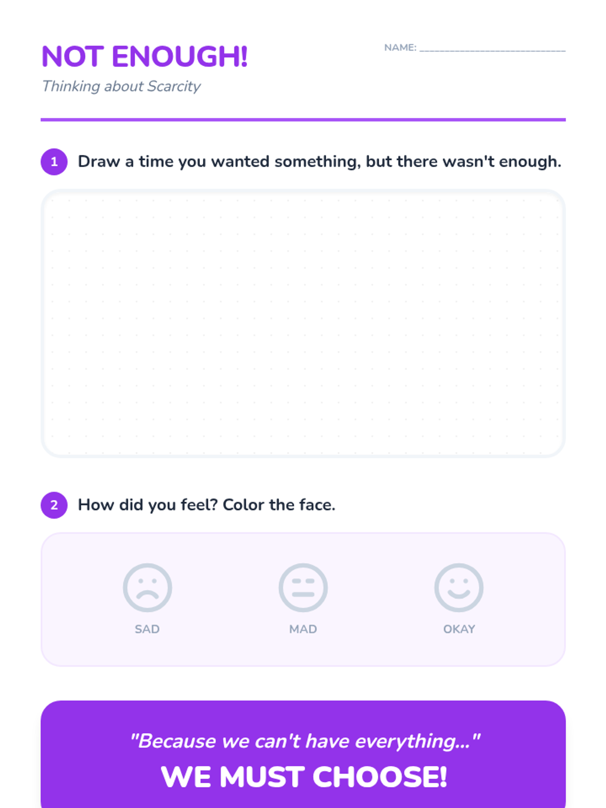 A foundational sequence for Kindergarten students exploring needs versus wants, scarcity, and decision-making through interactive games and hands-on simulations. Students learn that resources are limited and making a choice involves giving something else up, building early financial literacy.