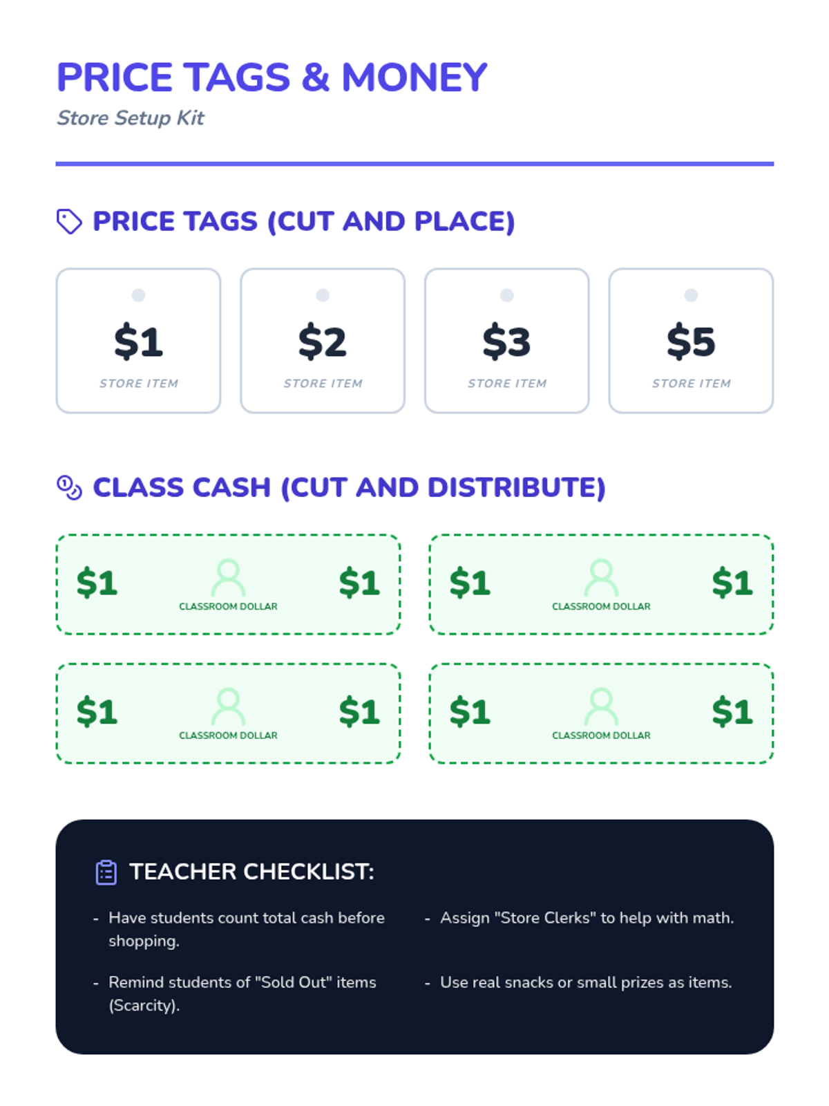 This Kindergarten sequence introduces the foundational economic concept of distinguishing between essential needs and discretionary wants through interactive discussions, sorting activities, and simple budgeting simulations. Students move from identifying survival items to making prioritized choices, building a baseline for financial literacy.